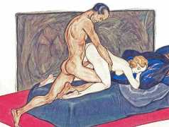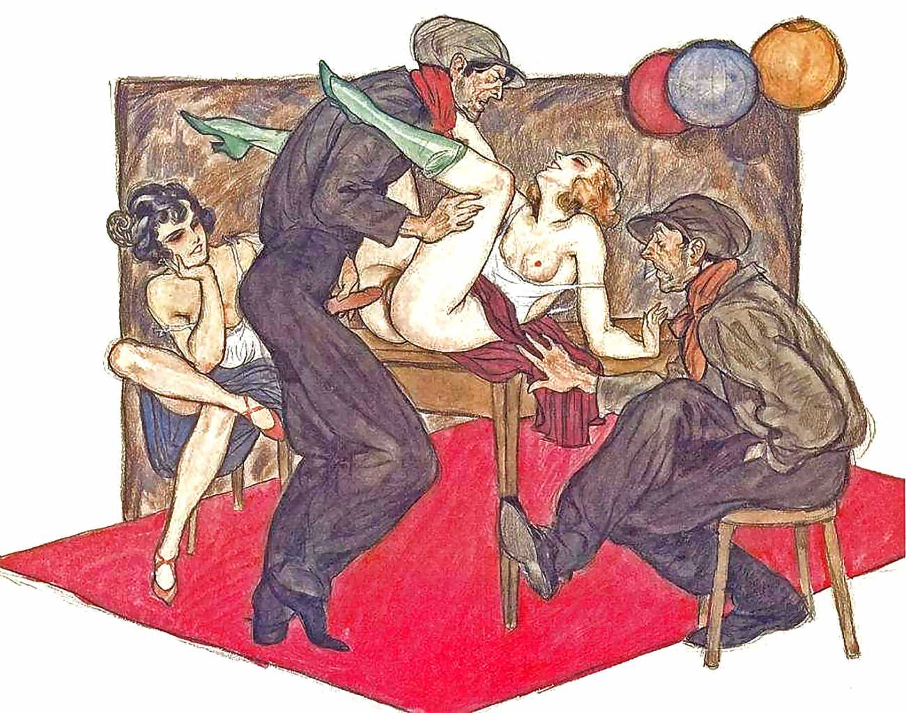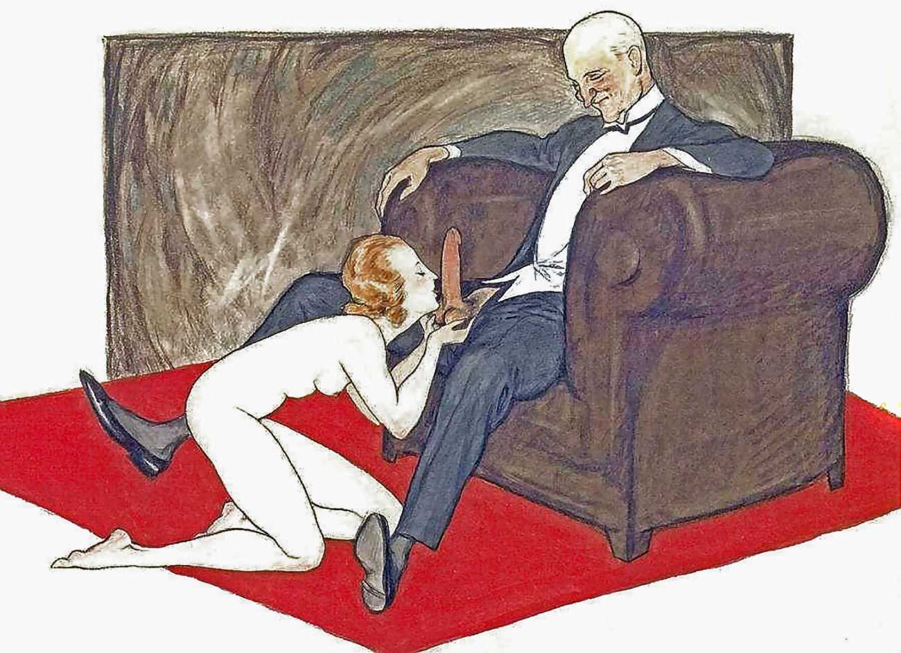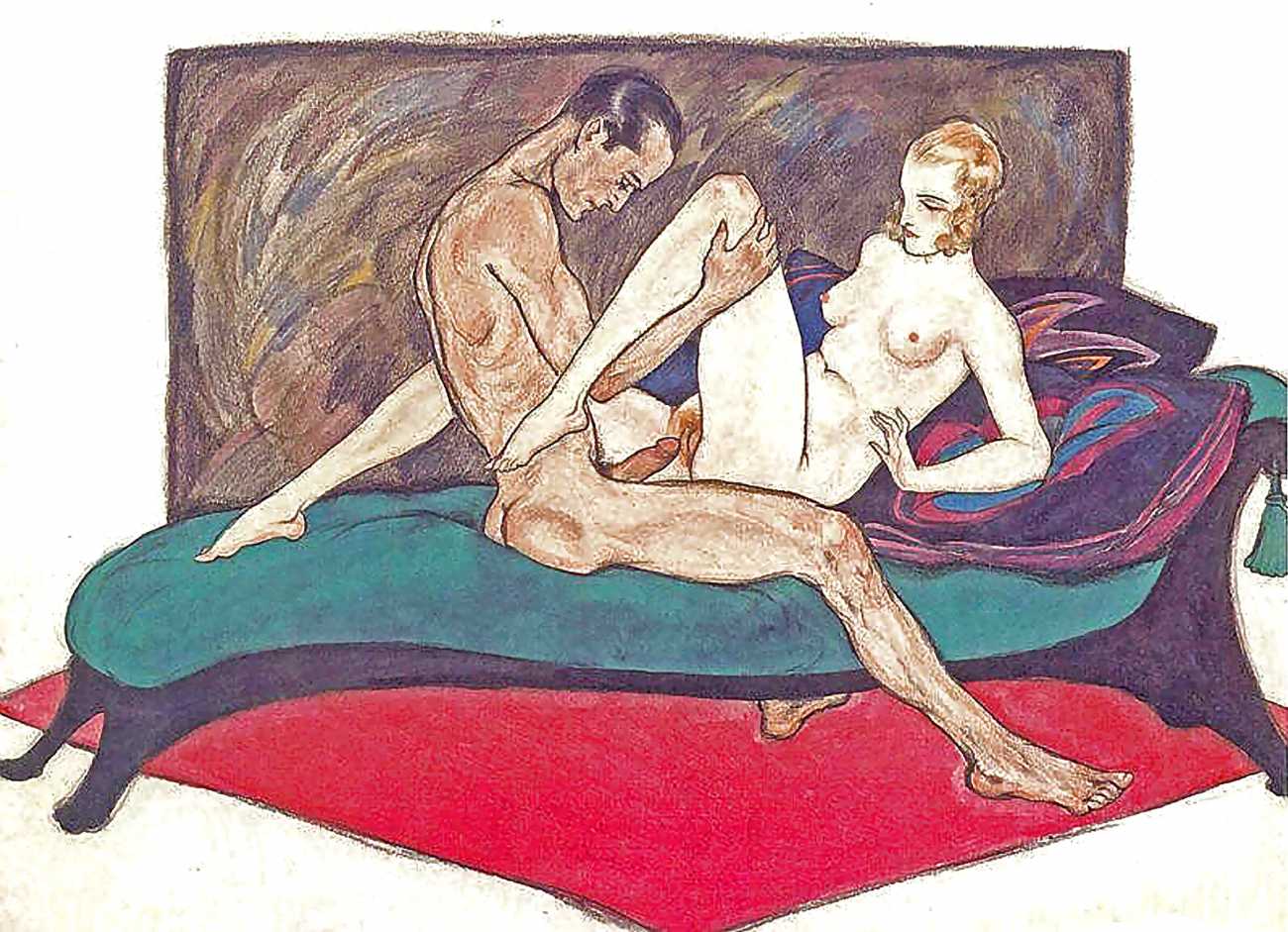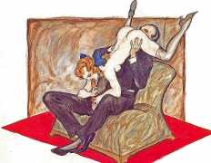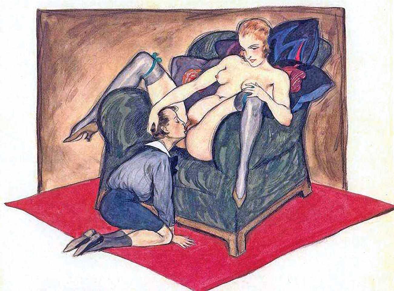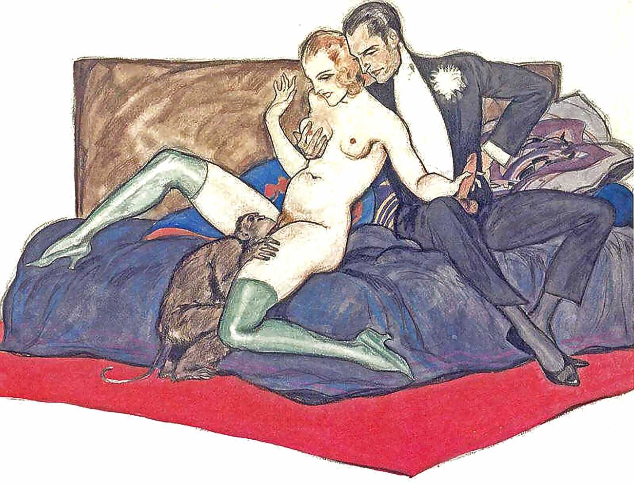 Though appearing in 1995, the images clearly bear every sign of having been produced much earlier. In relation to Dudovich’s known work from the 1940s and 50s, they share many characteristics with his drawings from that period, so if the Tappeto Rosso sequence is by Dudovich then they probably date from the late 40s. Each of the twelve scenes takes place in a space framed by the carpet, and most of them also feature the large dark brown bedhead, lending a uniformity to this accomplished portfolio.