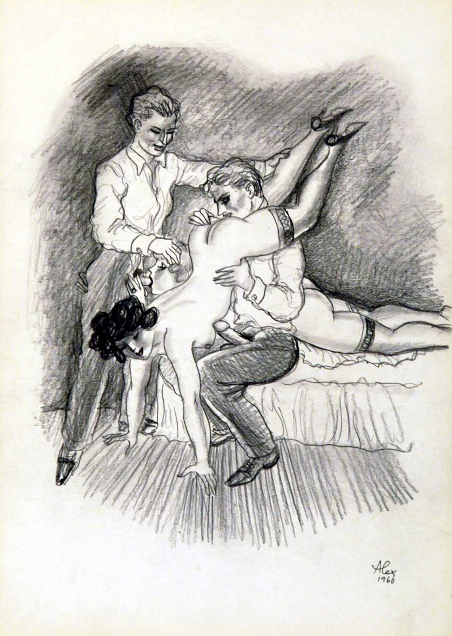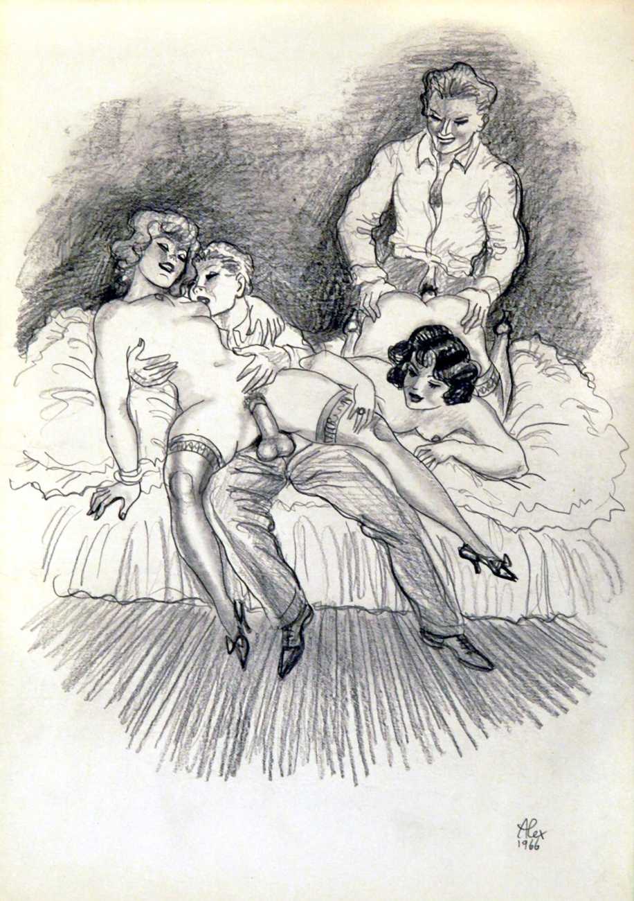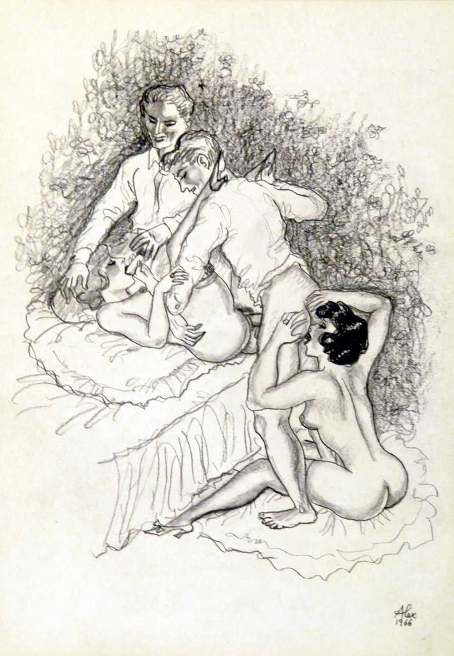 Erotikus jelenet (Erotic Scenes) is a generic title that Szekély used for several similar portfolios from 1958 onwards, all trademark pencil drawings featuring group sex of a fairly predictable (though rarely experienced in the purchasers’ real worlds) kind. This set dates from 1966, and may well have followed a client brief for particular scenes from earlier portfolios.