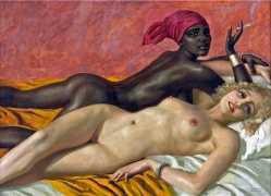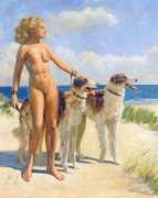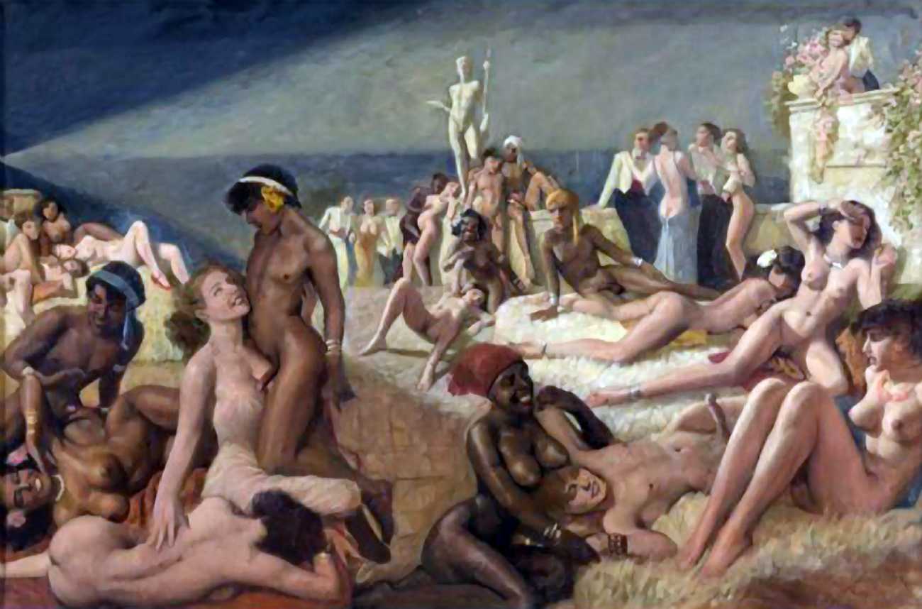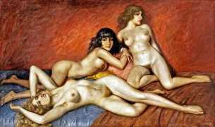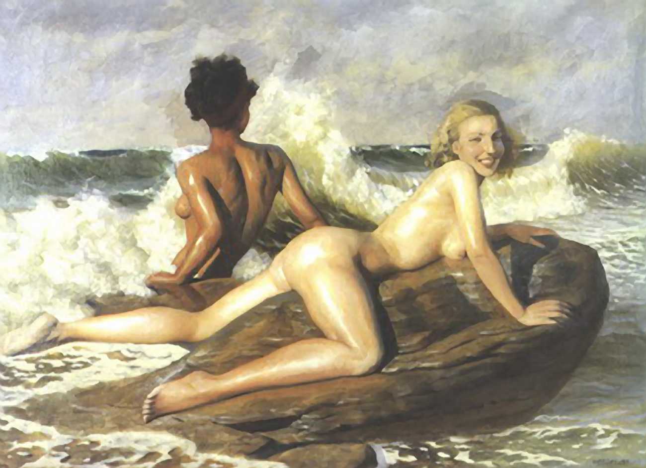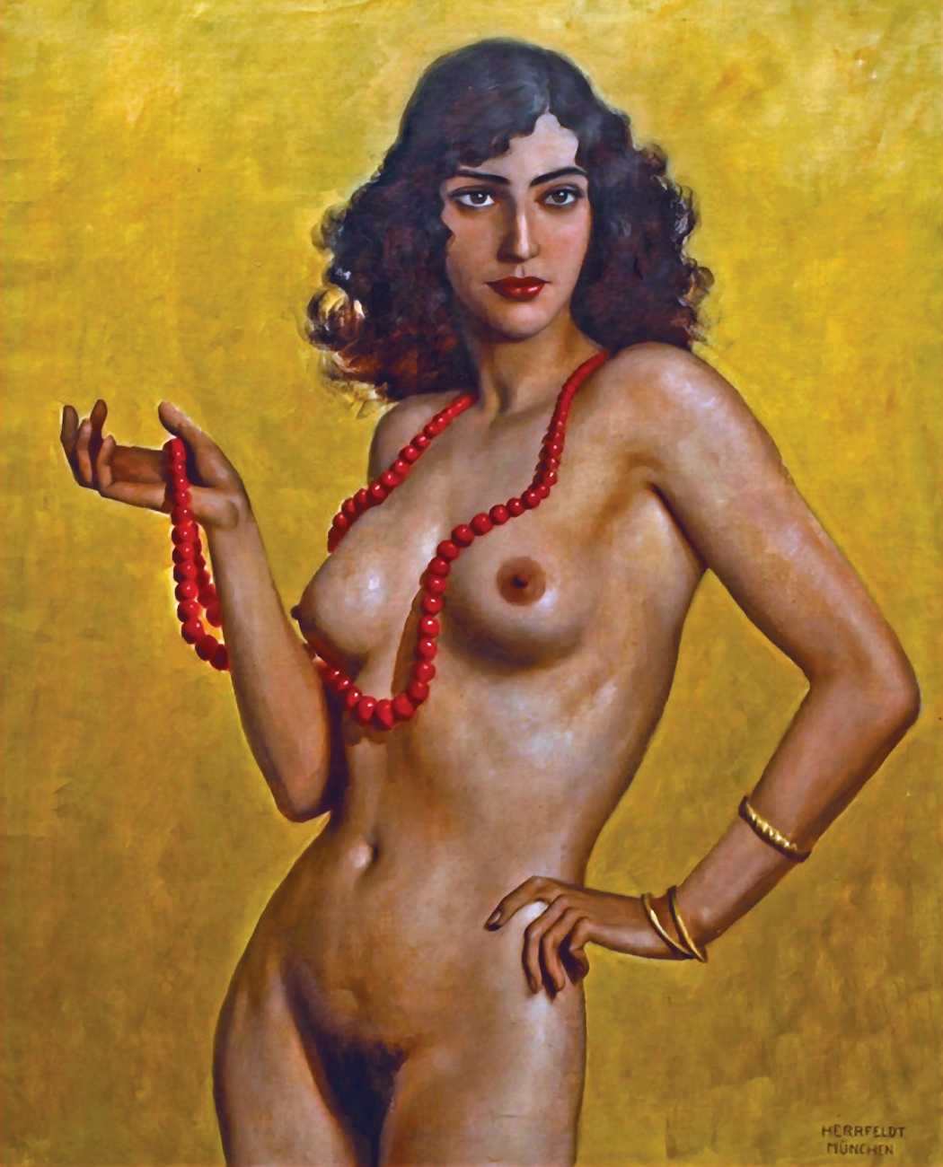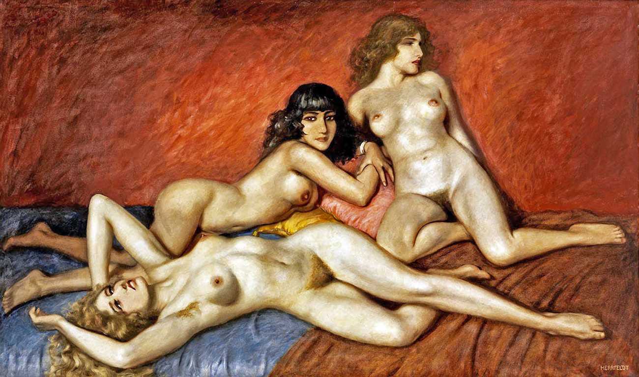 We could have included any number of large von Herrfeldt canvases of naked women in this section, but you can search the internet just as well as we can and build your own gallery if you find his paintings appealing. Rather than quantity we have opted for variety, so in addition to a few ‘standard beauties’ we offer you a walk on the beach with the dogs, some lesbian allusions, a rare male couple on the rocks, and one of Herrfeldt’s most complex paintings featuring human flesh, a classical scene painted around 1925.
