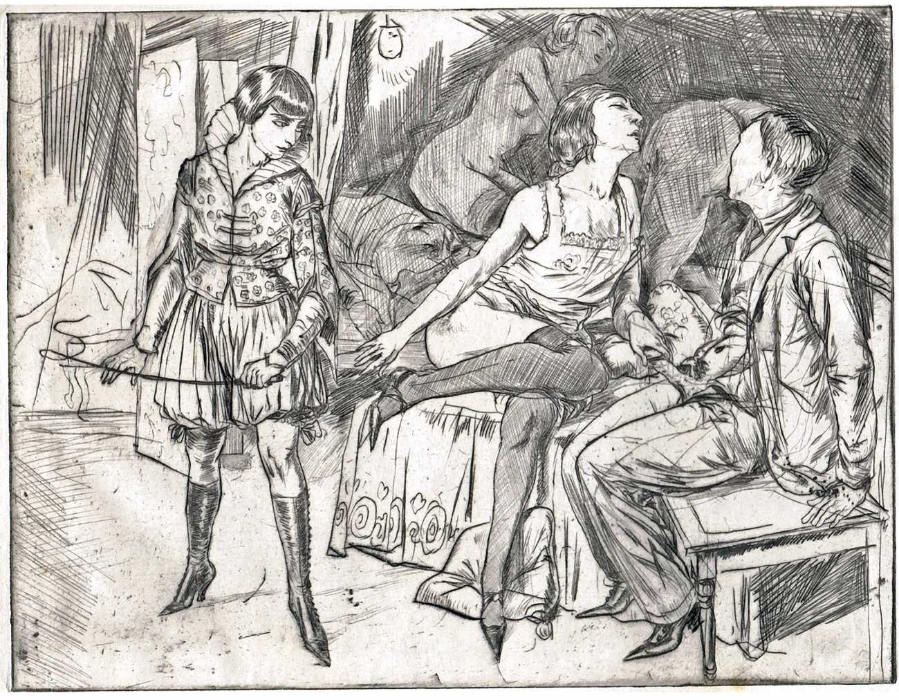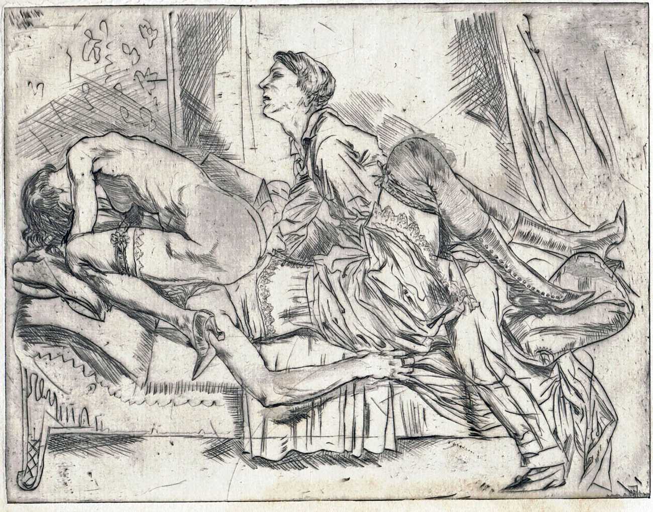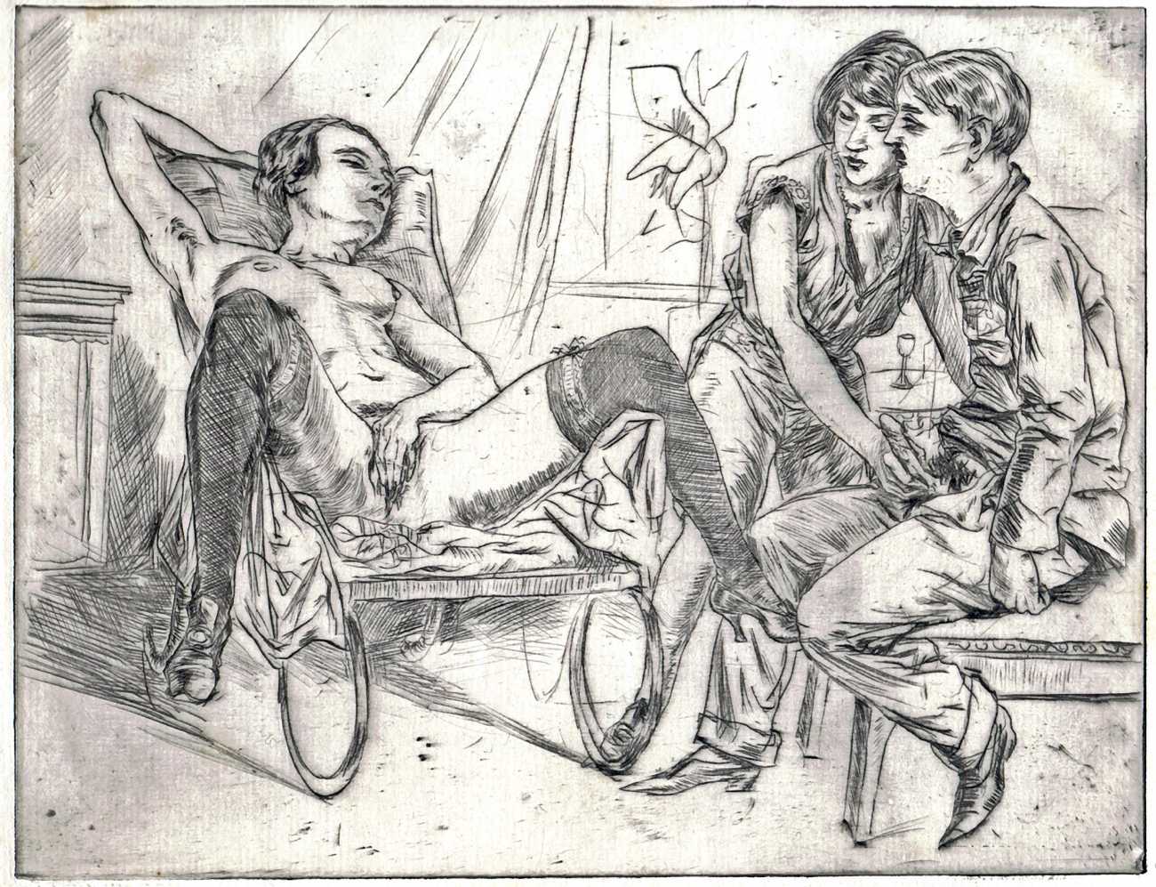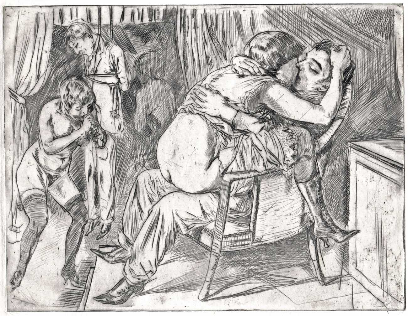 Rudolf Schlichter first produced erotic drawings in his early twenties, already displaying a penchant for an element of sado-masochism in his questioning of sexual power. It was a theme that he would return to regularly, especially in his prints and drawings from the early 1920s.
