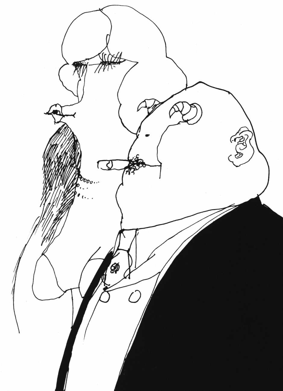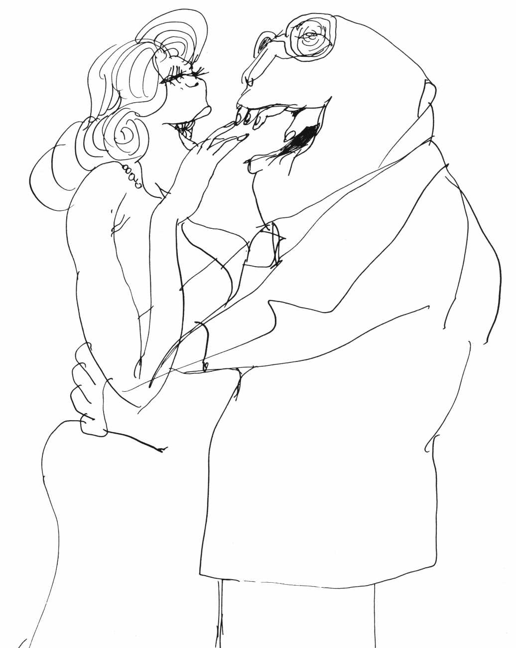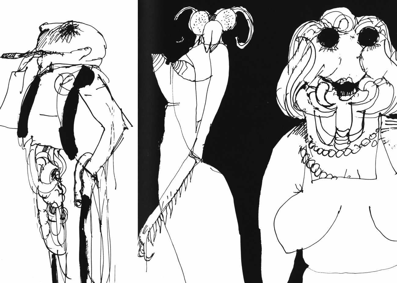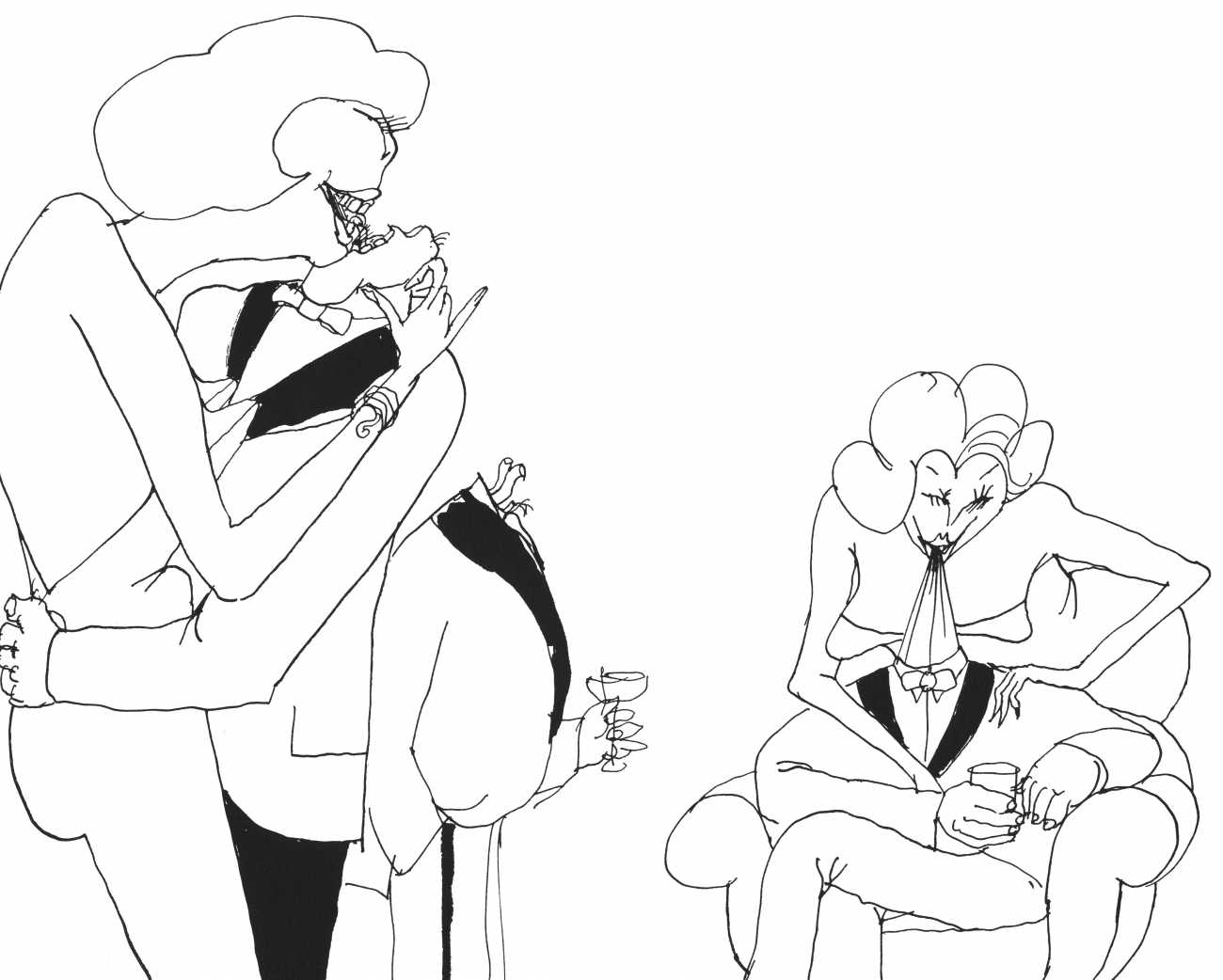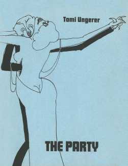 By 1966 Tomi Ungerer had been living in New York for nearly a decade, finding artistic and commercial success but at the same time becoming increasingly cynical about the social expectations that came with that success. For some time he had been drawing the high society ‘types’ he met at parties where he was expected to know how to socialise, and when he had enough to make a book he self-published The Party in a very small edition under the ‘Paragraphic’ imprint, mostly for his similarly critically-minded friends. Each of the drawings was matched with a barbed witty caption – ‘Miss Millie Follicle, heiress to the Spanflex fortune’, and ‘Mr Roy Fumblethumb entertaining Mrs Joyce Rampage’. Sexual innuendo is rife, and as the night progresses various body parts start slipping from the revellers’ elegant attire.