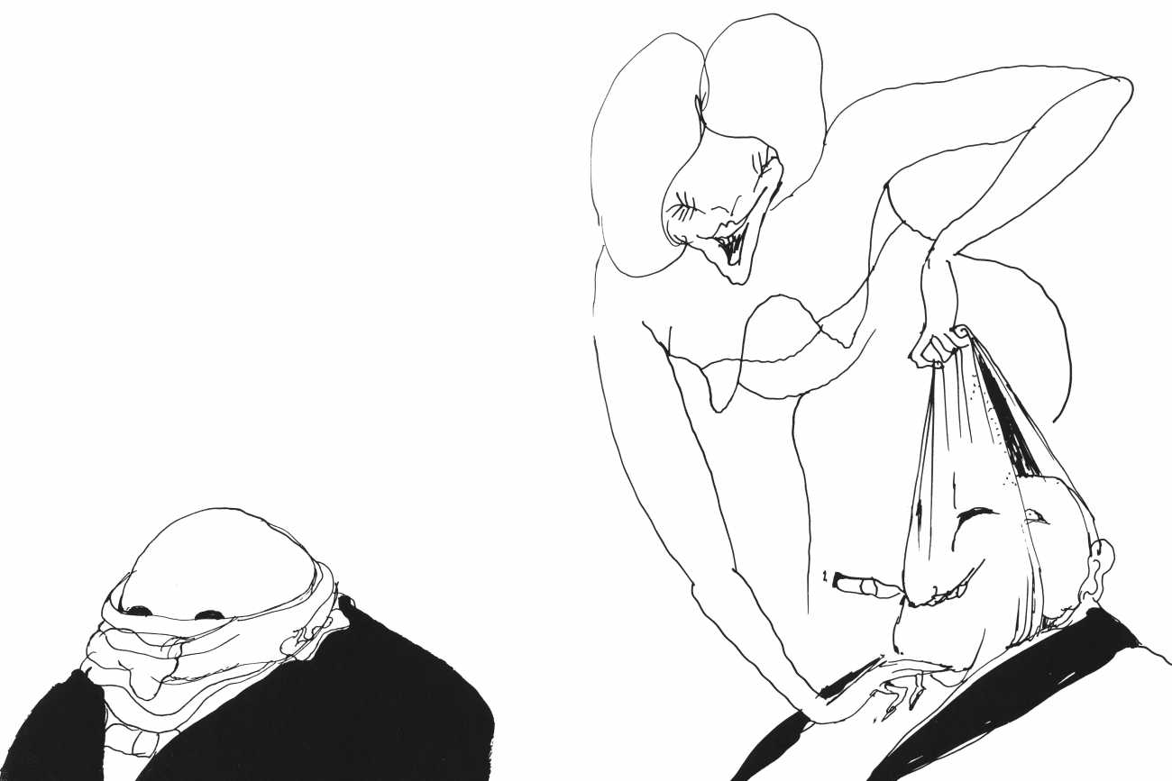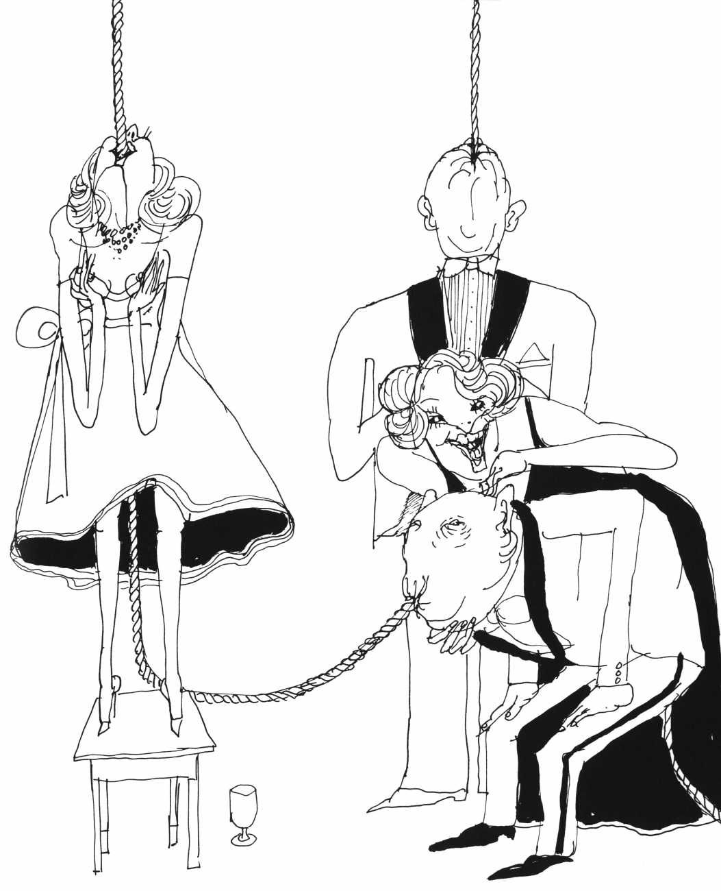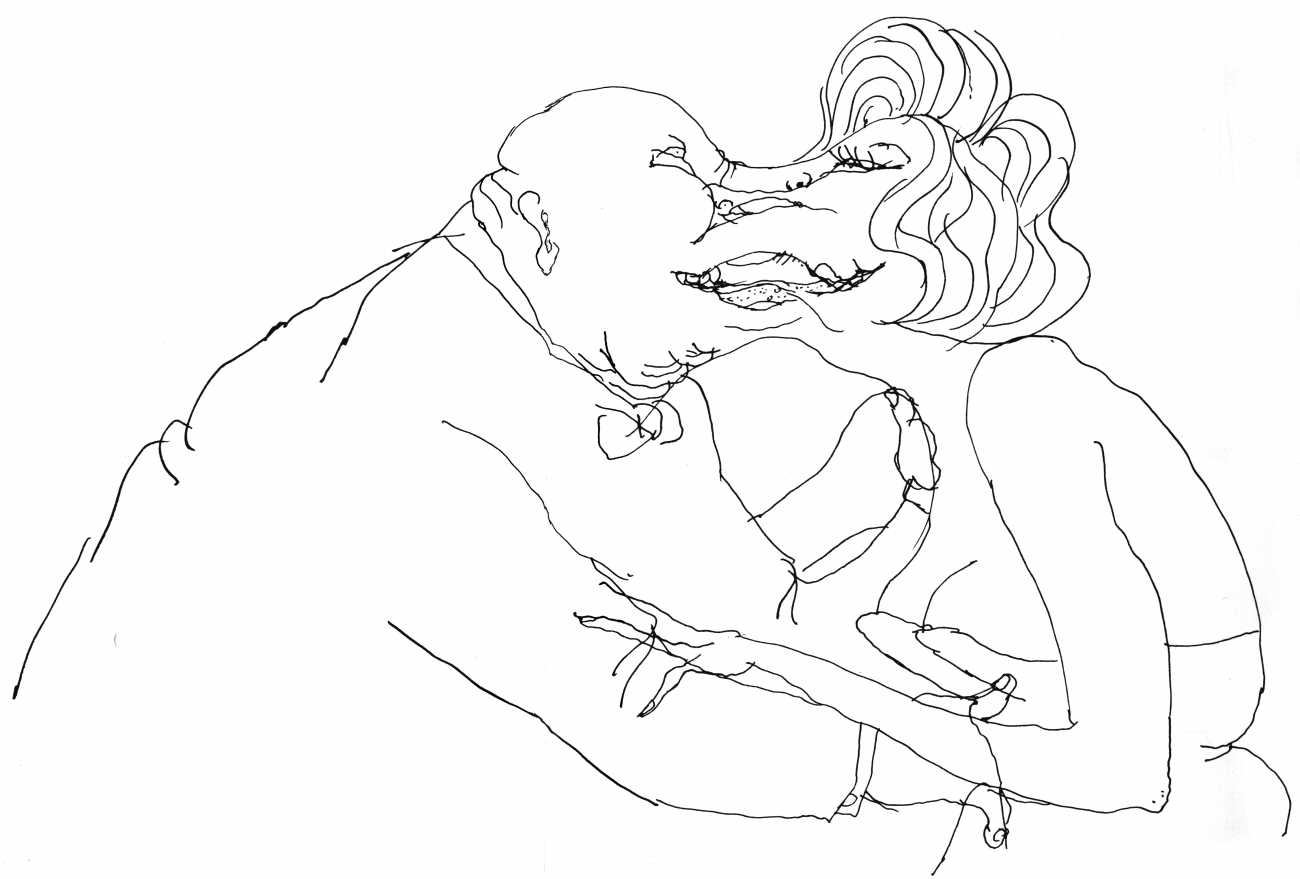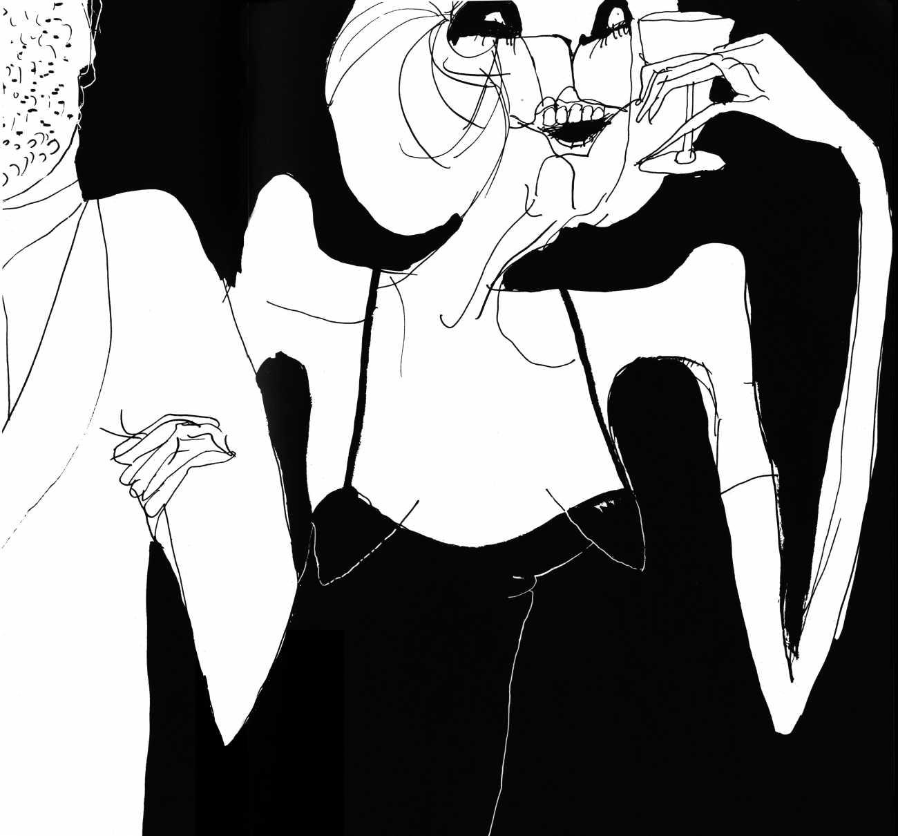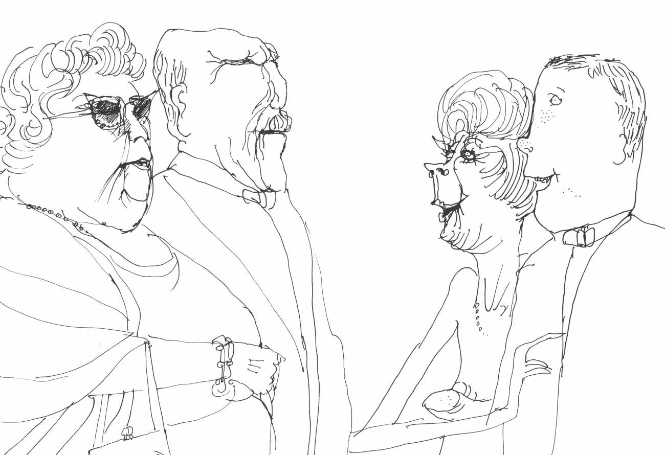 By 1966 Tomi Ungerer had been living in New York for nearly a decade, finding artistic and commercial success but at the same time becoming increasingly cynical about the social expectations that came with that success. For some time he had been drawing the high society ‘types’ he met at parties where he was expected to know how to socialise, and when he had enough to make a book he self-published The Party in a very small edition under the ‘Paragraphic’ imprint, mostly for his similarly critically-minded friends. Each of the drawings was matched with a barbed witty caption – ‘Miss Millie Follicle, heiress to the Spanflex fortune’, and ‘Mr Roy Fumblethumb entertaining Mrs Joyce Rampage’. Sexual innuendo is rife, and as the night progresses various body parts start slipping from the revellers’ elegant attire.