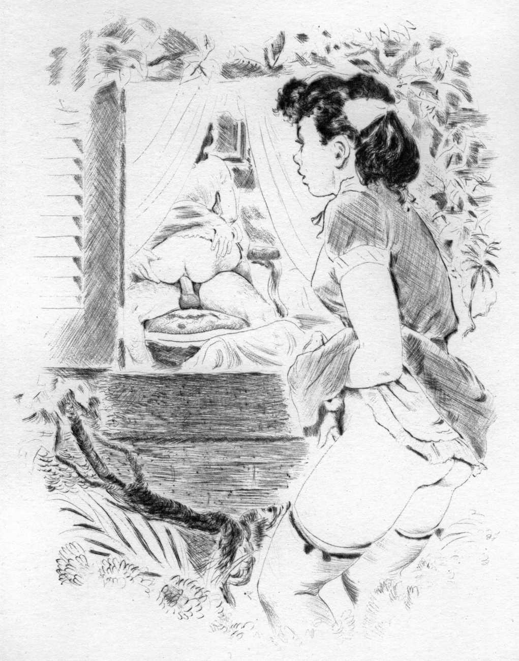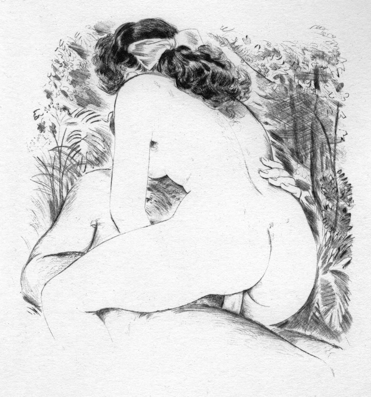 No other edition of Nous deux appeared until this 1956 Éditions du Cyclamen publication, accompanied by sixteen delicate drypoints by Gaston de Sainte-Croix, beautifully printed by Georges Viglino. The prints show a side of Sainte-Croix’s skills not seen anywhere other than here and in his illustrations produced a year later for Clayton’s College. They bear a close relationship with Jean Dulac’s later work, especially his Trente et quelques attitudes of 1952, so much so that Dulac’s prints may well have been a direct inspiration.