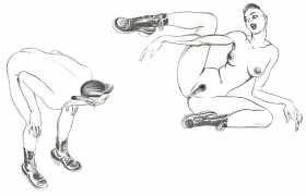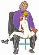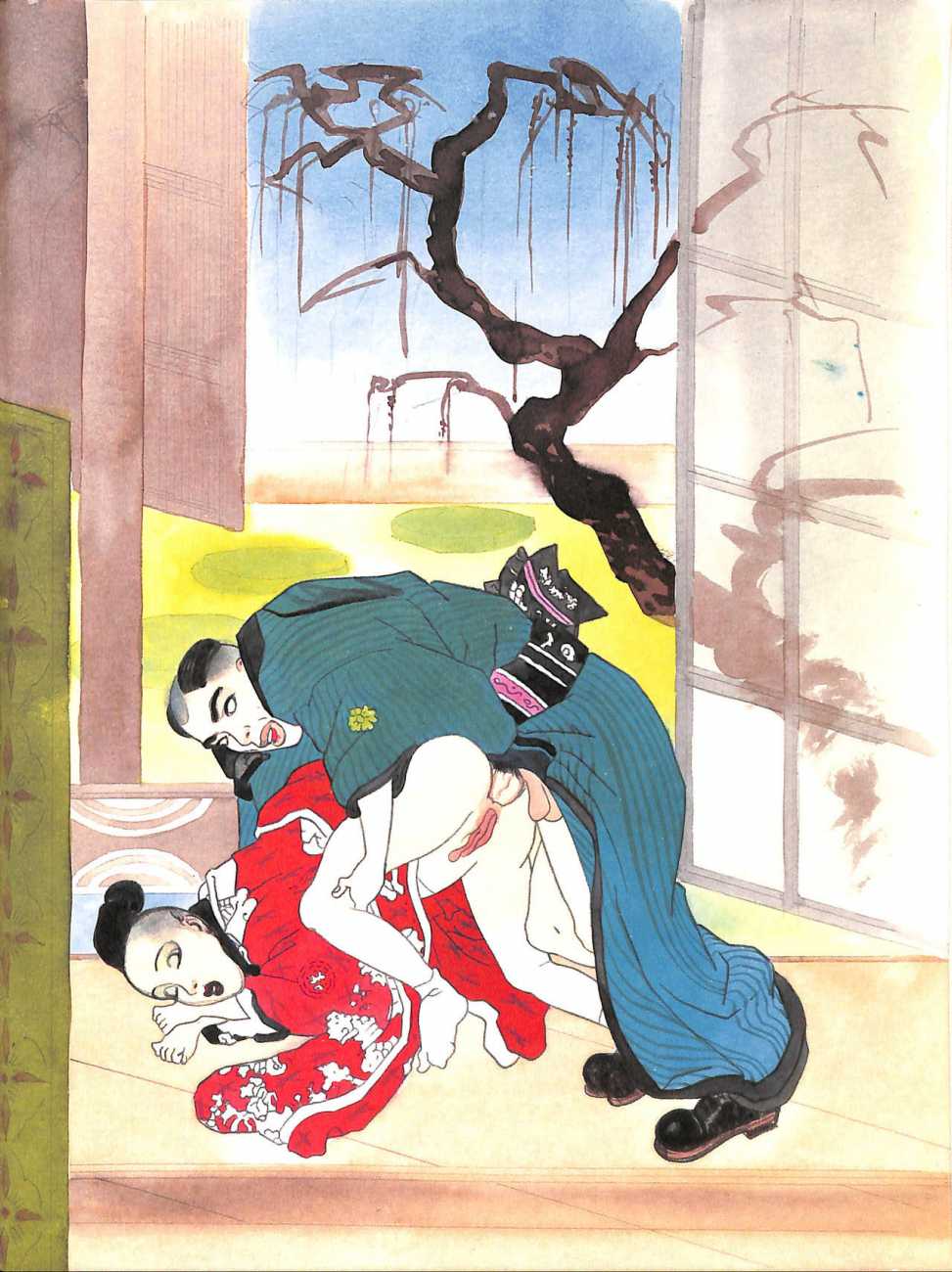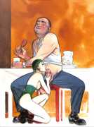 Apart from the Rojanesque uncle with a naked girl on his knee (illustrating ‘Hôtel-Restaurant’), the Japanese couple (‘Conseil’), and the breakfast-time blow-job (‘La prime’), all the illustrations feature the same three characters, two women and one man, enjoying a range of activities from solo sex with bananas to some exciting threesomes. Big boots are a unifying theme.