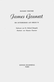 James Grunert, ein Sittenroman aus Berlin W (A Moral Tale from West Berlin) was first published privately in Vienna in 1908. It purports to be the frank memoirs of a young man from the finest Berlin banking family, who from boyhood on is besotted by the beautiful bodies of young women. It moves inexorably from childhood experiences of mutual caressing with young female friends to mature sexual awakenings in the salons of West Berlin.