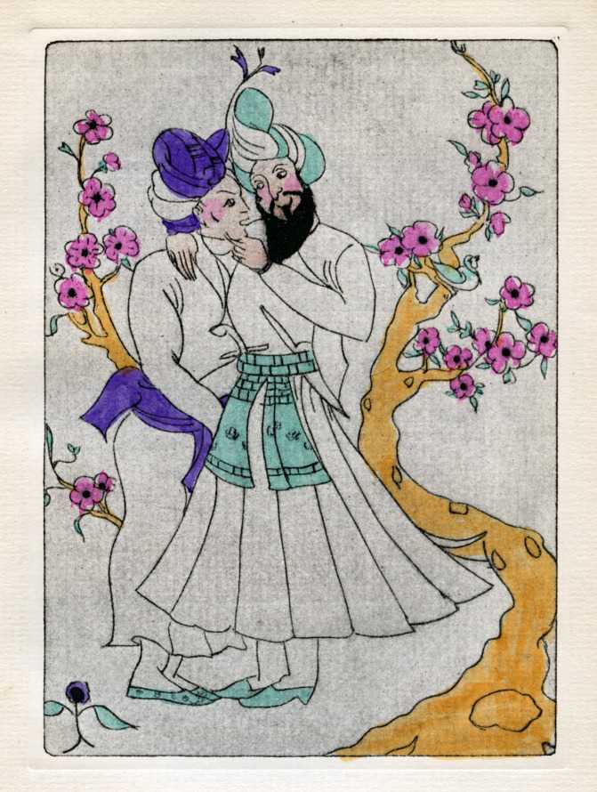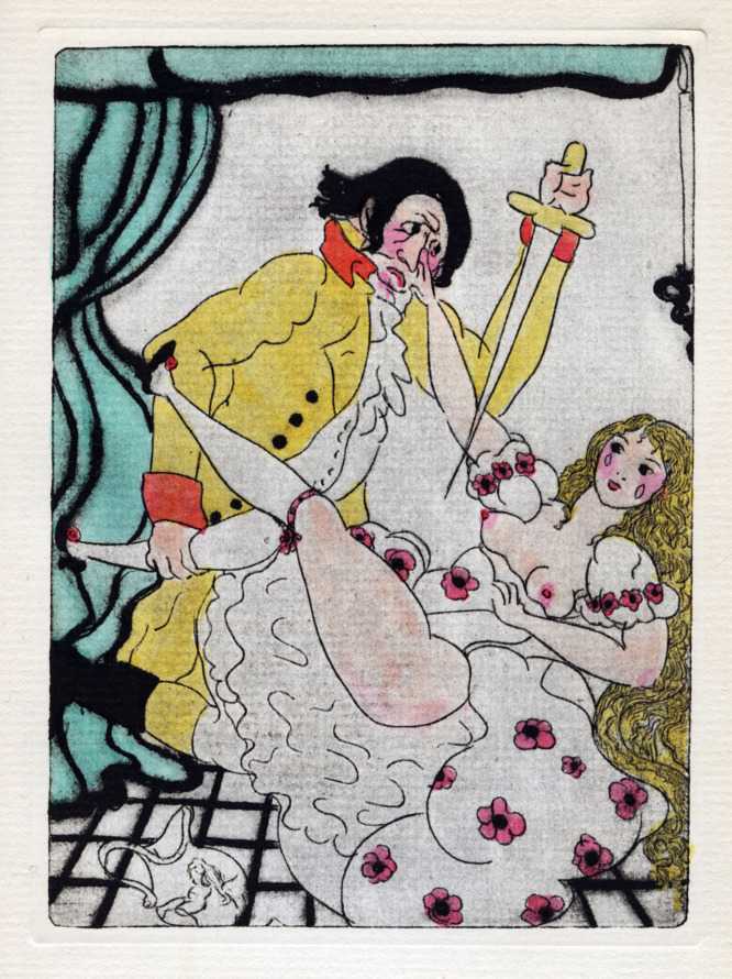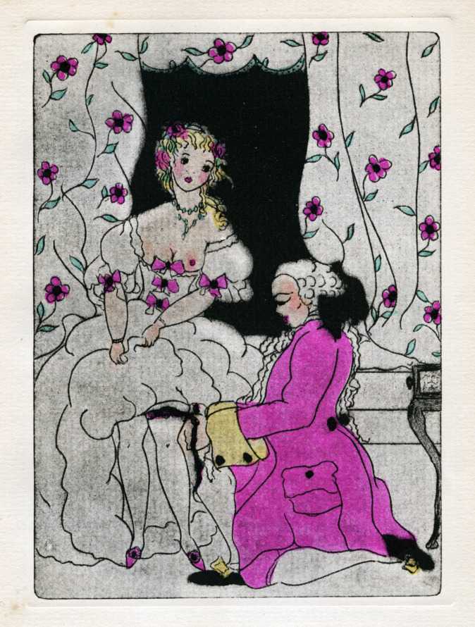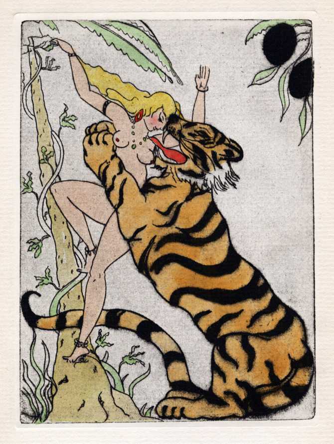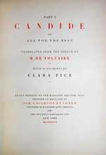 In 1927 The Bennett Libraries commissioned Clara Tice to illustrate a limited de luxe edition of Voltaire’s famous satire Candide, in the original English translation of 1703. Clara clearly enjoyed choosing the scenes from this epic work to illustrate, including Zirza and the tiger as a frontispiece, and the woman who tells Cunégonde how she had a buttock cut off in order to feed some starving men.