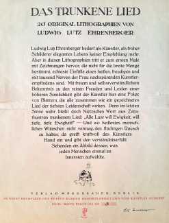 Das trunkene Lied was published by M. Proskauer in a limited, numbered and signed edition of 100 copies. It was banned by the Berlin censors in 1936, but by then the edition was sold out, so maybe the banning was simply to make sure that a copy was retained for the police department’s private cabinet.