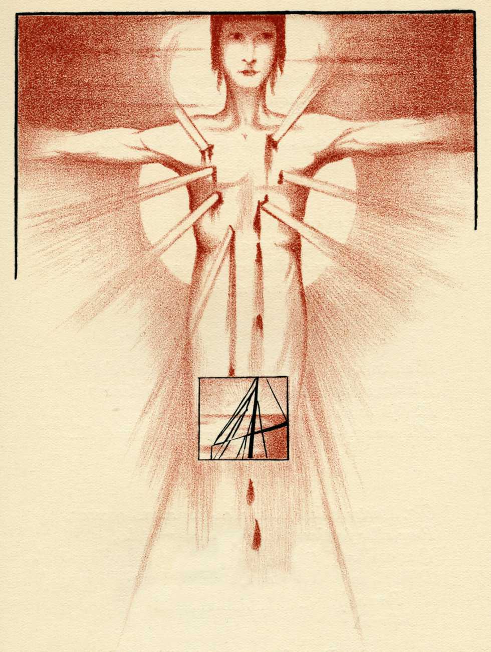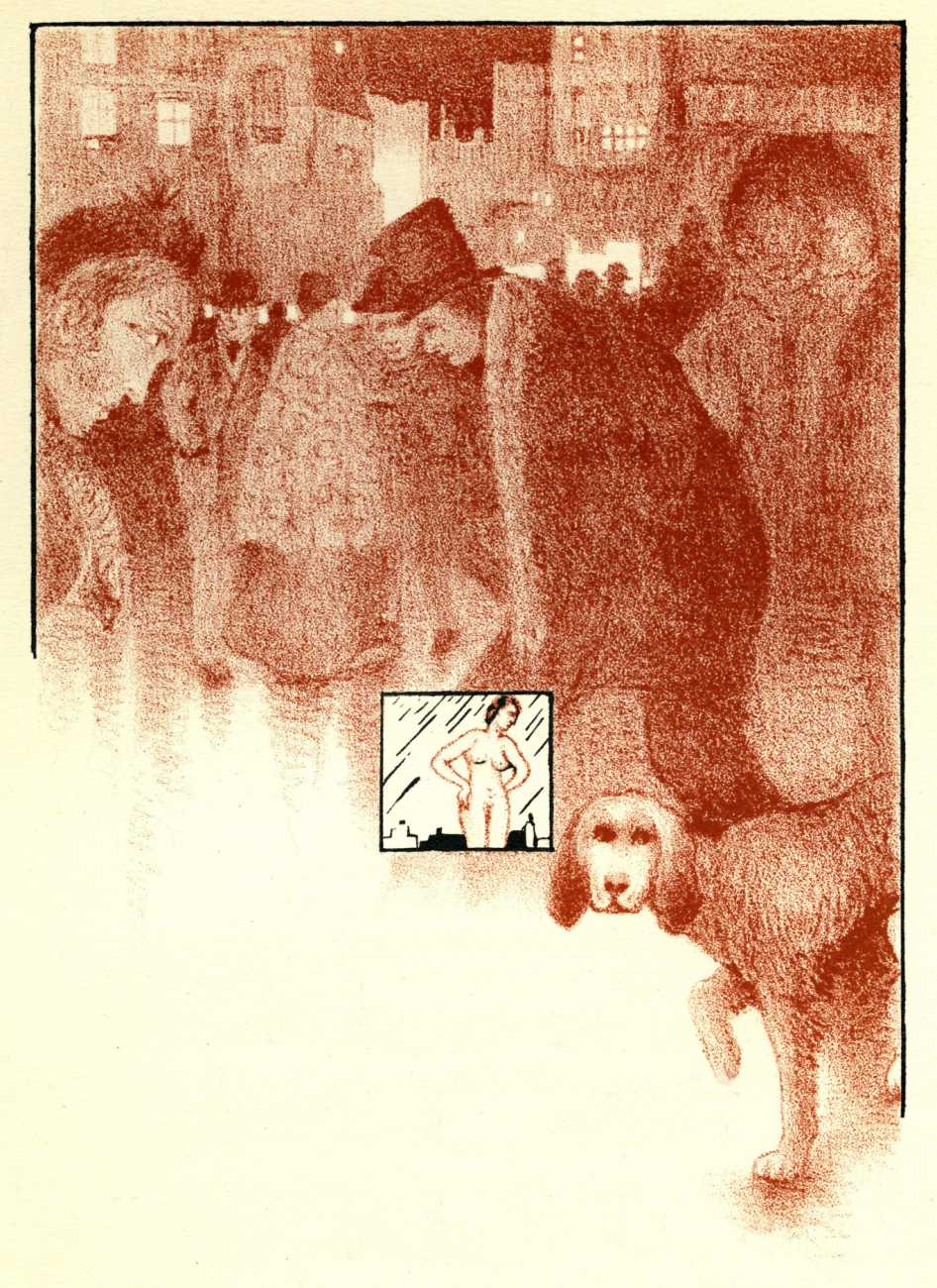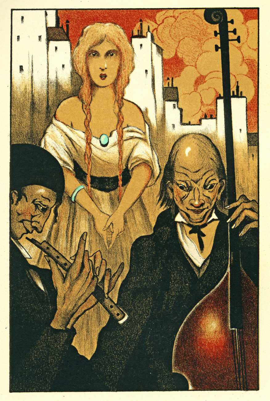 The Drains-illustrated Complaintes is a particularly sumptuous production, commissioned like the Jarry by publisher Simon Kra and editor André Malraux of the prestigious Éditions Sagittaire. Every poem illustrated is headed with a bi-colour engraving by Georges Drains, each consisting of a larger image with a smaller vignette, again showing how the artist was interested in experimenting with the juxtaposition of text, image and subject matter. The full-colour frontispiece includes a rather Ubu-like bass player.
