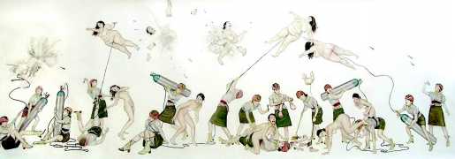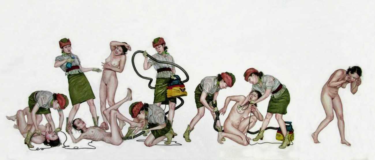 The second series shown here is from ‘Ravished and Ravaged’, another photorealistic series in which naked women interact with what appear to be uniformed staff in pseudo-medical scenarios involving vacuum cleaners, oxygen cylinders, wheelchairs – and balloons.