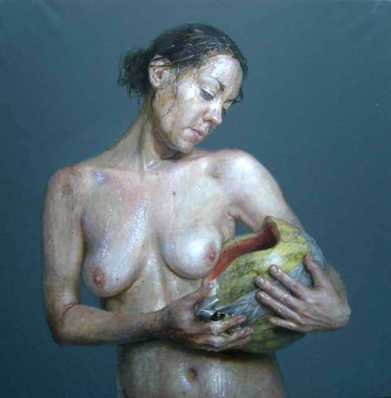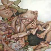 In her series ‘Seeded and Soiled’, women are shown revelling in food and in each other. Octopus, watermelon, pomegranates and fish feature strongly, with all their juicy messiness. As she explains, ‘I picked food for these paintings because it closely resembles flesh, an extension of the flesh. In the midst of these explorations I try to make these ordinary substances and objects new to me, foreign to me, to reinvent them.’