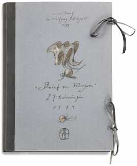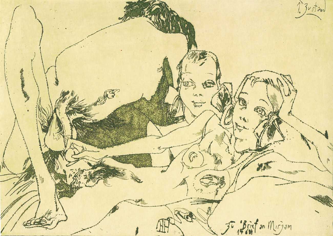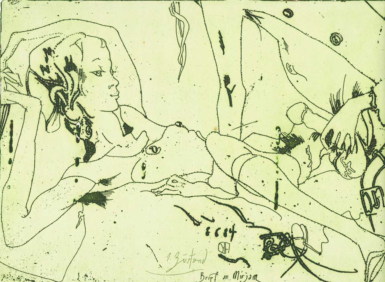 In 1984 Mirjam Madlung decided that she would like to hear about Janssen’s part in her parents’ encounter with the now-famous artist, so arranged to visit him and get to know him. Janssen wrote of the encounter, ‘It became a sweet divertimento in which the intelligent child urged me to write down the story of her young mother’. Being Janssen, he chose to do it in a series of drawings and etchings, which became Briefe an Mirjam (Letters to Mirjam). Janssen also made a a number of portraits of Mirjam, some of which are included in a small pamphlet that she published entitled Der alte Mann und das M.
