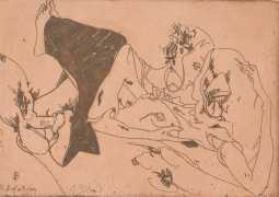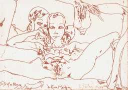 The 27 coloured etchings, printed in a limited numbered edition of 100 by Janssen’s long-term printing partner Hartmut Frielinghaus, are some of the artist’s most sexually explicit, most of them featuring Horst himself with two gaunt and angular women (Judith and Mirjam?), and many alluding to a degree of sexual violence. There is anger and passion, lust and longing in these powerful images.