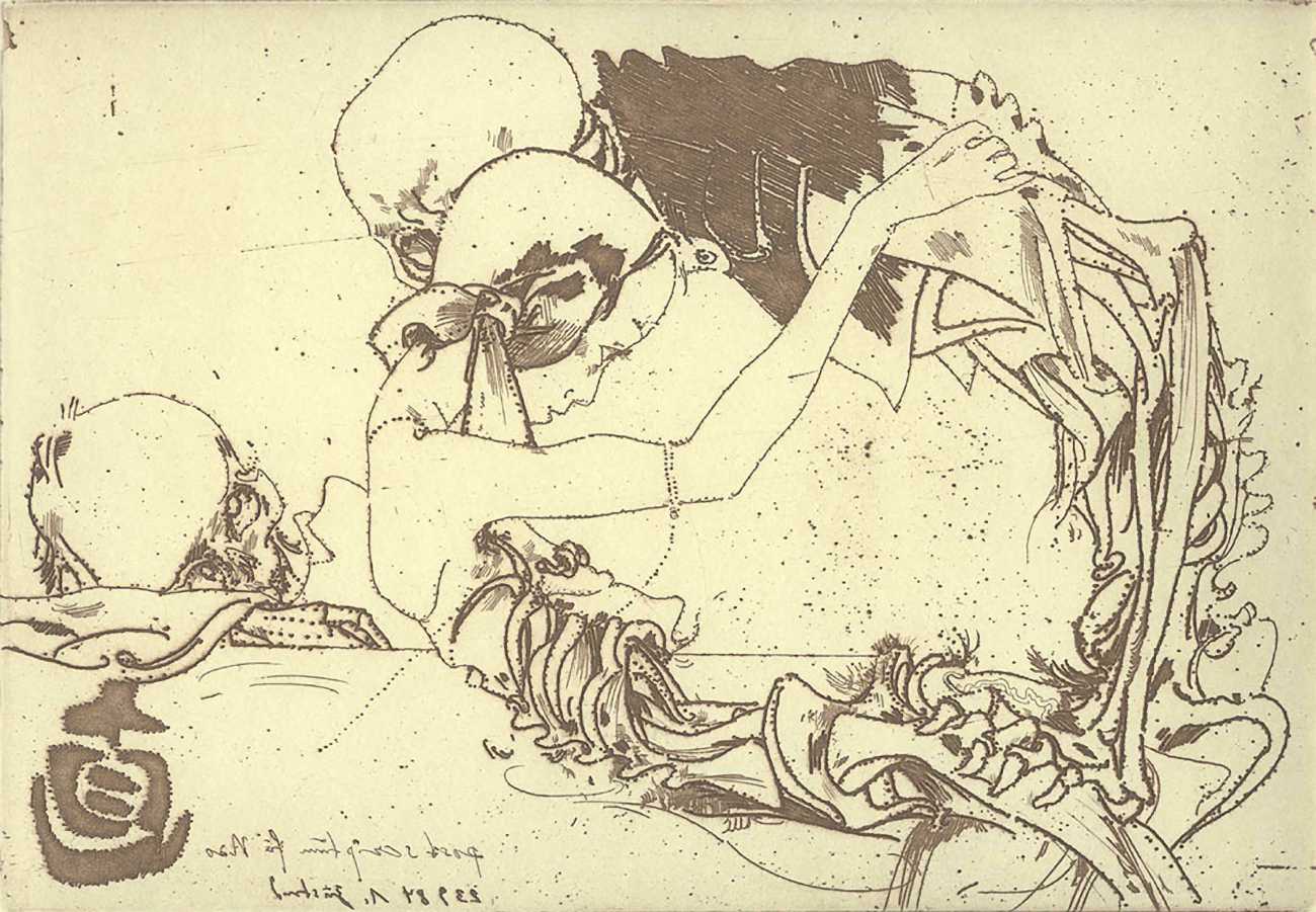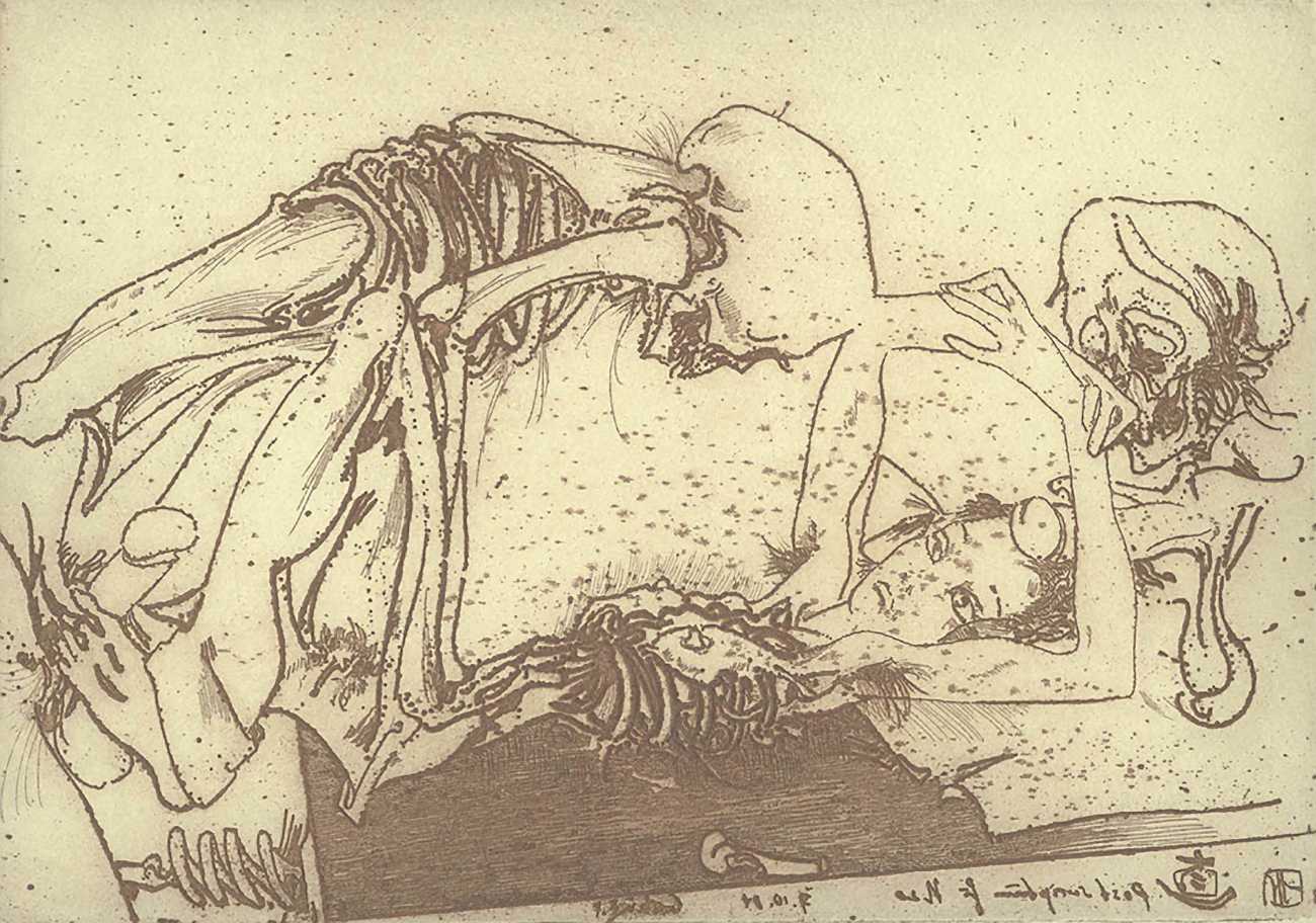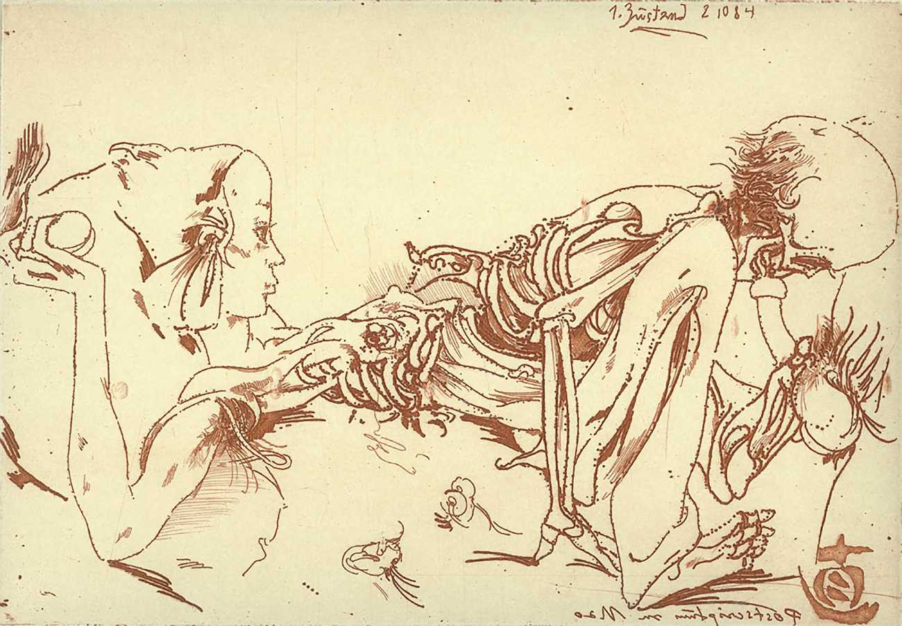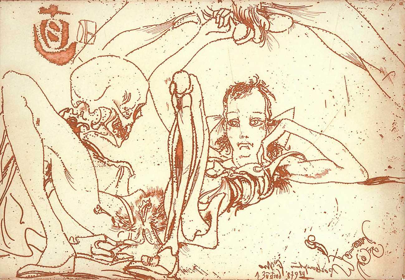 Shortly after he had completed the etchings for Briefe an Mirjam, Horst Janssen started working on a complementary set of images similar in style but introducing another recurring element, death in skeletal form. It was not the first time he had explored the subject of sex and death – the 1974 portfolio Totentanz (Dance of Death) included many similar images.