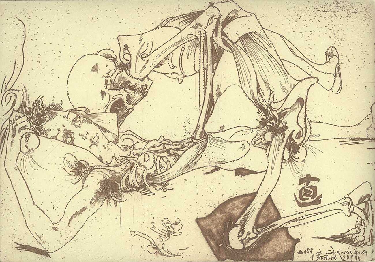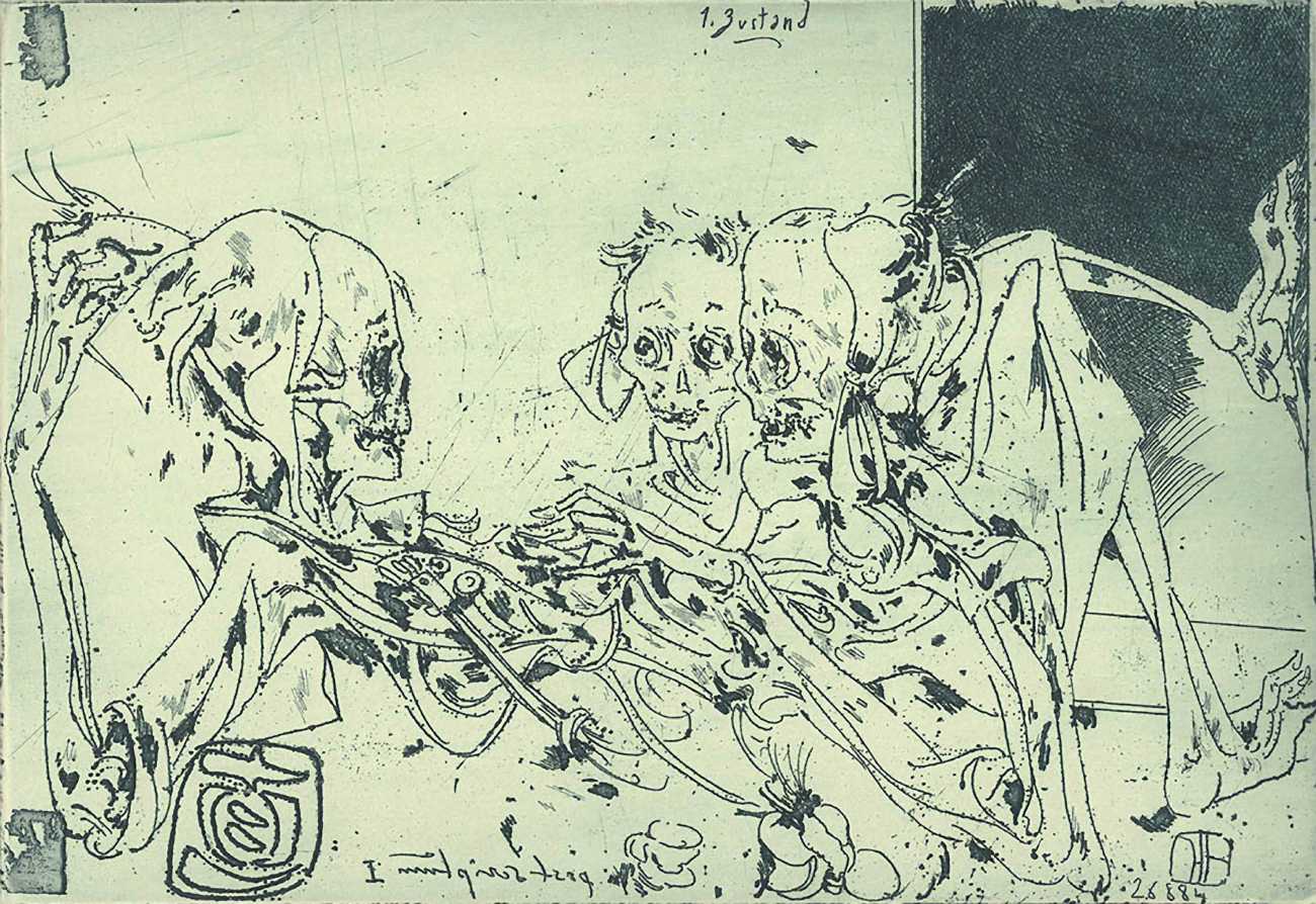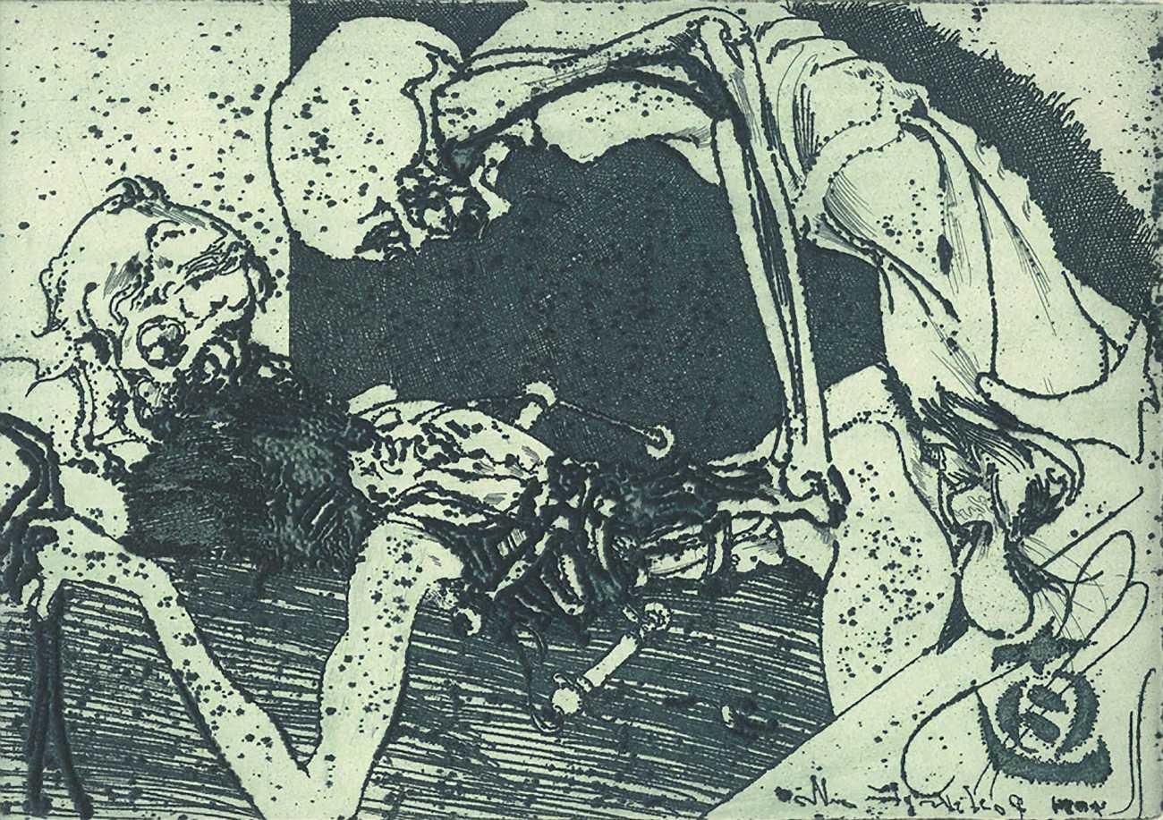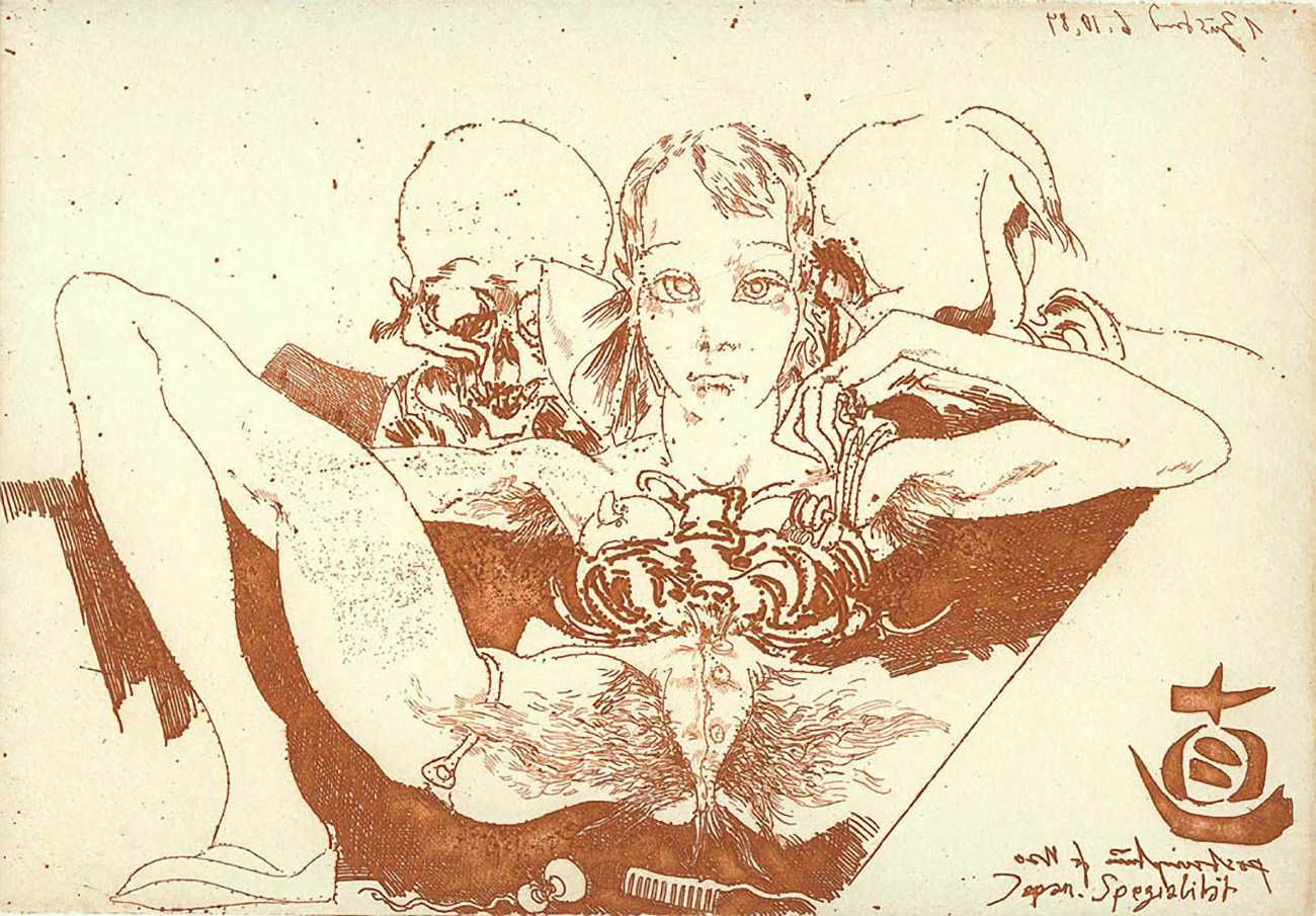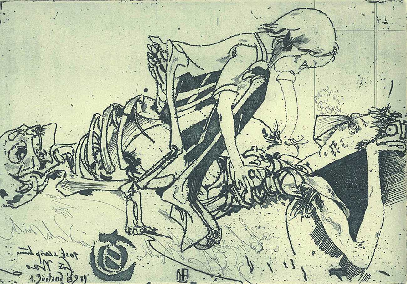 Shortly after he had completed the etchings for Briefe an Mirjam, Horst Janssen started working on a complementary set of images similar in style but introducing another recurring element, death in skeletal form. It was not the first time he had explored the subject of sex and death – the 1974 portfolio Totentanz (Dance of Death) included many similar images.