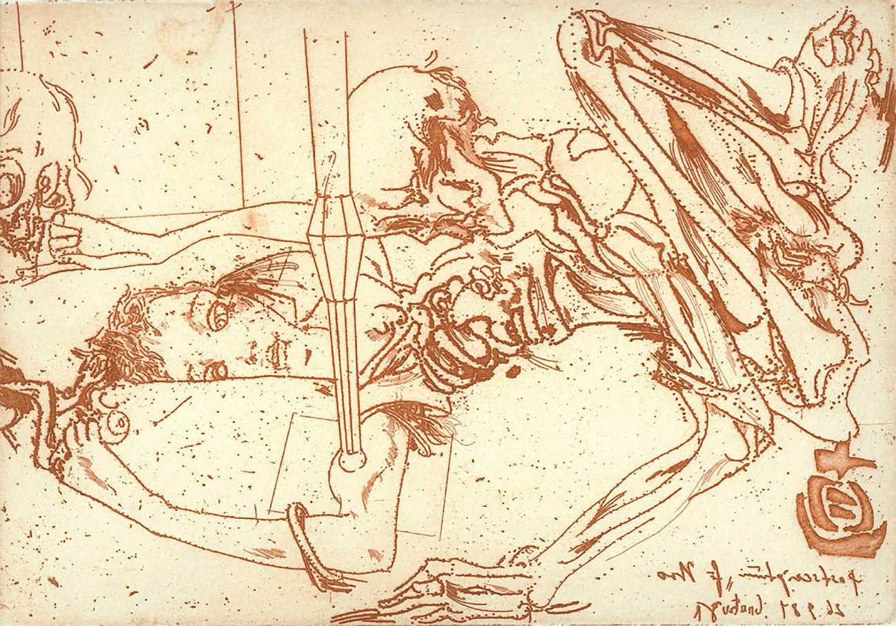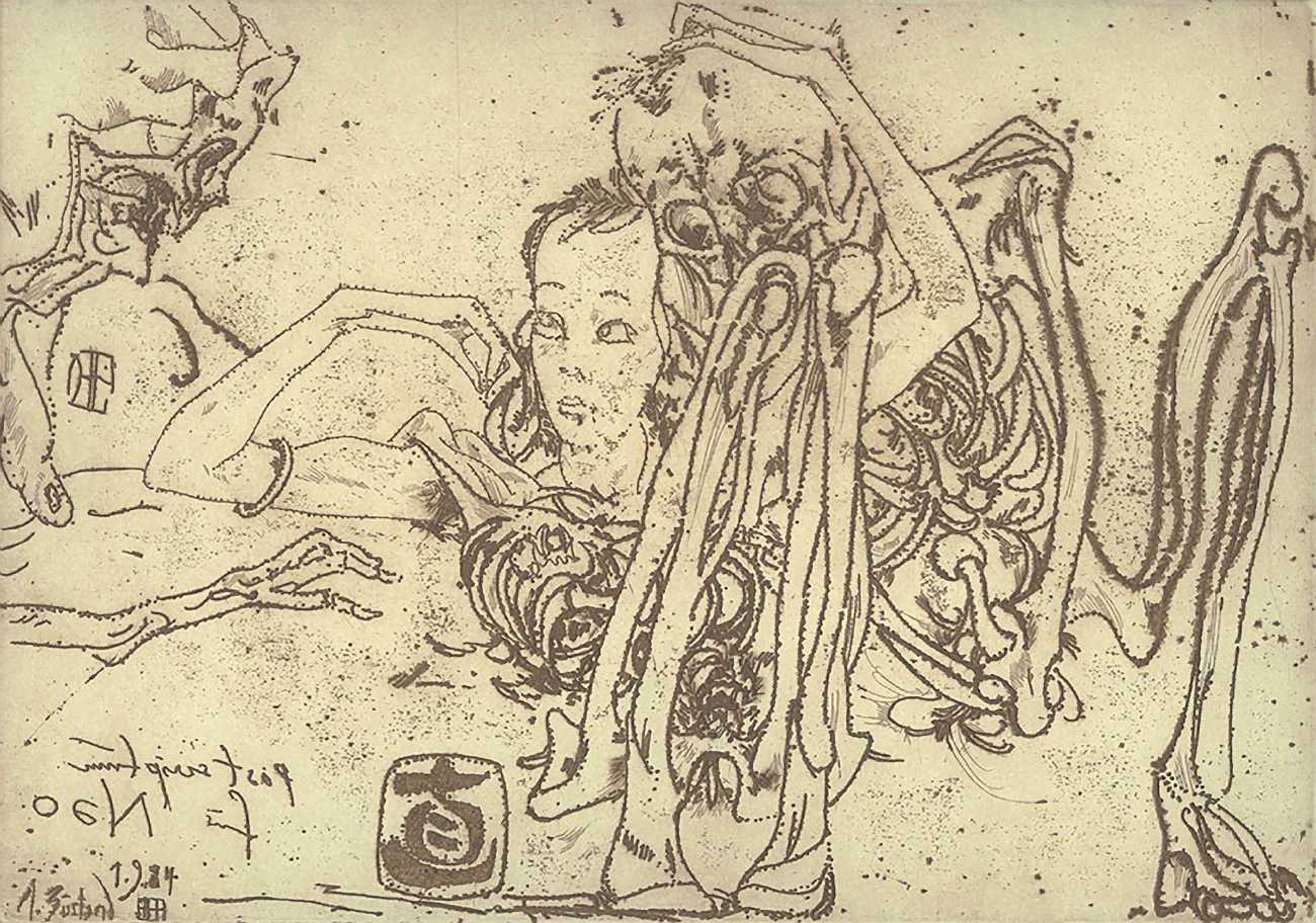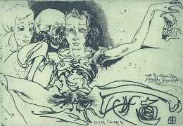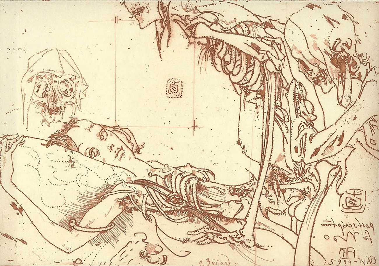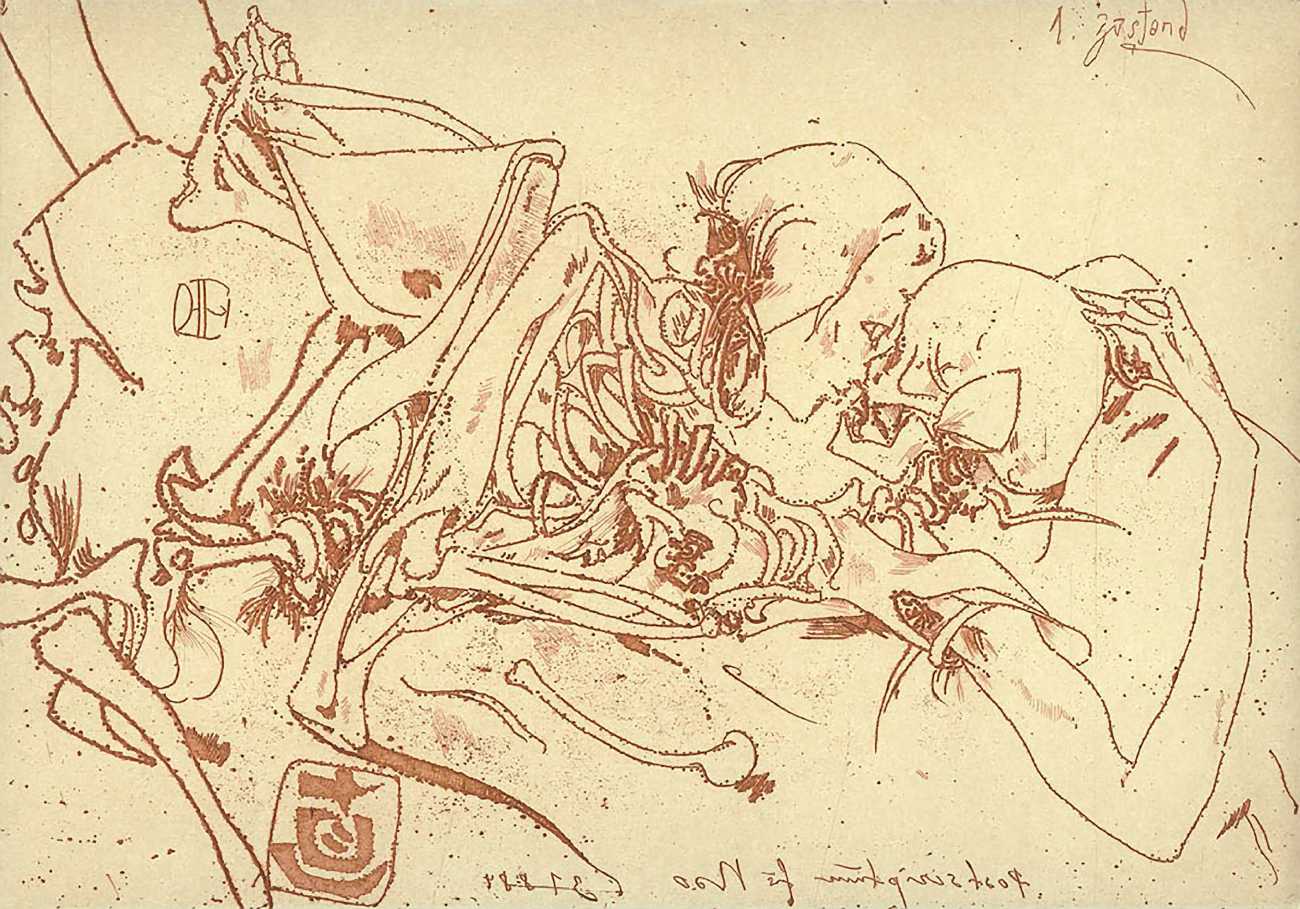 Shortly after he had completed the etchings for Briefe an Mirjam, Horst Janssen started working on a complementary set of images similar in style but introducing another recurring element, death in skeletal form. It was not the first time he had explored the subject of sex and death – the 1974 portfolio Totentanz (Dance of Death) included many similar images.