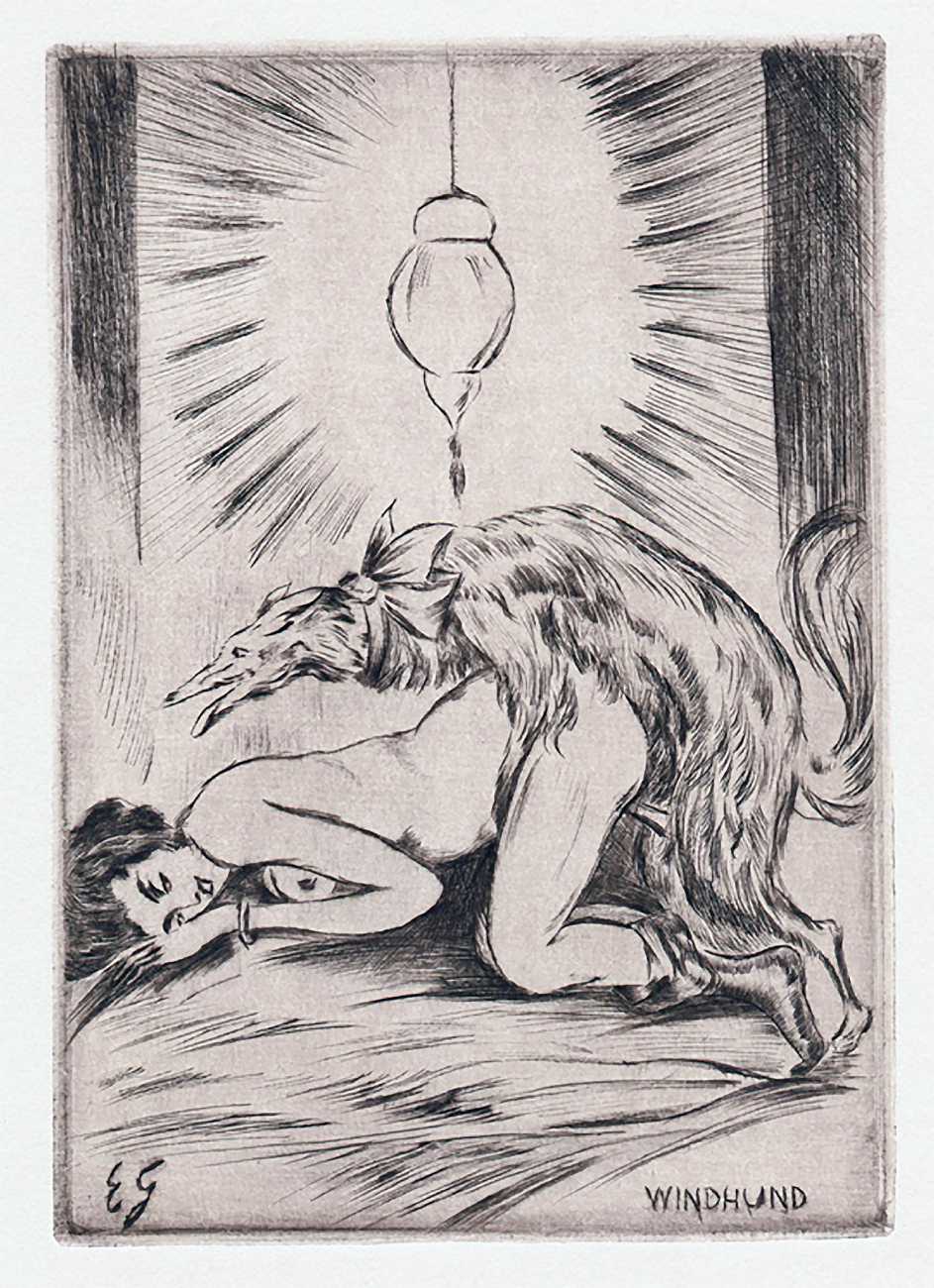 As far as we know, this portfolio of ten etchings is the only erotic work that Gerhard produced, but it made its mark with the censors – it was banned in Leipzig in 1927, Munich in 1929 and Berlin in 1932, finally making it to the infamous Polunbi (Polizeipräsidium zur Unzüchtiger Bilder) catalogue of banned books in 1936 as ‘unsuitable for distribution’. By which time of course it was much too late; it had been unavailable for more than a decade.