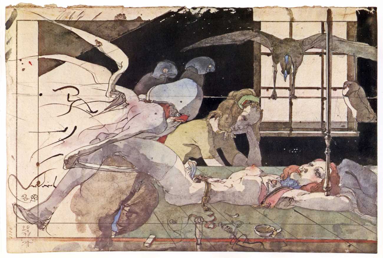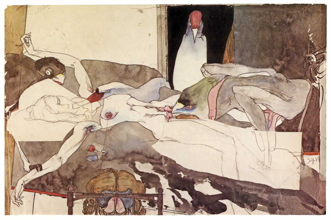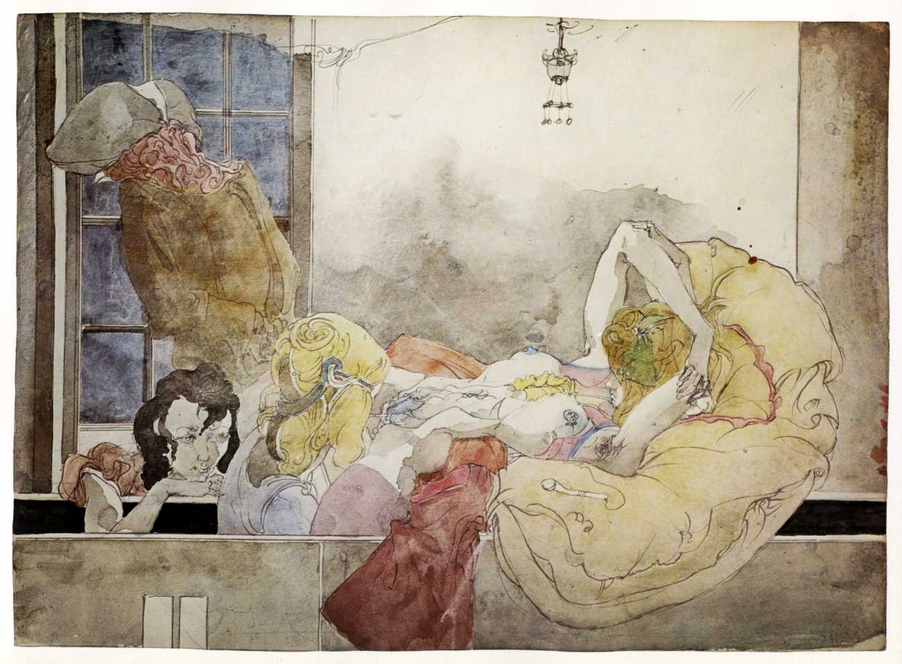 Janssen’s third and last marriage was with Verena von Bethmann-Hollweg, and lasted from 1960 to 1968. The next decade, one of his most productive artistic periods, was also his most sexually active, his lovers including Gesche Tietjen, Roswitha Hartung, Bettina Sartorius, Birgit Jacobsen, Viola Rackow, Kerstin Schlüter, Annette Kasper, Britta Kerinnes and Heidrun Bobeth. Verena, she of the perfect arms, remained a constant memory, however, and the Phÿllis series of paintings, made between late 1977 and mid-1978, makes reference to a remark she made to him after a holiday on the island of Sylt, where she told him that ‘he couldn’t do watercolours properly’. The immediate muse for the series, however, was Birgit Jacobsen, and Janssen said of the paintings that ‘the hand, not the brush, was guided by the memory of Birgit’s anatomy’.