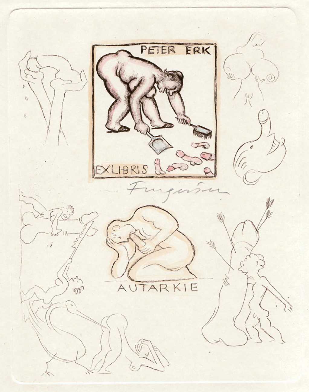 Michel Fingesten’s ingenuity was boundless, even while working within severe spatial restraints, as the small bookplates were usually pasted on the inside front cover of the collector’s books. In Fingesten’s hands the bookplate transcends its utilitarian and decorative function, and becomes both a work of art in itself and a powerful expression of his relationship with the client and the social and sensual undercurrents of the time.