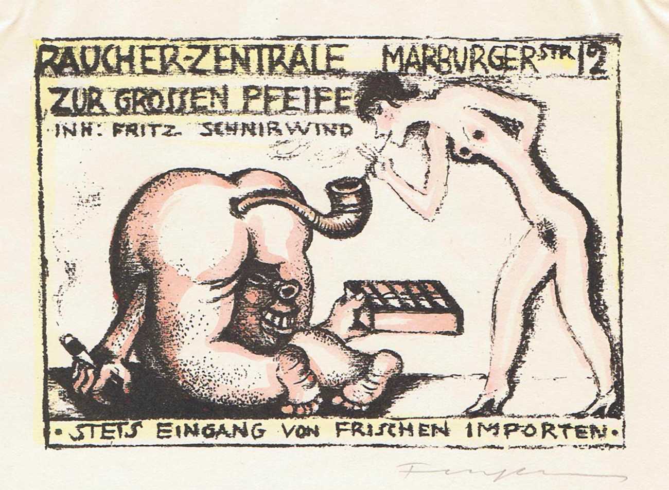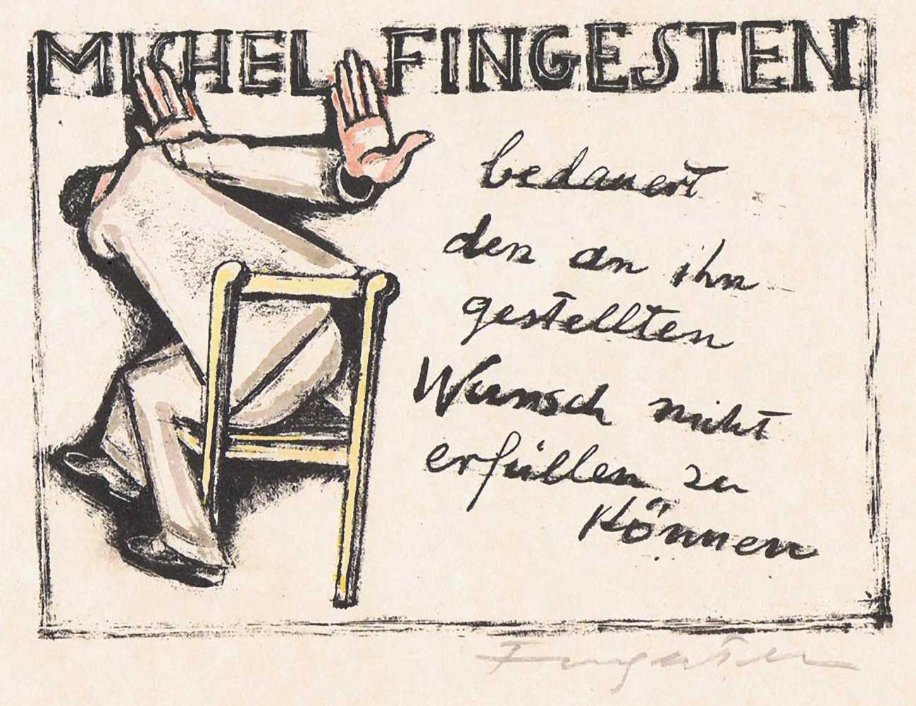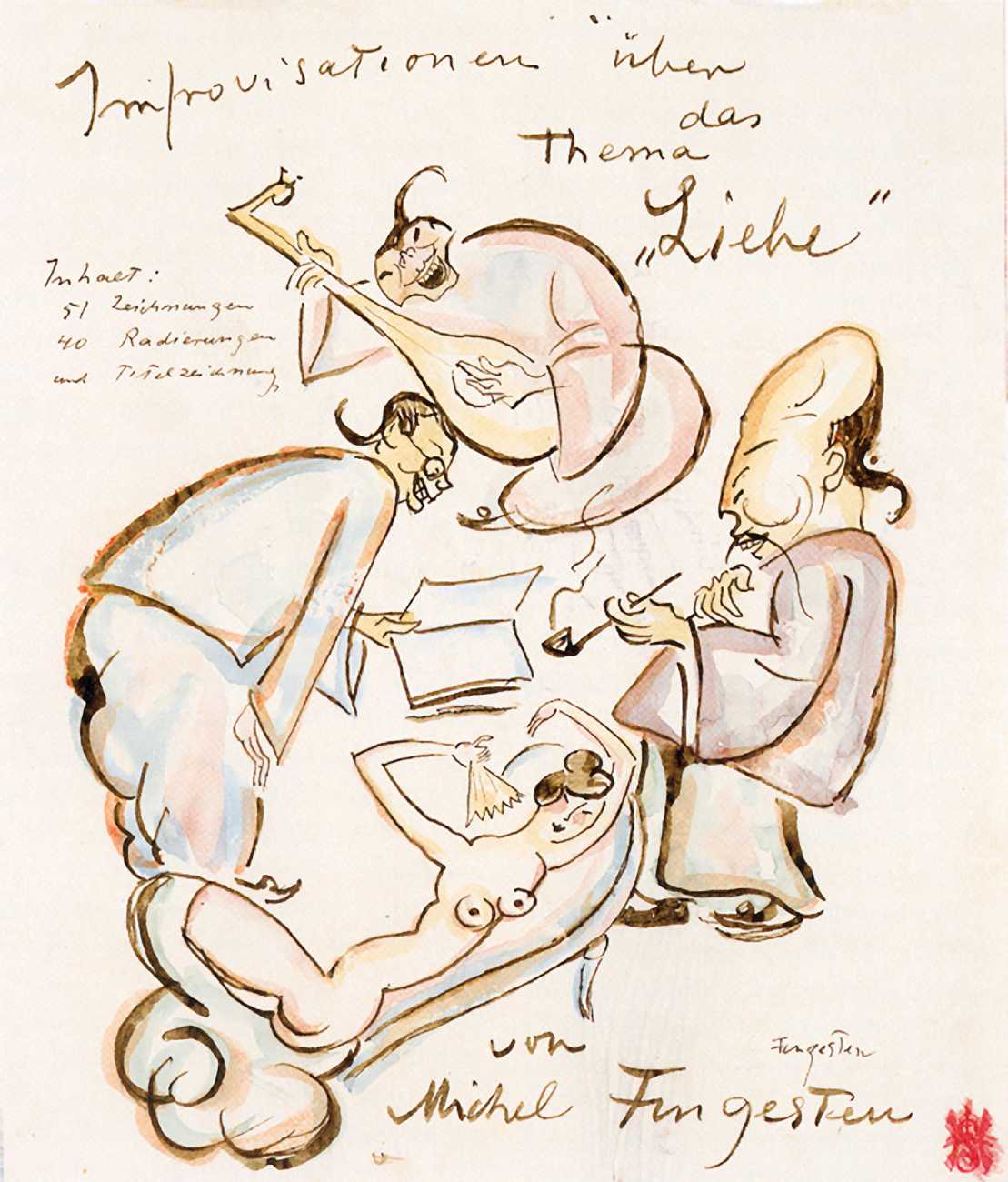 In 1923, when Fingesten was at the height of his popularity, the Cologne collector Heinrich Stinnes (1867–1932) commissioned a personalised portfolio of drawings and etchings for his vast collection. The selection Fingesten put together for Stinnes consisted of 40 etchings, including several bookplates, and 51 original drawings. He titled it Improvisationen über das Thema Liebe (Improvisations on the Theme of Love). It was no doubt a particularly lucrative commission.