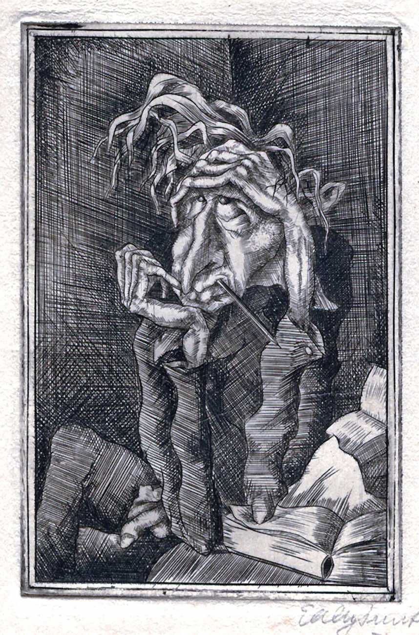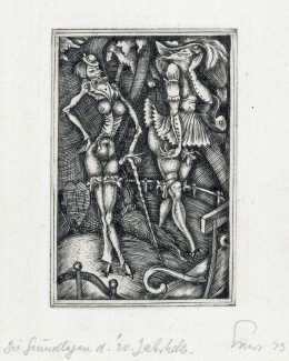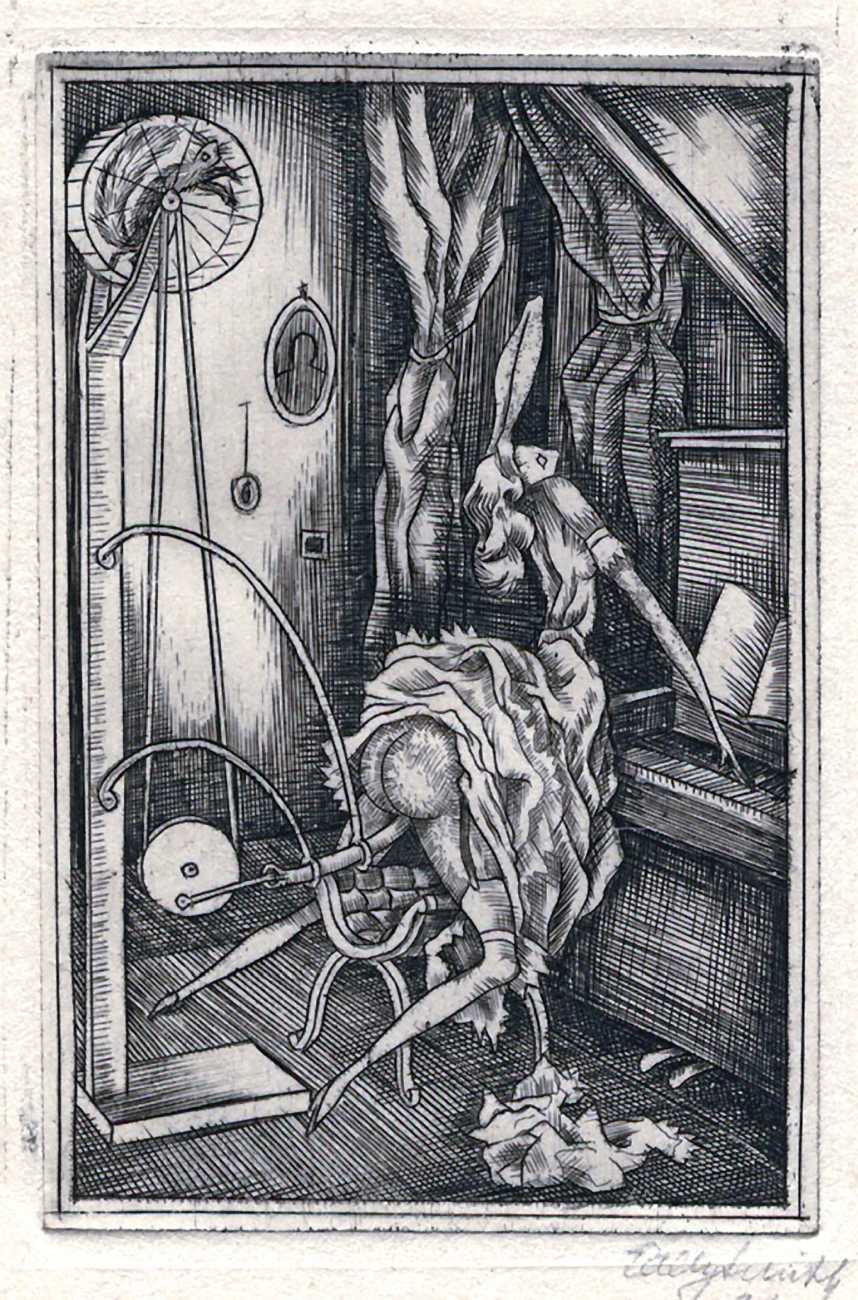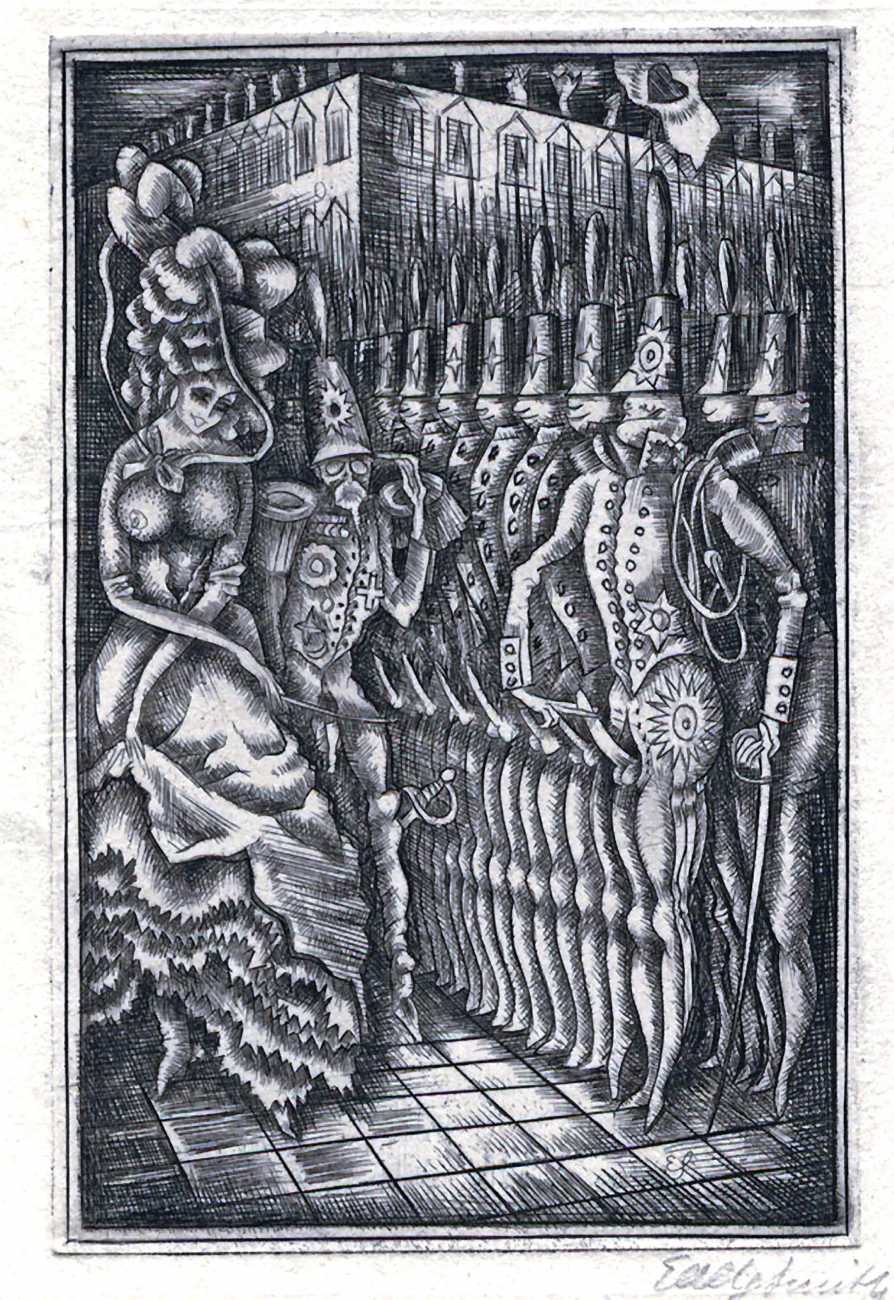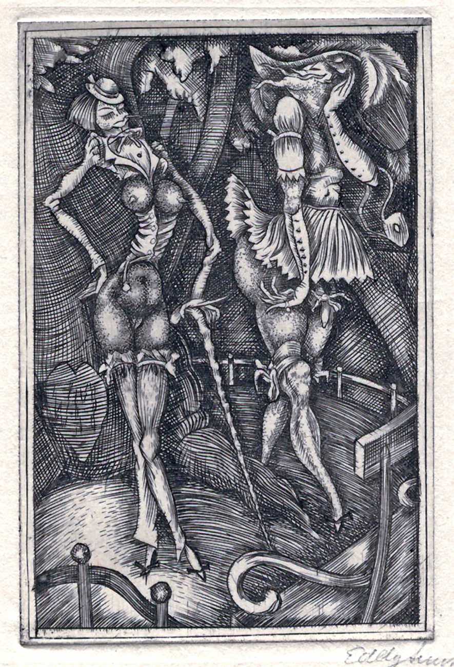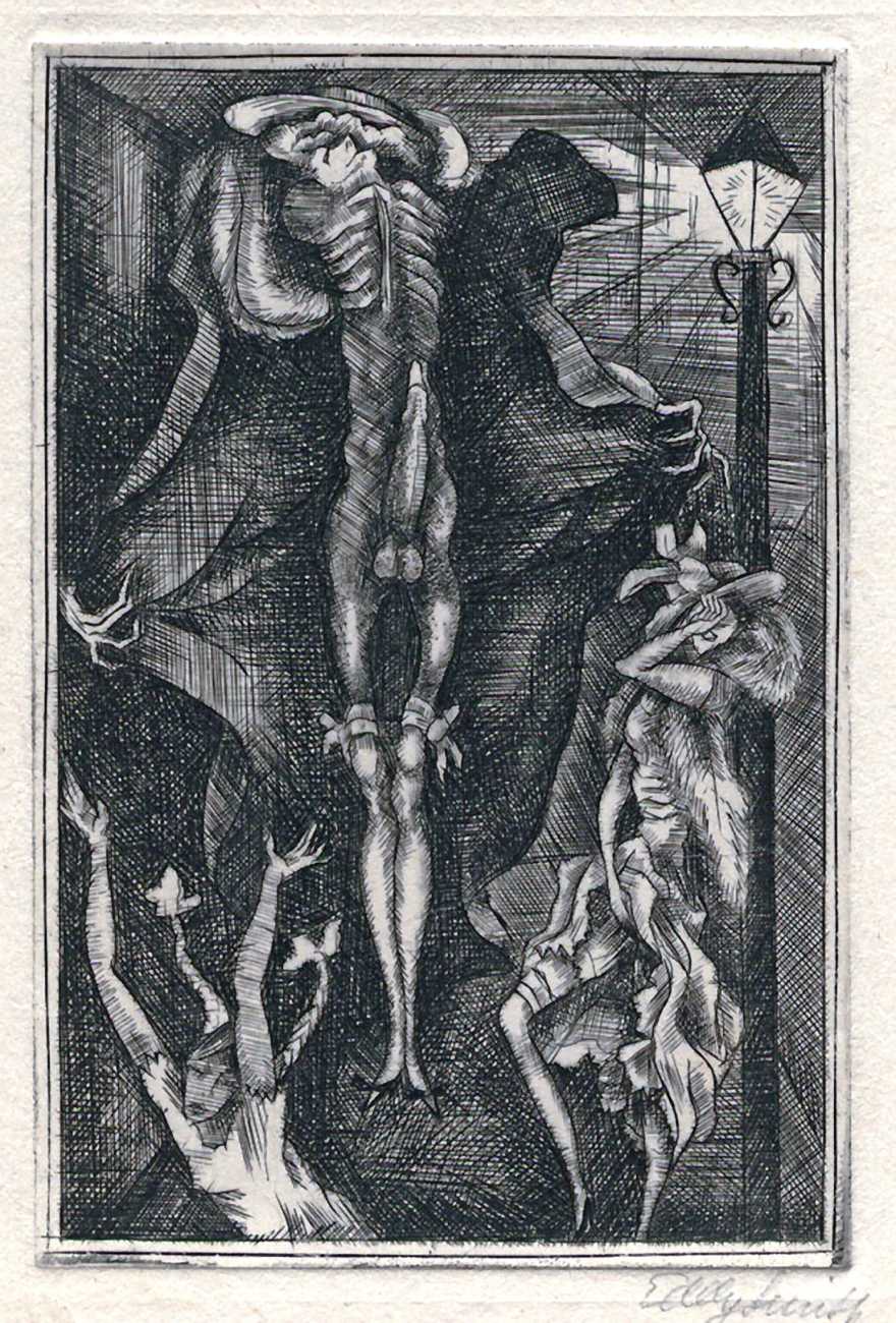 This portfolio of ten engravings from copper (Kupferstiche), created in Weimar Berlin as the city recovered from the First World War and around the time the artist was deeply in love (and presumably also in lust) with Asta von Friedrichs, is full of detail and telling symbolism. The suite is often called Die Grundlagen des 20 Jahrhunderts (The Foundations of the 20th Century) after the title of the first print, and sometimes Die Muse der Sodomie (The Muse of Sodomy), but neither title is the artist’s.