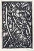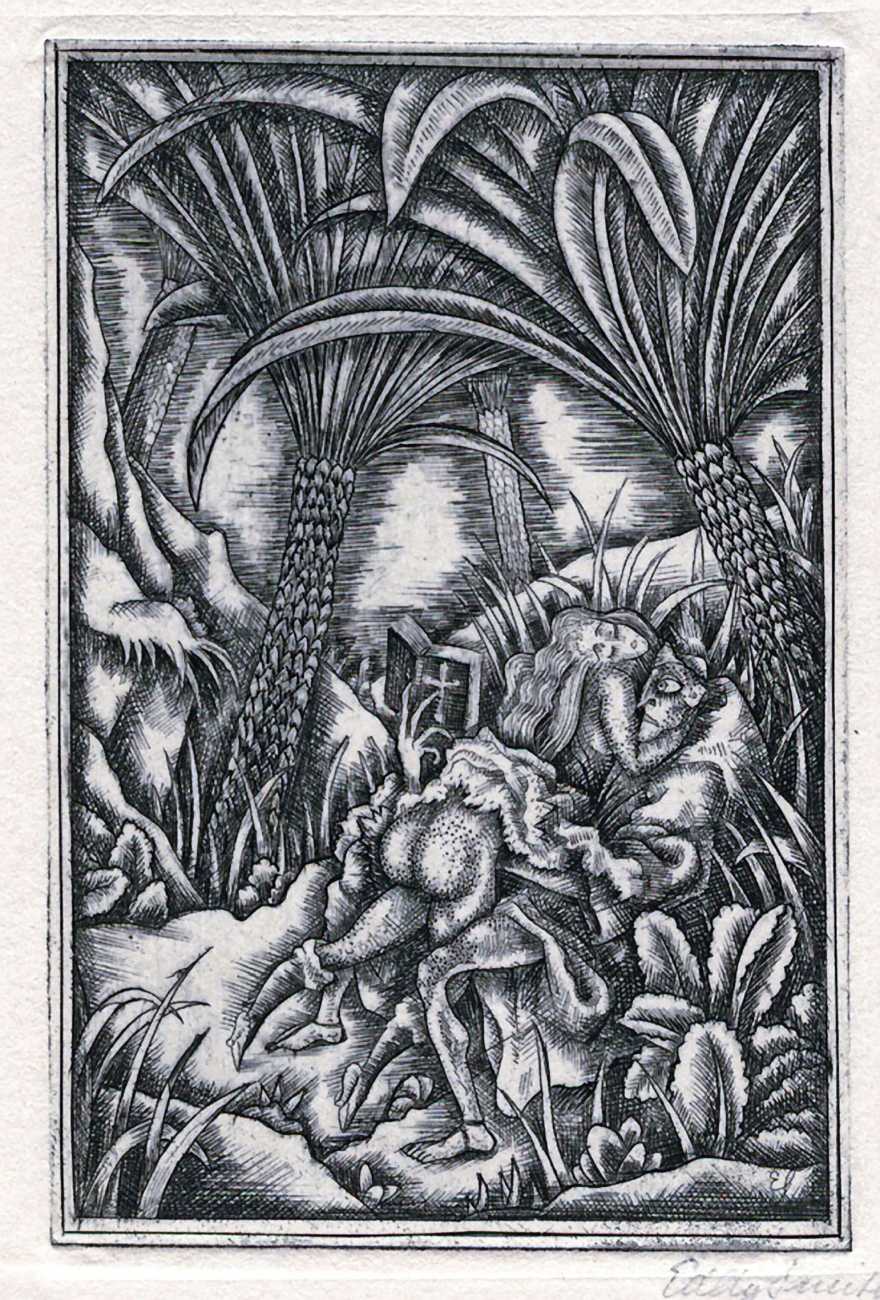 Here we have carefully-considered compositions engraved by a master of the art. Skeletal figures with deliberately large and deformed genitals occupy landscapes filled with machinery and angular foliage, which surely mirrors Smith’s artistic struggle to understand the juxtaposition of sexual intimacy and industrial efficency.