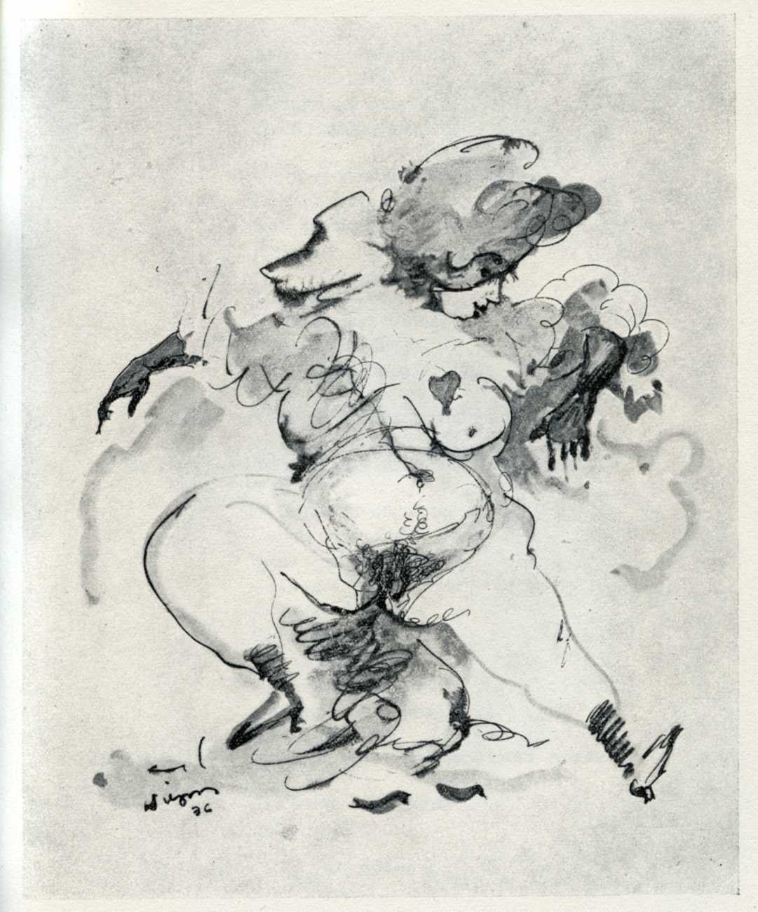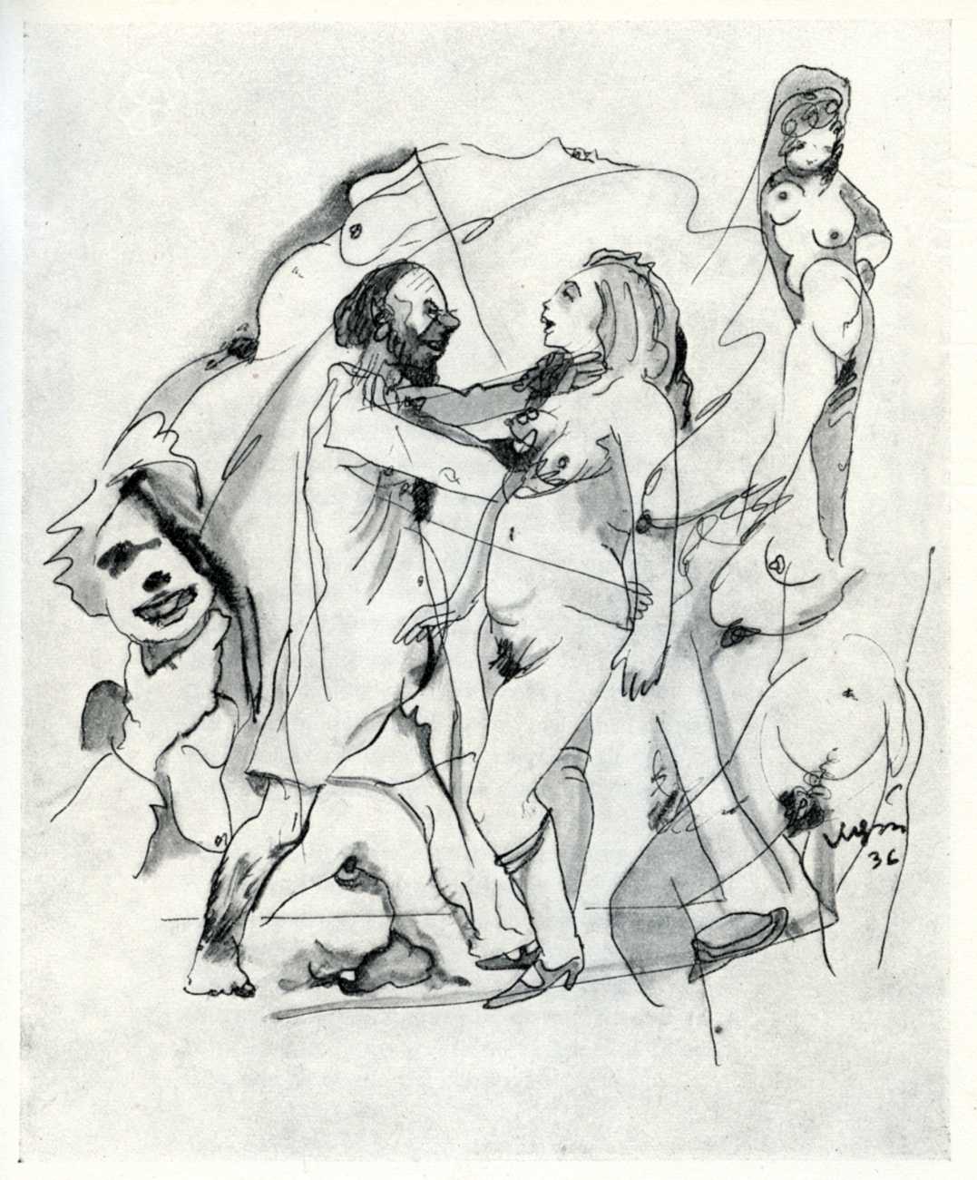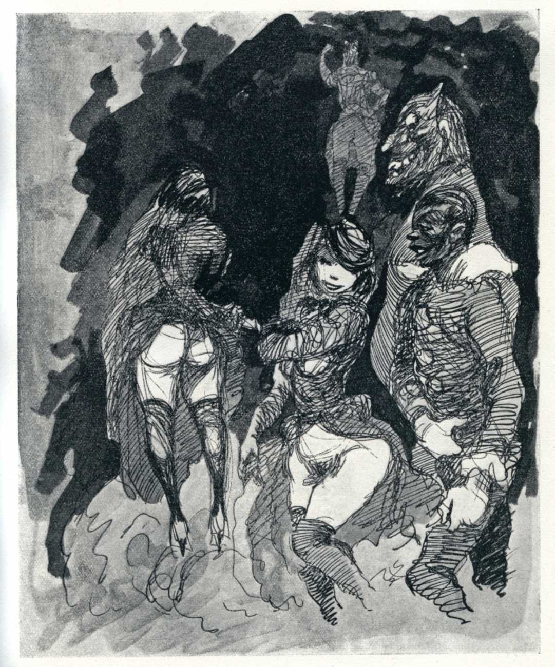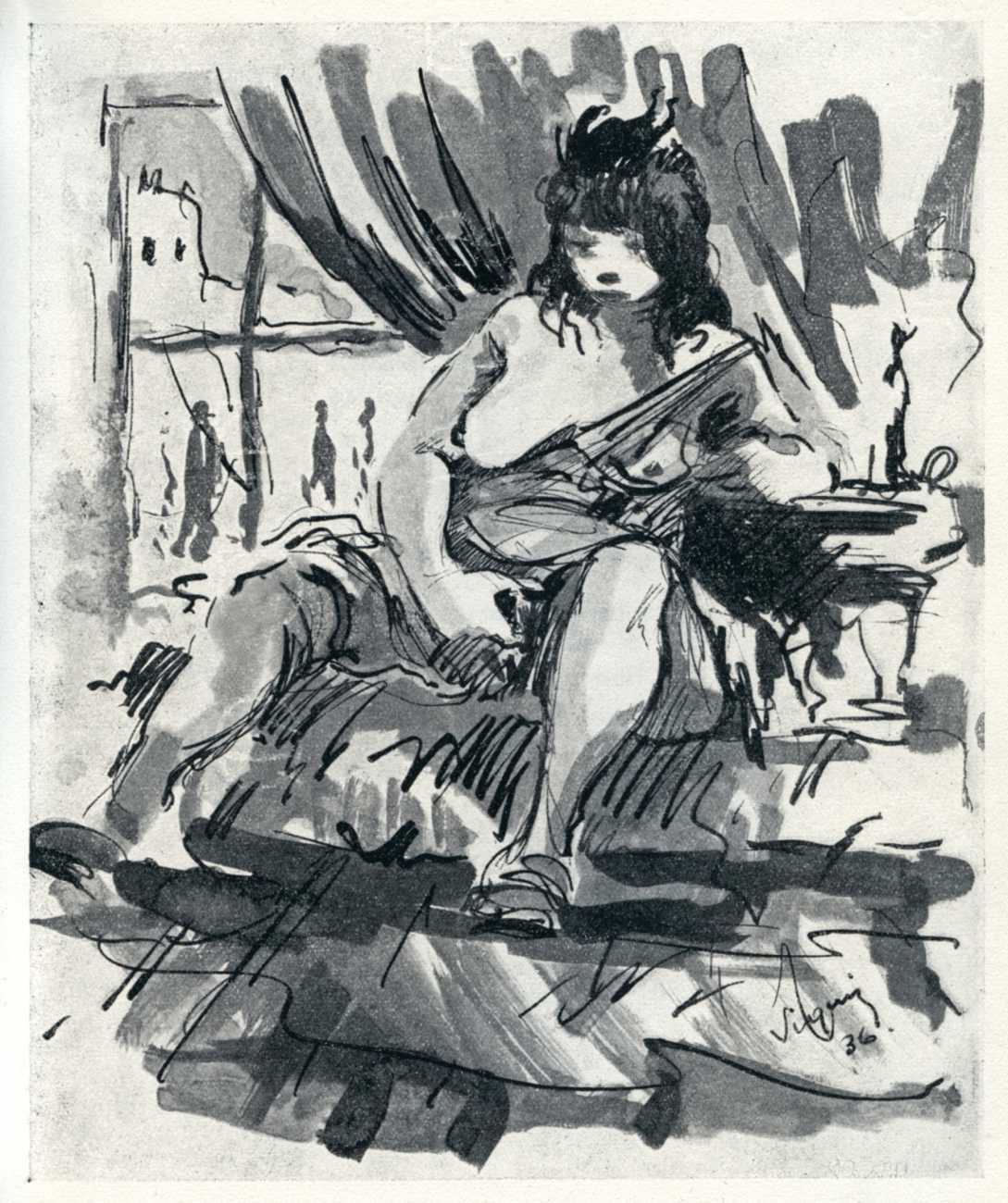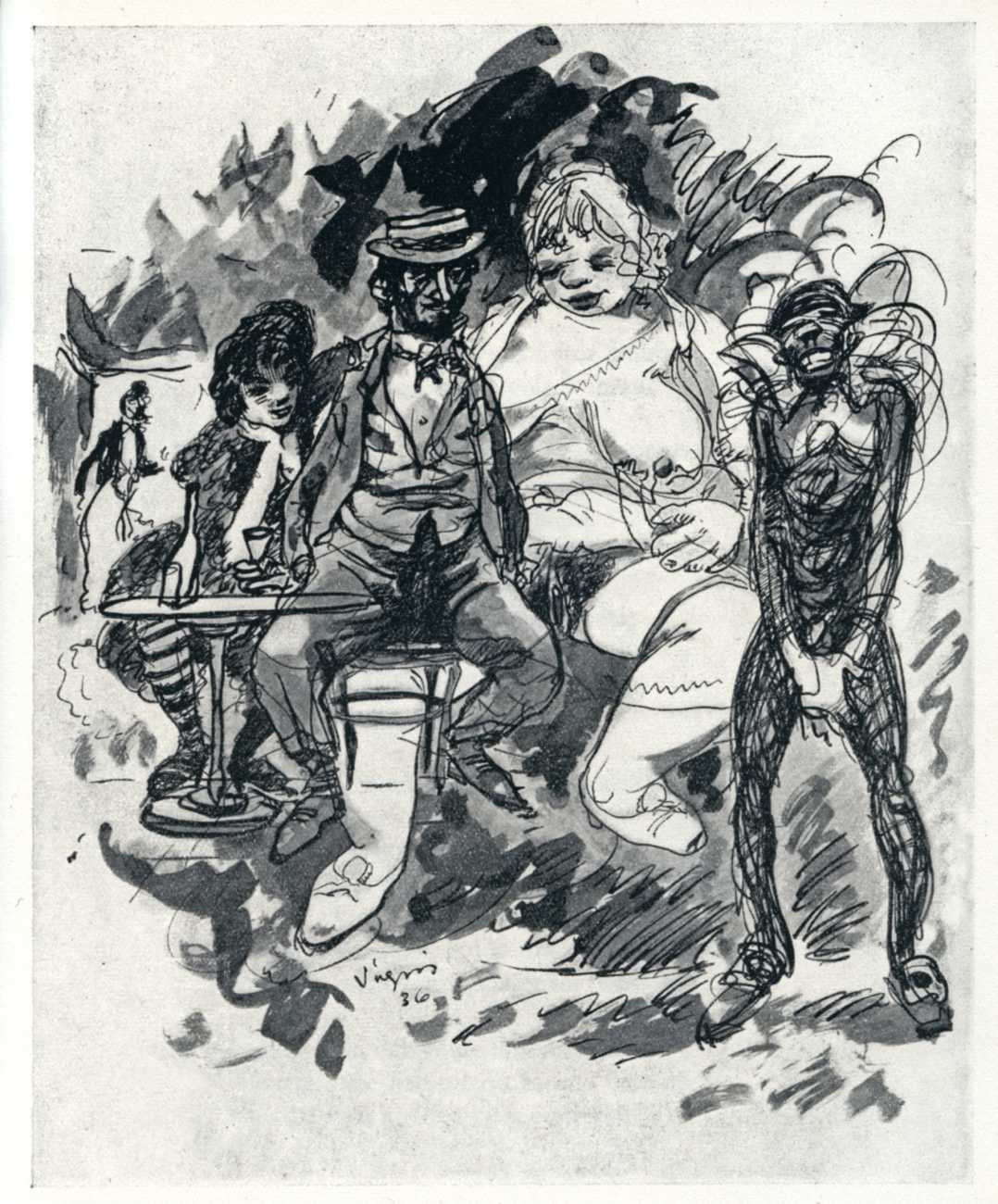 Sylvain Vigny’s drawings, in his trademark loose pen and wash style, are quite remarkable, even though the reproductions in the book do not do justice to the originals, probably lost forever. With a few deft strokes of the pen and ink washes he evokes real characters in believable situations, and what a variety of characters. He also has an uncanny ability to draw people – women anyway – both clothed and unclothed at the same time, a skill shared with very few other artists, notably Chas Laborde in his 1923 L’inflation sentimentale, which you can see here. Several of the plates feature naked groups of dancers, reminiscent of Martin van Maële’s La grande danse macabre des vifs, with which Vigny was no doubt familiar.