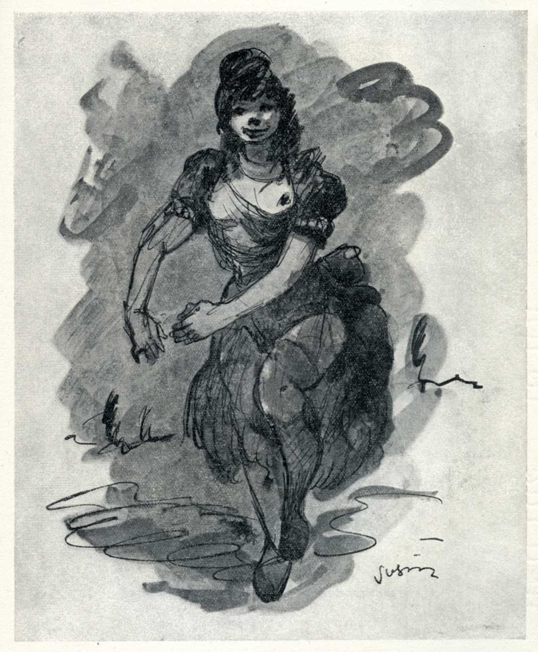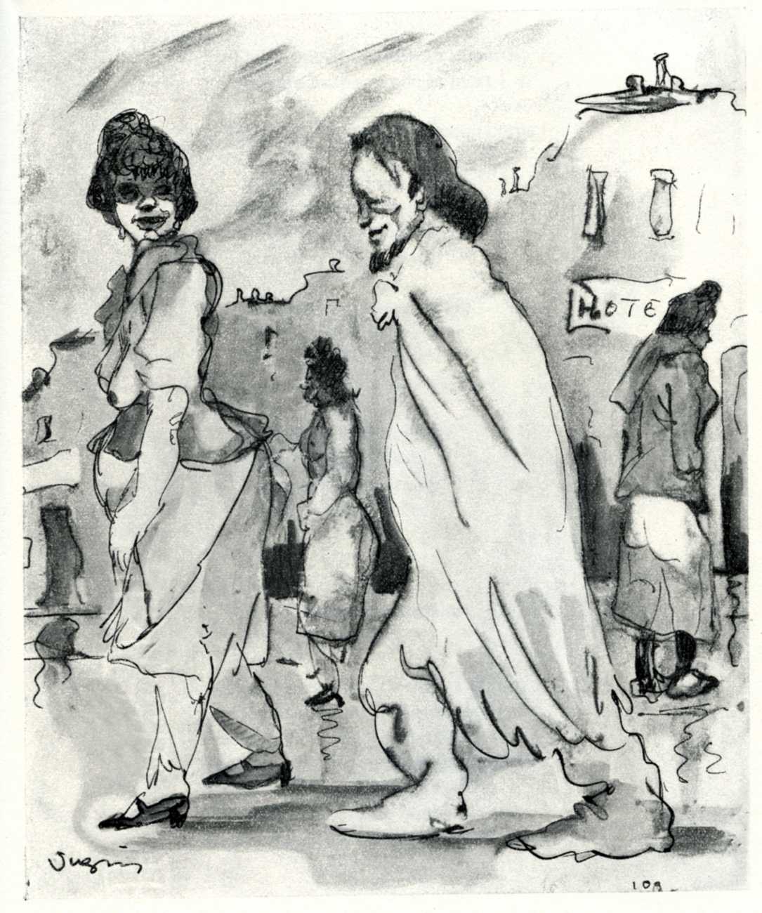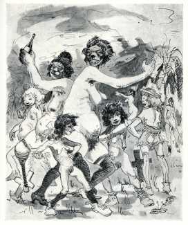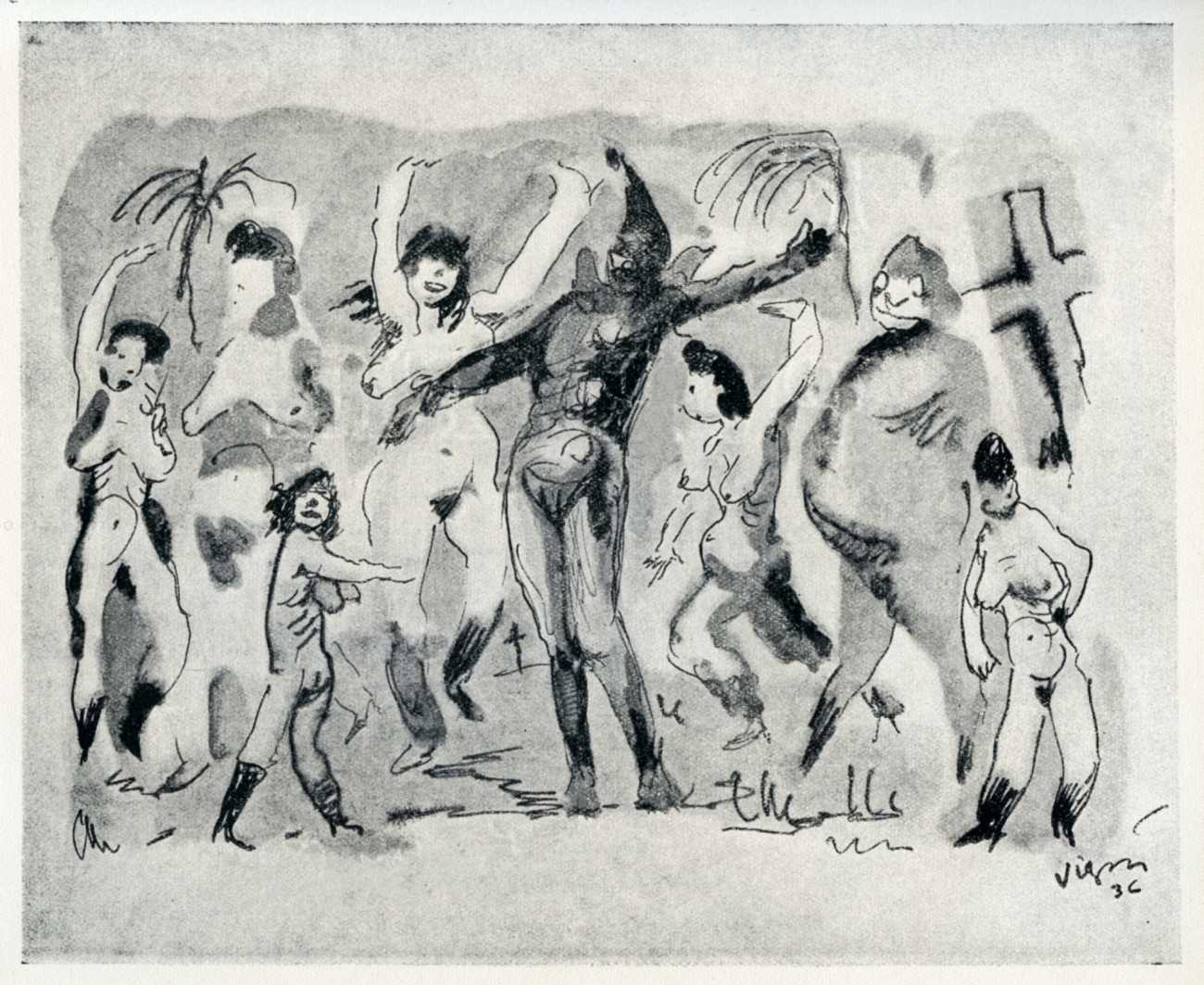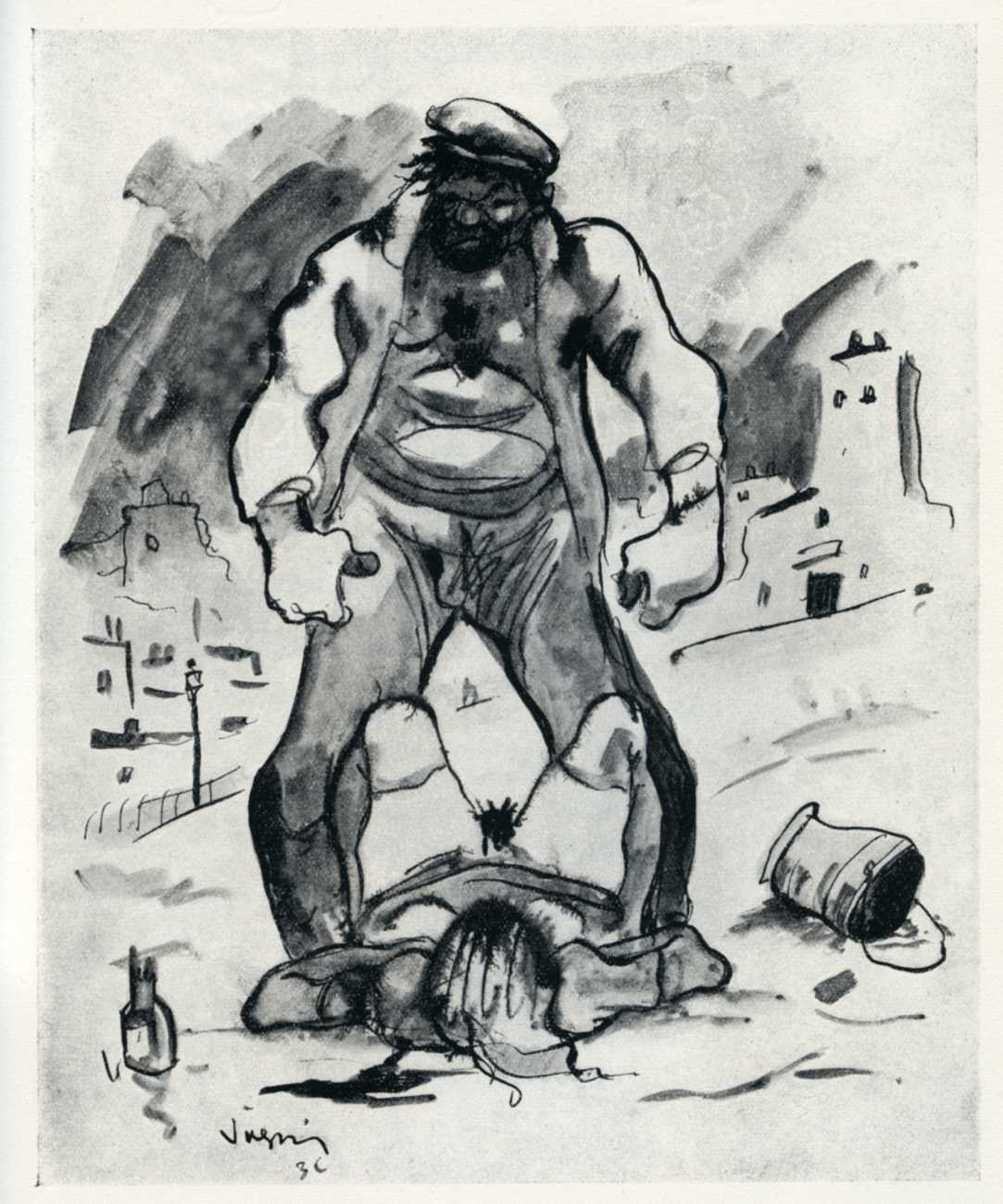 Sylvain Vigny’s drawings, in his trademark loose pen and wash style, are quite remarkable, even though the reproductions in the book do not do justice to the originals, probably lost forever. With a few deft strokes of the pen and ink washes he evokes real characters in believable situations, and what a variety of characters. He also has an uncanny ability to draw people – women anyway – both clothed and unclothed at the same time, a skill shared with very few other artists, notably Chas Laborde in his 1923 L’inflation sentimentale, which you can see here. Several of the plates feature naked groups of dancers, reminiscent of Martin van Maële’s La grande danse macabre des vifs, with which Vigny was no doubt familiar.