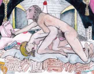 Lisa Zirner’s stage-set drawings are at the same time naïvely simple and wittily detailed, illustrating particular passages in de Sade’s narrative. The passages illustrated are given below. The volume which appears on the table in the foreground of each drawing is Thérèse philosophe (Therese the Philosopher), a 1748 French novel ascribed to Jean-Baptiste de Boyer, Marquis d’Argens, an important vehicle for elaborating on the ideas of the influential French ‘philosophes’, the intellectuals of the enlightenment seeking to apply reason to every aspect of life – including sex.