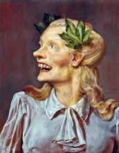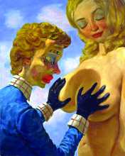 Many of Currin’s female subjects have the same stilted smile and vacuous stare, lifted from advertising; his work seems joyless, sarcastic, and glib, and it is difficult to come round to the idea that he is actually sympathetic to the curiously inadvertent subjection of his subjects (one could think here, perhaps, of the roiling conversation around Diane Arbus’s freaks). Something about this work makes us feel creepy and embarrassed, as if we were caught like a teenager rummaging in our parents’ underthings; we feel awkward; ashamed and giggly. This is not only for the obvious reasons found in such macabre works as The Wizard, depicting a gloved Howdy Doody-esque figure groping, or manipulating, the immense breasts of a blond, it is pictures like Minerva and The Activists, where Currin’s disdain is crudely palpable. Minerva, otherwise known as Athena, Goddess of Wisdom, is show as an hysterical crone with maple leaves stuck in her hair; the ‘activists’ are pathetic seniors, grandmas and grandpas left behind in the millennial dust. (It is no stretch to imagine this picture in the living room of, say, Donald Rumsfeld. Well, someone had to attract those big Republican bucks.)