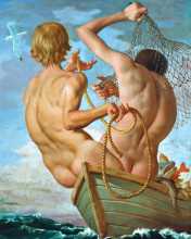 But what about Currin’s much touted painterly expertise? These claims seem grossly exaggerated, brought about by deprivation, as if everyone had been starving and someone came up with some carrot sticks. There are countless passages in this work which look both uncertain and overwrought; his surface is by turns glossy and built up, pocked; often he seems unsure of the relation between drawing and paint. In any case, contra McLuhan’s mantra, here the medium is decidedly not the message. It is precisely the disconnect and clash between Currin’s attention to, and proclaimed love of, the act of painting, and the crude assertiveness of his subjects, that captures our attention, confuses our habits of seeing. Like a pirate, he steals booty off the good ship PC and sails off on a sleek old schooner, replete with polished teak and brass fittings. (Those naked Fishermen in their laden dinghy are headed out to a very cool yacht parked at the Vineyard. Trust me.) He has hoisted the academic flags of post-gender feminist-colonial-multiculturalisms on their own postmodern discourse-saturated petards, all the while letting the ship fill with the brine of an ostensible universality. For Currin, equality is not a complex ratio of opportunities, but a flat transaction, an economy of reductive semblances. Currin’s in-your-face rejection of ideology and theory-driven models for art experience is, I think, what has caused aestheticians like Peter Schjeldahl to react with inebriated joy. Schjeldahl’s sine qua non is pleasure, the delirium of a sensuous high from which, later, language and its conceptual demands ensue. Still a poet at heart, Schjeldahl wants to fall in love and tell about it later in rapturous prose. And so Currin’s combination of art historical savvy (where Schjeldahl and frères can strut their stuff), painterly finesse, and subversive topicality adds up to a rave. Art critics of the world, unite!