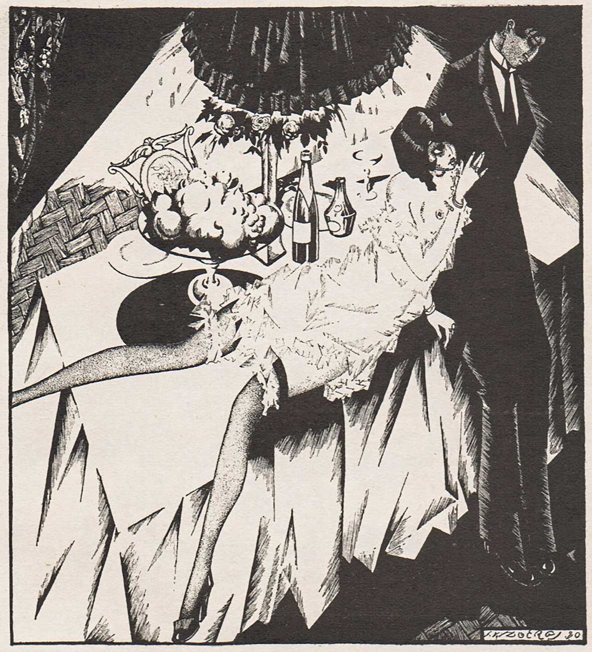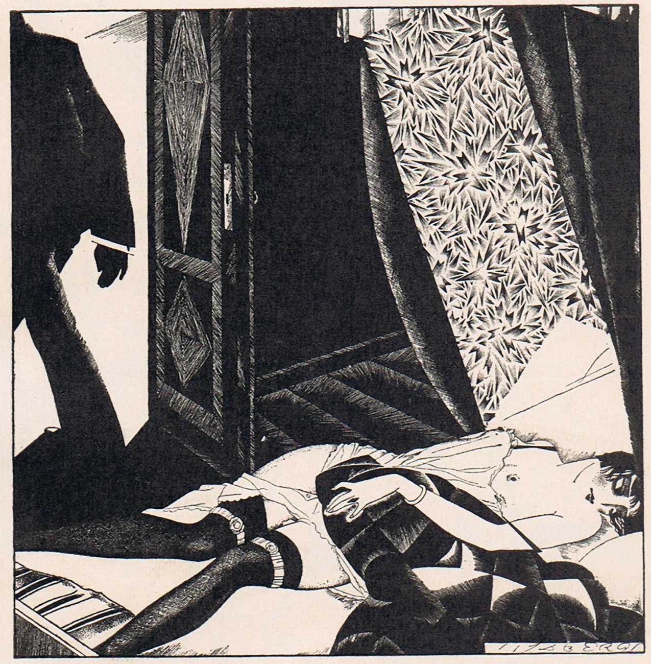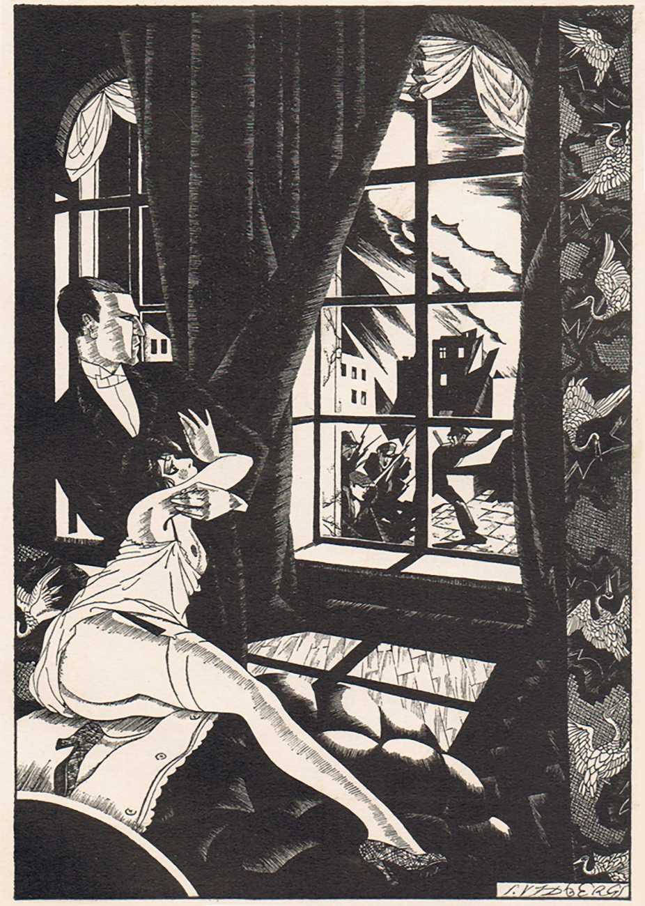 To modern eyes, and even compared with many of the erotic portfolios being produced in Berlin, Vienna and Paris during the late 1920s, Vidbergs’ Erotika is in truth not particularly erotic, more obliquely suggestive. The images tell us more about the nature of relationships at the time than about sensual intimacy, the juxtaposition of stockinged legs and lacy underwear with suspicious male(valent) lurking hinting at liaisons which were probably not very consensual.