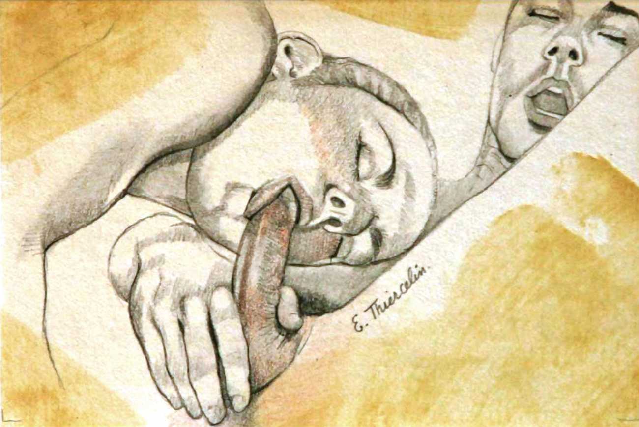 It would be interesting to know whether any of these drawings were made from life, as for example were Betty Dodson’s Cocks series; it is more likely that they were made from photographs. And did the artist have a particular penchant for drawing gay sex encounters, or were they made as a commission for purely financial reasons? Whatever their provenance, they are still fine artworks, leaving us wondering why more women artists do not imagine how men loving men might be depicted.