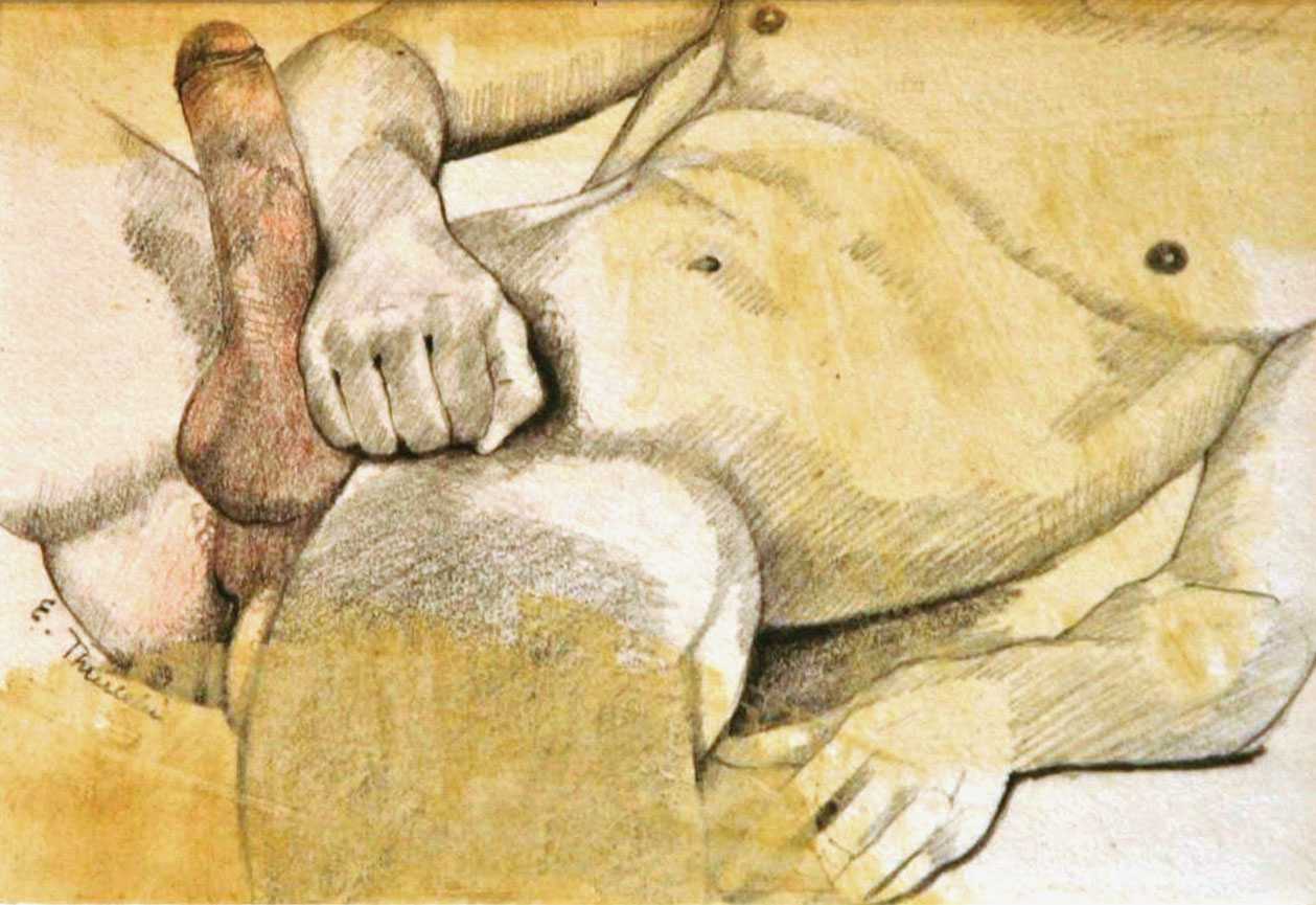 Given how often male artists have created imagined scenes of lesbian intimacy, it is remarkably rare for women to have reciprocated the favour and given us a portfolio of men enjoying the varieties of gay sex; only Leonor Fini’s drawings for Jean Genet’s La galère come to mind.