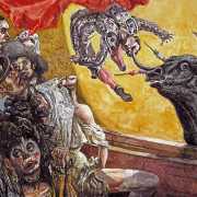 Georges Bataille’s erotic novella Histoire de l’oeil (Story of the Eye) was originally published in 1928, but it was not until the early 1940s that clandestine copies began to appear more widely; it was censored until the 1950s and appeared in English translation only in 1953. Narrated by an unnamed young man looking back on his sexual exploits, Histoire de l’oeil describes the perversions of a pair of teenage lovers. Simone is his primary female partner, but the narrative includes two important secondary figures, Marcelle, a mentally ill sixteen-year-old girl who comes to a sad end, and Lord Edmund, a voyeuristic English émigré aristocrat. Though often portrayed as pure pornography, interpretation of the story has gradually matured to reveal considerable philosophical and emotional depth, its imagery built upon a series of metaphors which in turn refer to philosophical constructs developed in Bataille’s wider work on the erotic, including the eye, the vagina, the anus, the testicle, the egg, the sun and the earth – conventionally uncomfortable connections which clearly resonated with Marcos Carrasquer when he was commissioned to illustrate the story.
