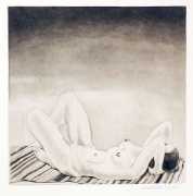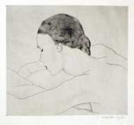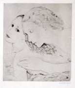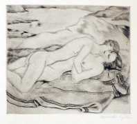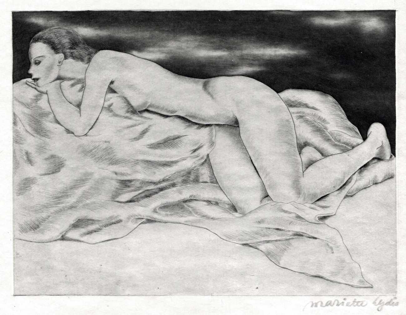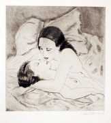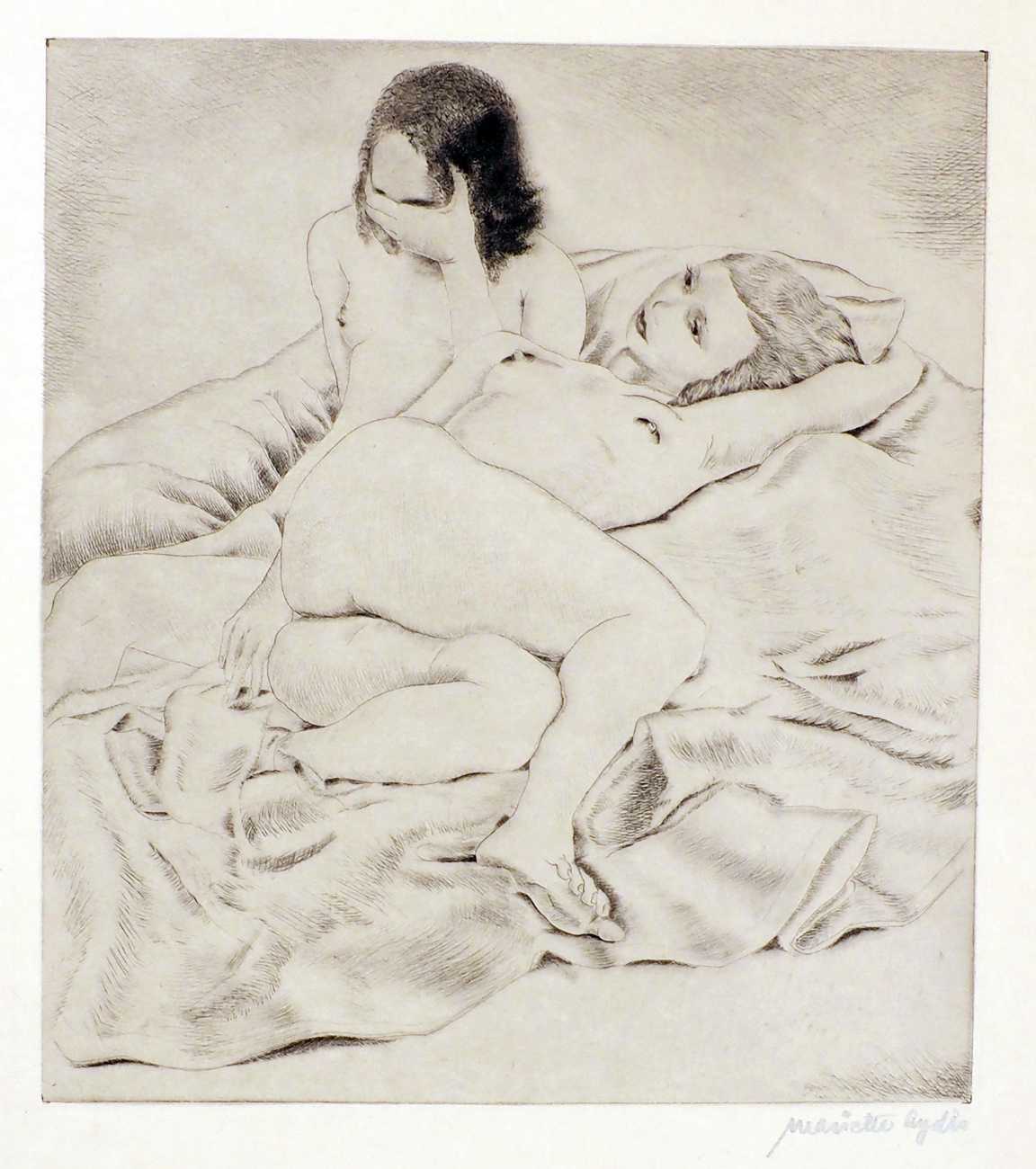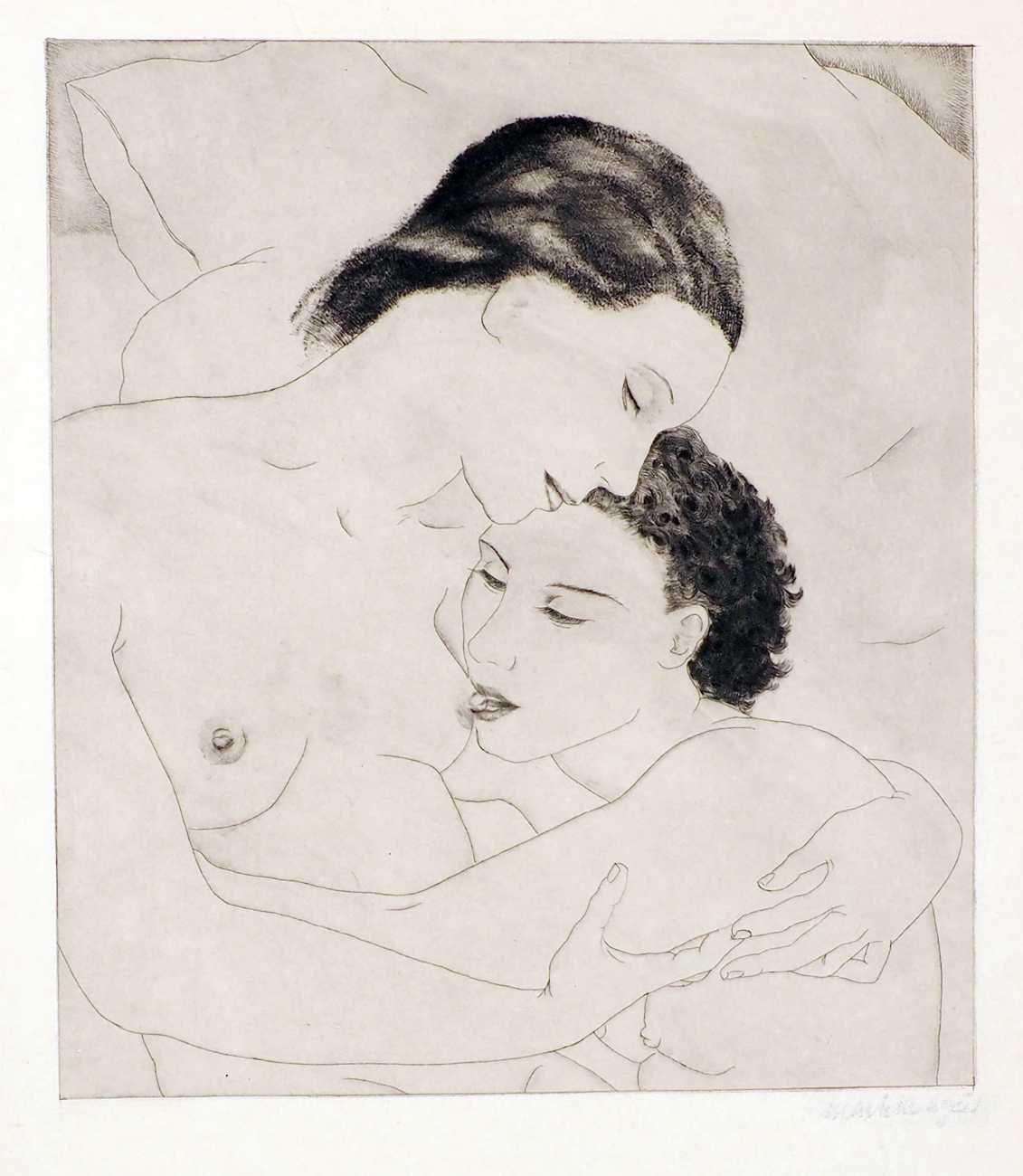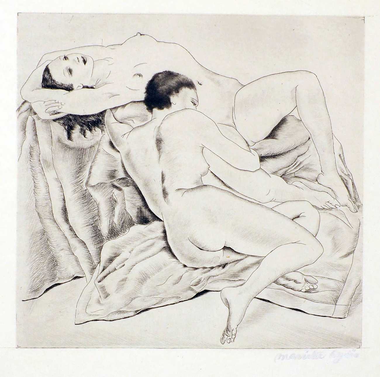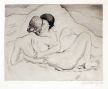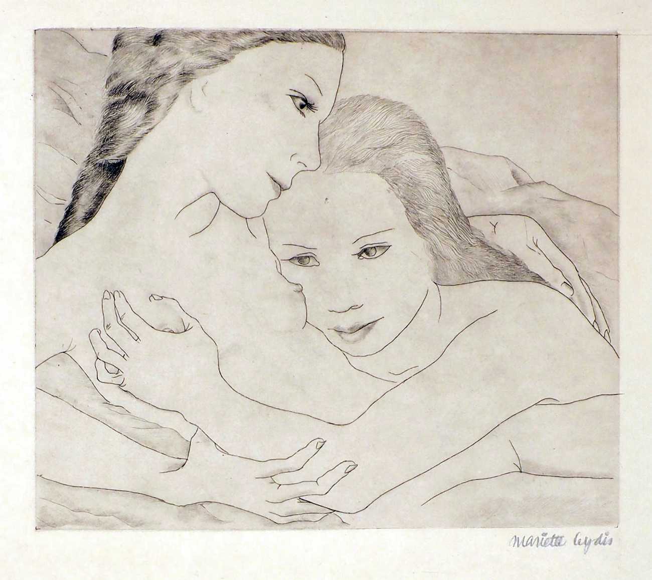Mariette Lydis’s second portfolio of lesbian engravings, Sappho, was published in 1933, ‘aux frais d’un groupe d’amateurs’ (at the expense of a group of amateur collectors). A more substantial production than Lesbiennes (which had a handwritten title on the cover), Sappho consists of fifteen monochrome prints depicting women lovers, presented in a red embossed folder; the number of copies produced limited to just forty-five, all the prints being signed in pencil by Lydis. As many of the sets of engravings have been separated over the years, complete portfolios of Sappho are now extremely rare.