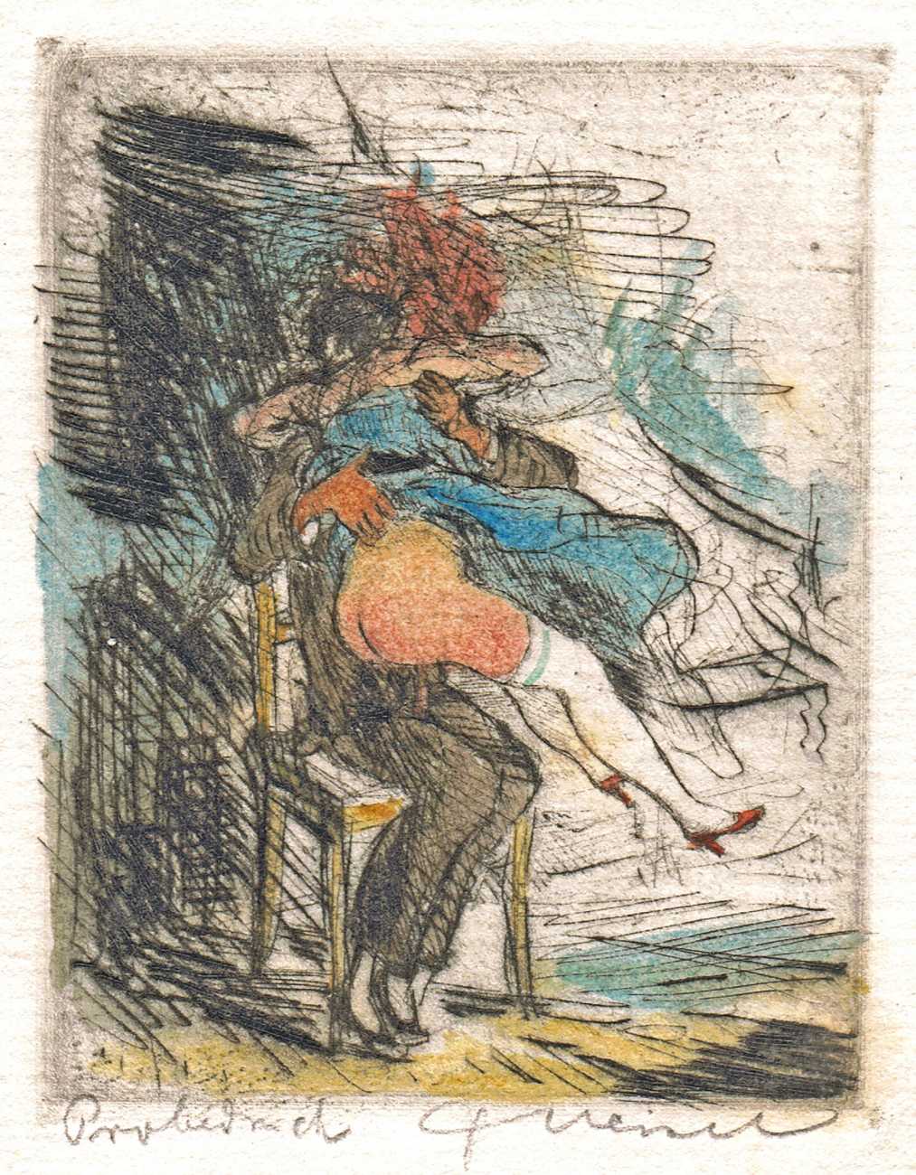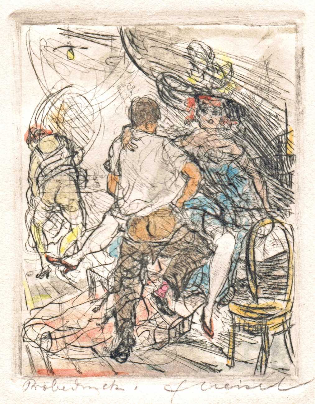 By far his best erotic etchings, however, are in this too-small portfolio of brothel scenes, Bordelle (Brothels). Not only are they erotic, they also show a free and imaginative use of colour and composition. Given that this set is signed as ‘Probedruck’ (test print) and no other copies are known, it may be that Bordelle was never actually published.