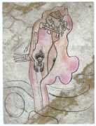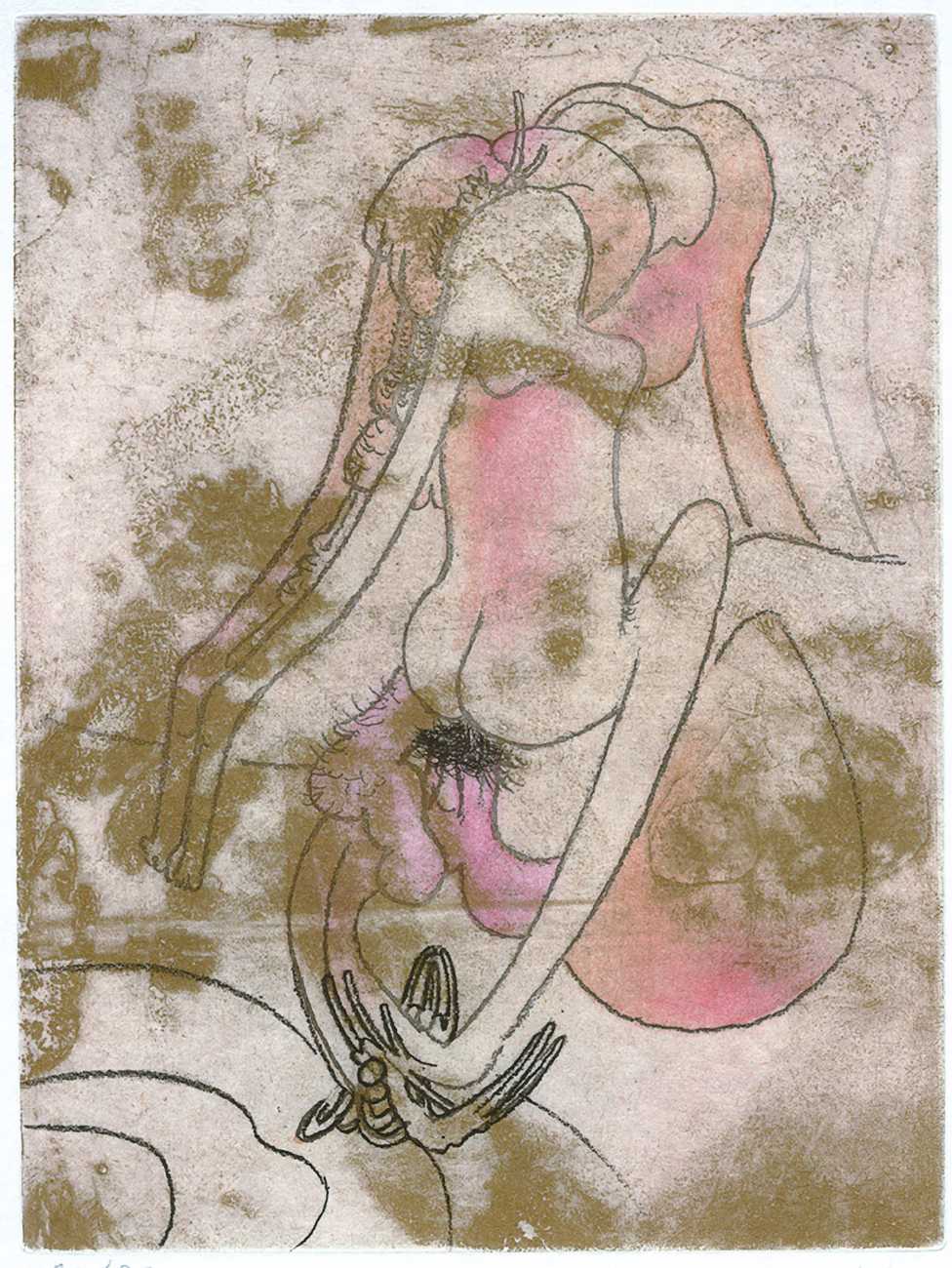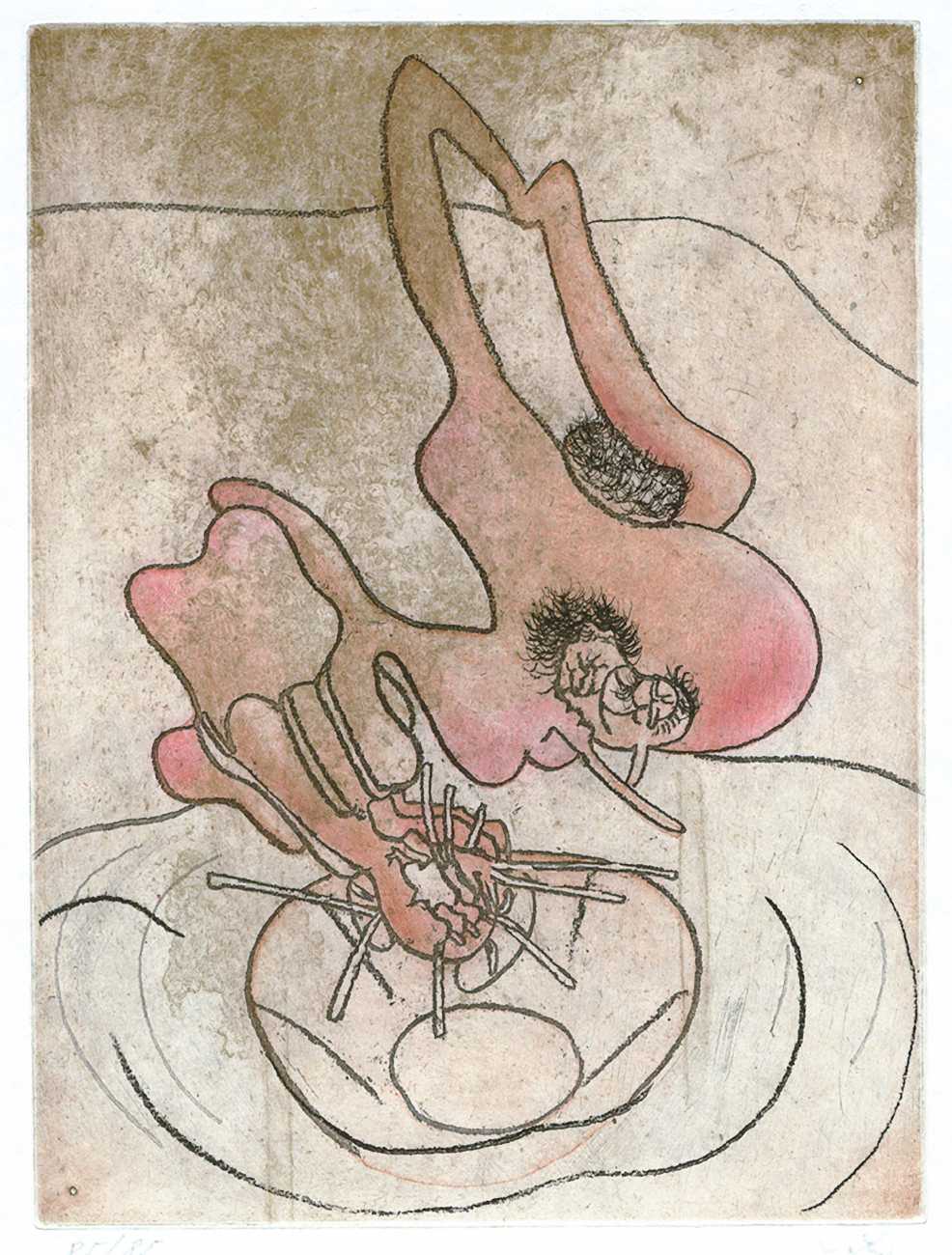 Matta’s curvaceous flesh-coloured forms writhe around each print, with clear suggestions of intertwined breasts and buttocks, genitals and body hair, but the connections between the parts are always ambiguous, predating the current debate around gender fluidity by half a century.
