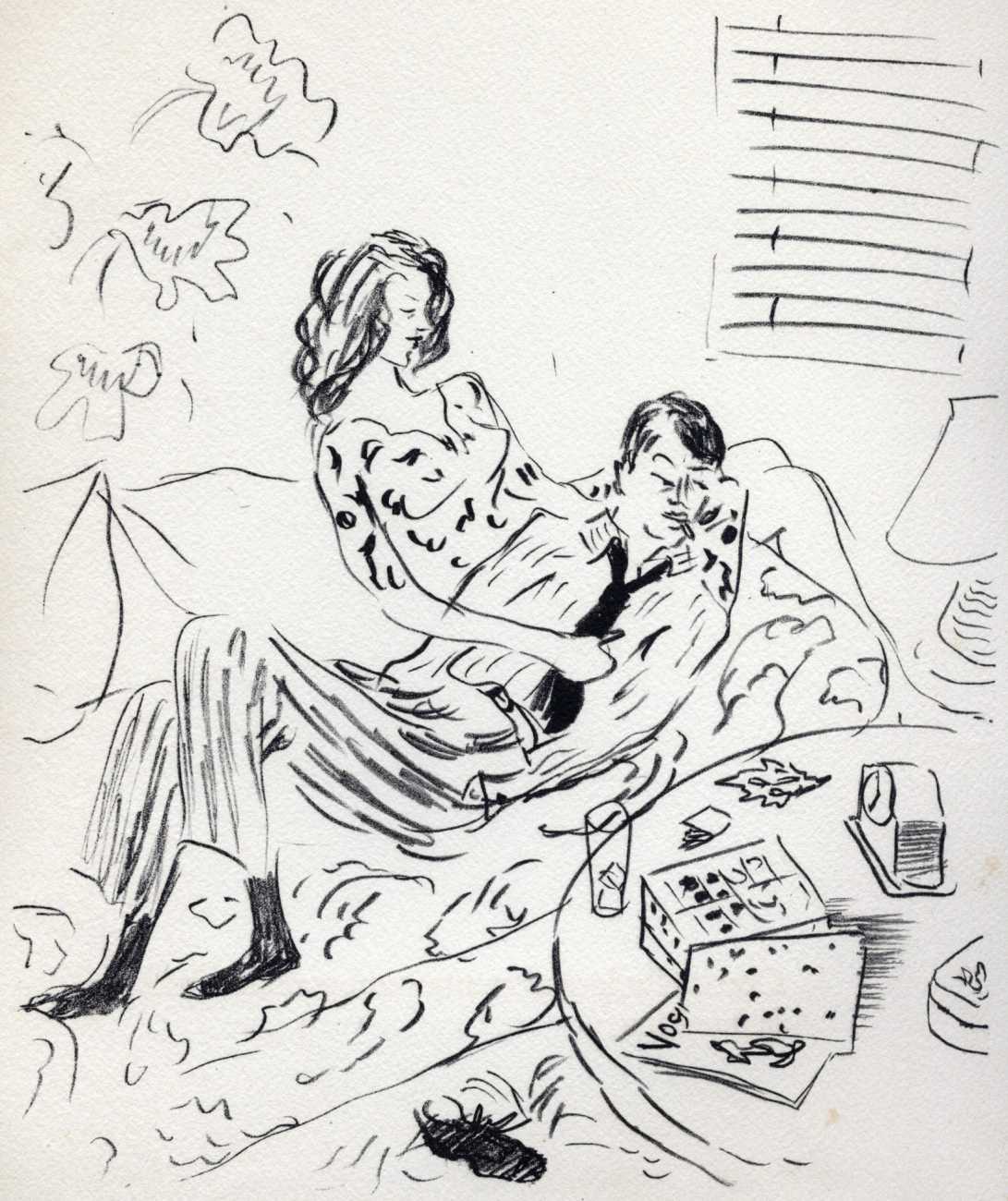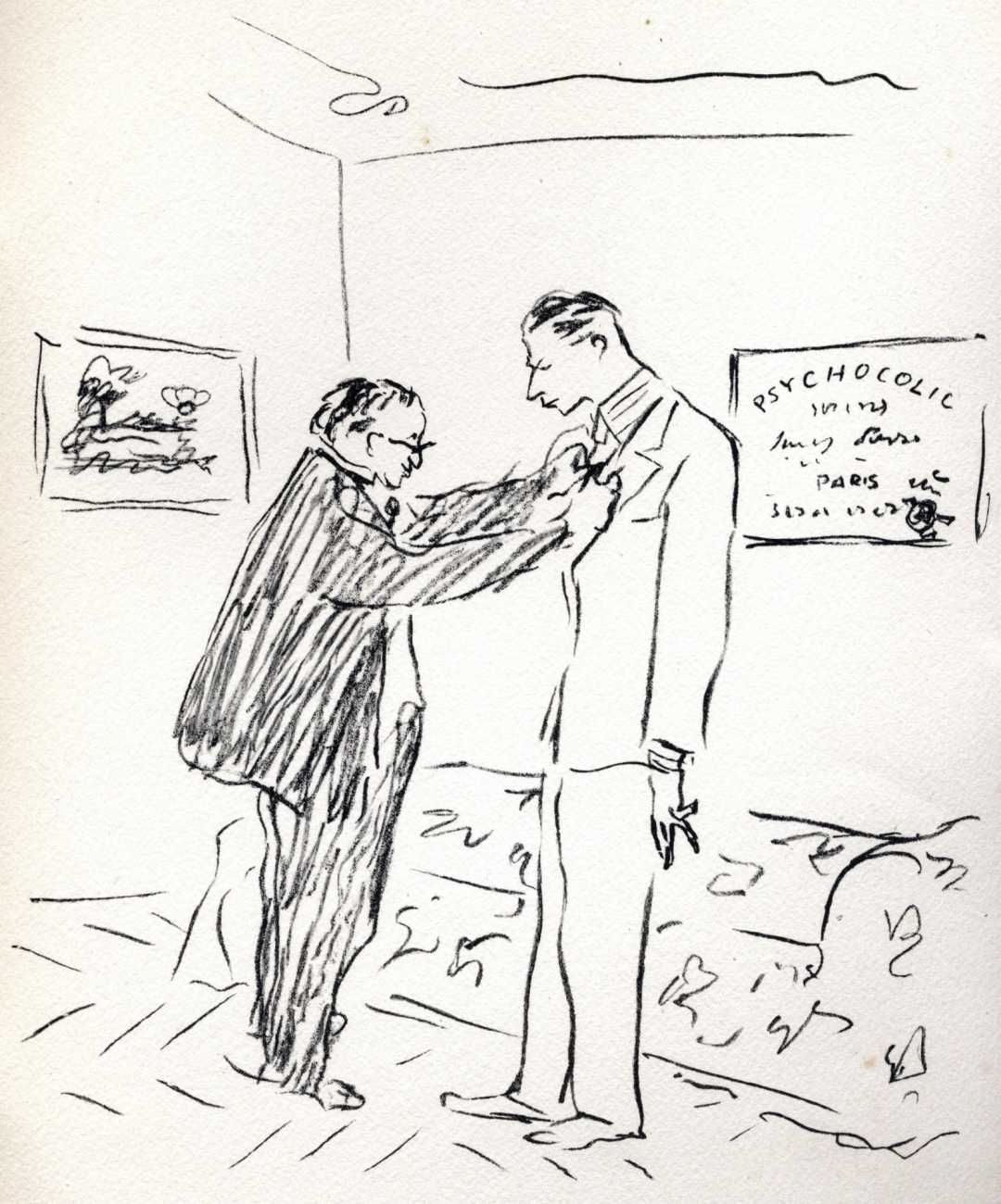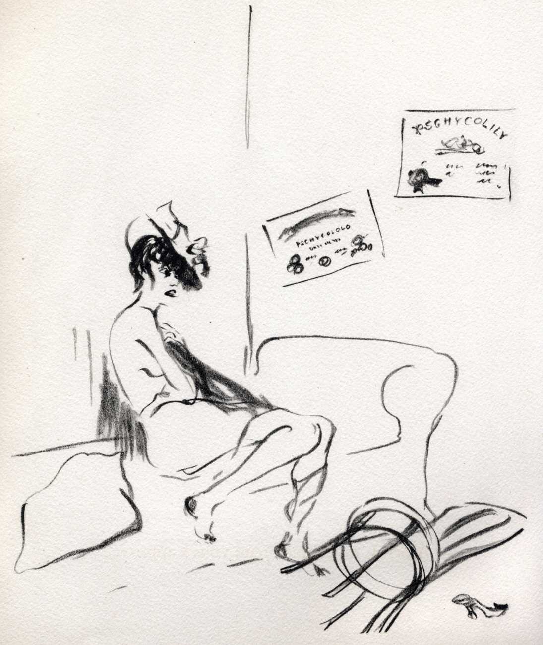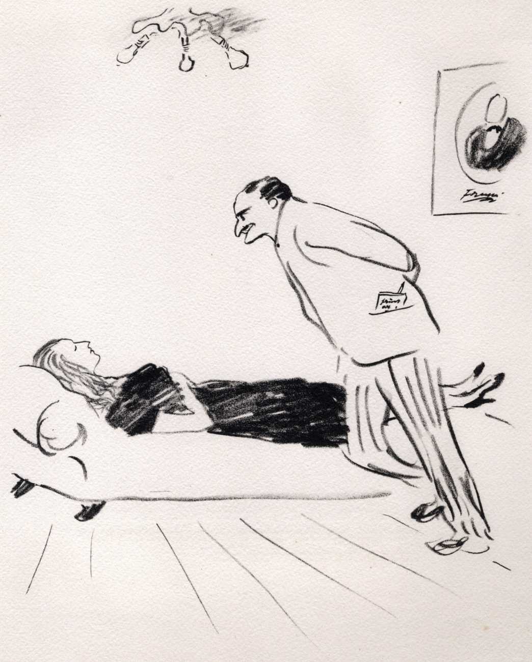 Like many people in the 1940s, Marcel Vertès was both fascinated and rather puzzled by the growing interest in psychotherapy, especially of the Freudian persuasion, among the professional classes. Complexes is his visual commentary on the phenomenon, featuring wise practitioners displaying their certificates and clients exhibiting their deepest anxieties – including the classic ‘what happened to my clothes’ scenario.