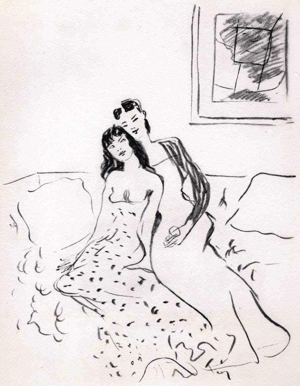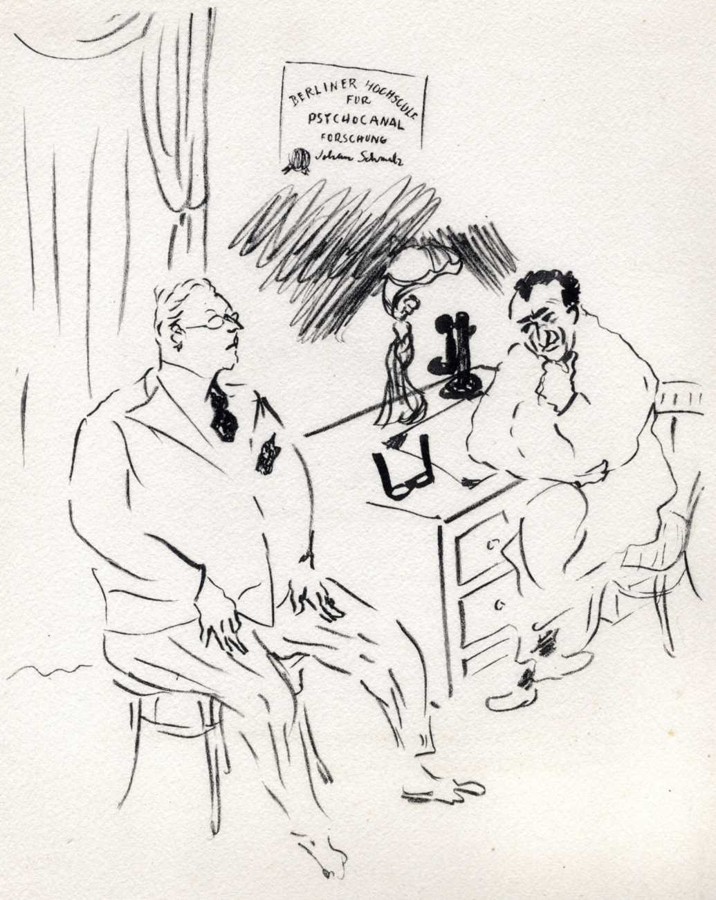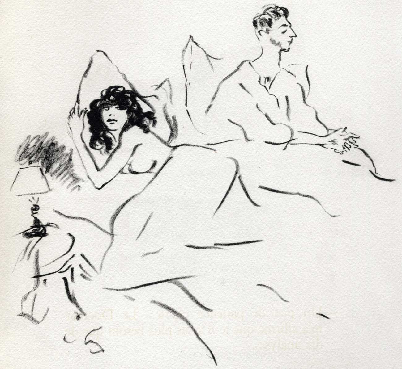 Like many people in the 1940s, Marcel Vertès was both fascinated and rather puzzled by the growing interest in psychotherapy, especially of the Freudian persuasion, among the professional classes. Complexes is his visual commentary on the phenomenon, featuring wise practitioners displaying their certificates and clients exhibiting their deepest anxieties – including the classic ‘what happened to my clothes’ scenario.