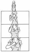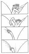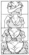 ‘Le vrai croyant’ (The True Believer) is a good example of the several hundred Cinéma vertical cartoon strips created by Barbe in the 1970s and 80s. A simple story, simply told, of a Jesus figure climbing from a young woman’s chained pendant and descending via her cleavage into her knickers. ‘OK, j’me fait Carmelite’ translates as ‘Okay, I’ll become a nun’.