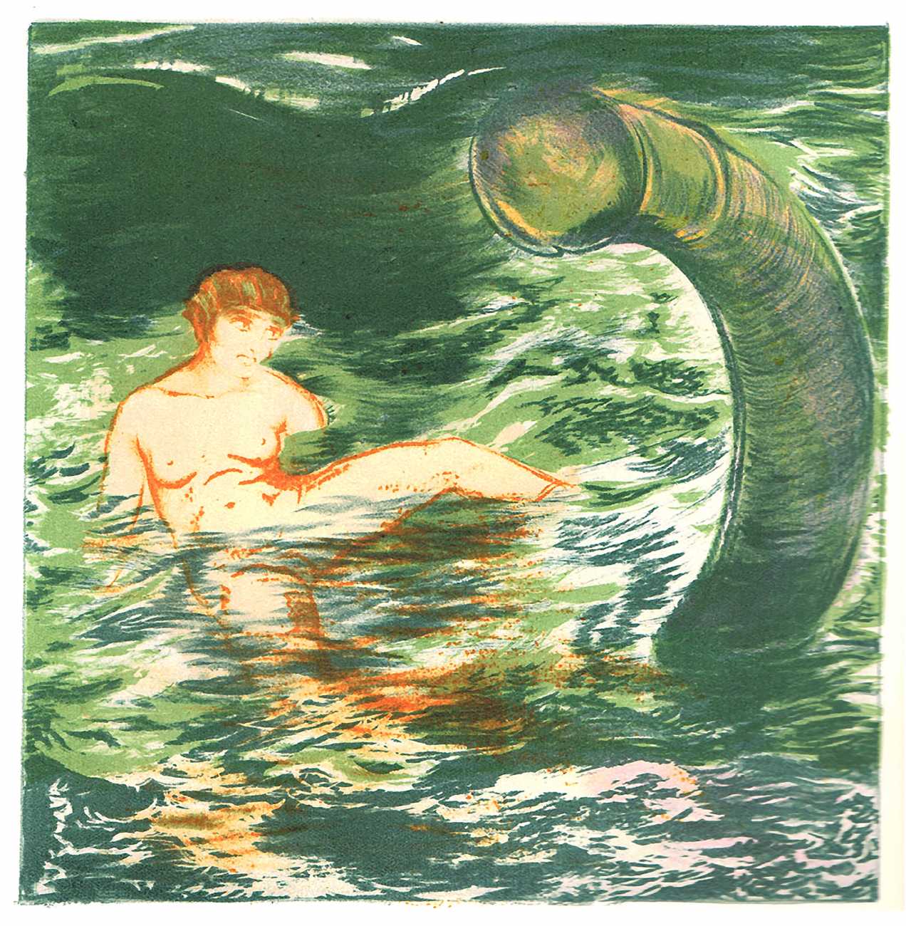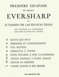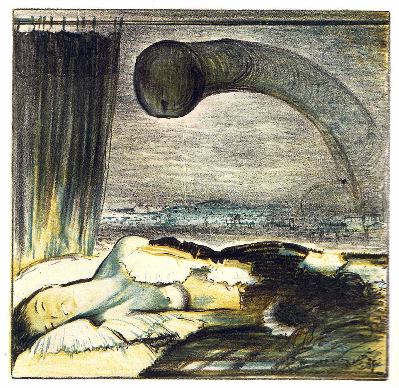 Première escapade du Prince Eversharp – there never was a deuxième – is a beautifully executed and witty portfolio of elephant-trunk-like penises frolicking their way through a lover’s dreams and nightmares. The obvious fact that the male members in question are exactly the opposite of sharp adds yet another dimension to the artist’s effort to confuse, and even the titles are carefully thought out, leading us to expect a more conventional treatment of the regularly-used titles.
