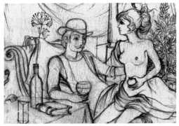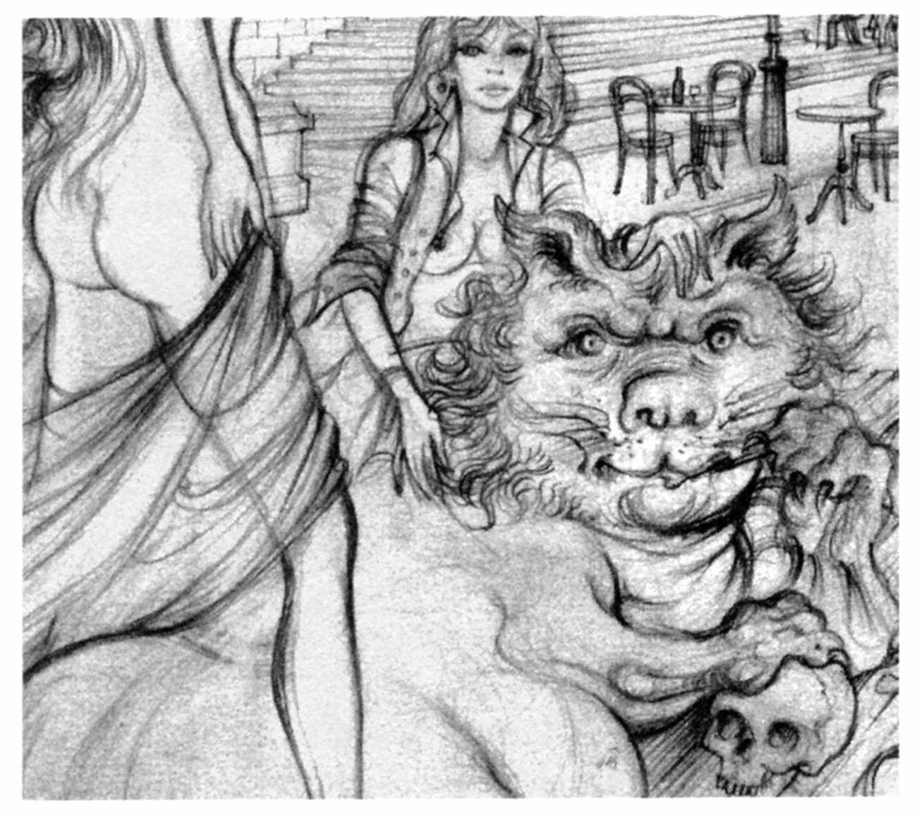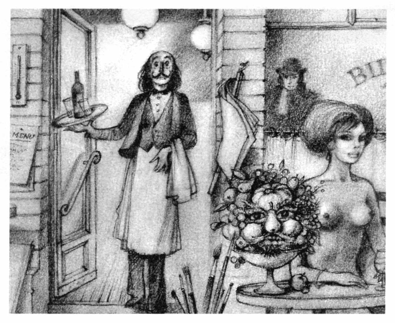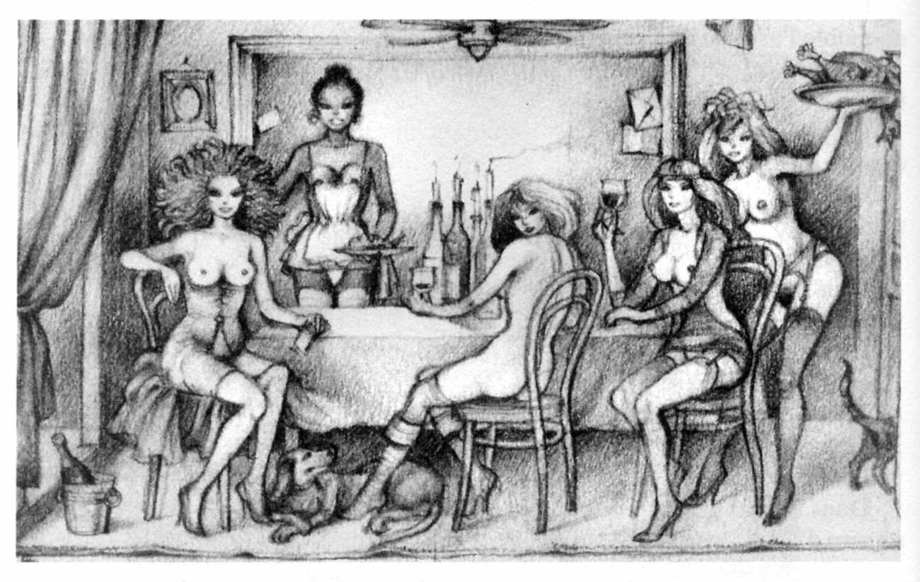 Alain Babel was great friends with the Geneva-based writer and journalist Gérald Lucas (1934–99), and when the publisher La Louve produced a collection of Lucas’s best short stories, originally published in Genève Home Information, each piece was illustrated with one of Babel’s drawings. As the introduction to Chroniques digestes et indigestes (Chronicles Digestible and Indigestible) says, ‘Gérald goes through life like a meteor, an incandescent and fantastic star, swallowing space with his bare teeth, lighting up the shadows, splashing his friends with his dazzling laughter. He makes fun of idiots, happily distributing punches in the mouths and kicks in the asses of the arrogant. This slayer of fools, sower of paradoxes and eccentric ideas, breaths the happiness of living, spreading joy around him. At the bottom of his heart lies the soul of an adventurer, a terrorist for good.’