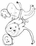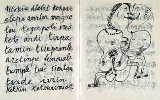 With La bonfam, Dubuffet took the concept to the extreme on several fronts. The handwritten text of the tiny 36-page booklet printed on tracing paper is in phonetic jargon, not instantly recognisable until spoken out loud, so that labonfam abeber par inbo nom becomes La bonne femme à Bébert, par un beau nom (Bebert’s Good Woman, by a Good Name). Dubuffet used this technique in some of his other writings of the time, deliberately forcing the reader not to make assumptions about the ‘correctness’ of language.