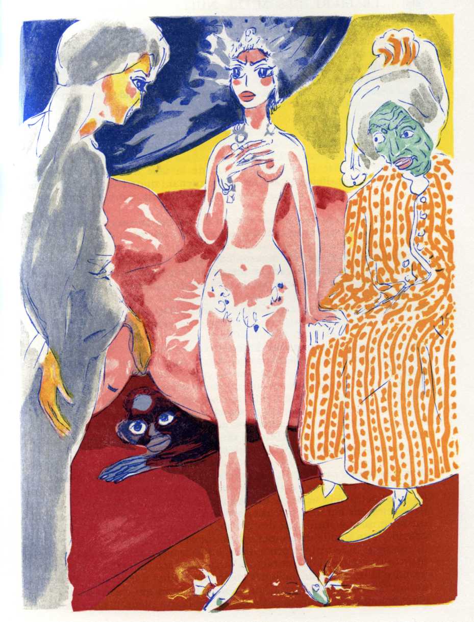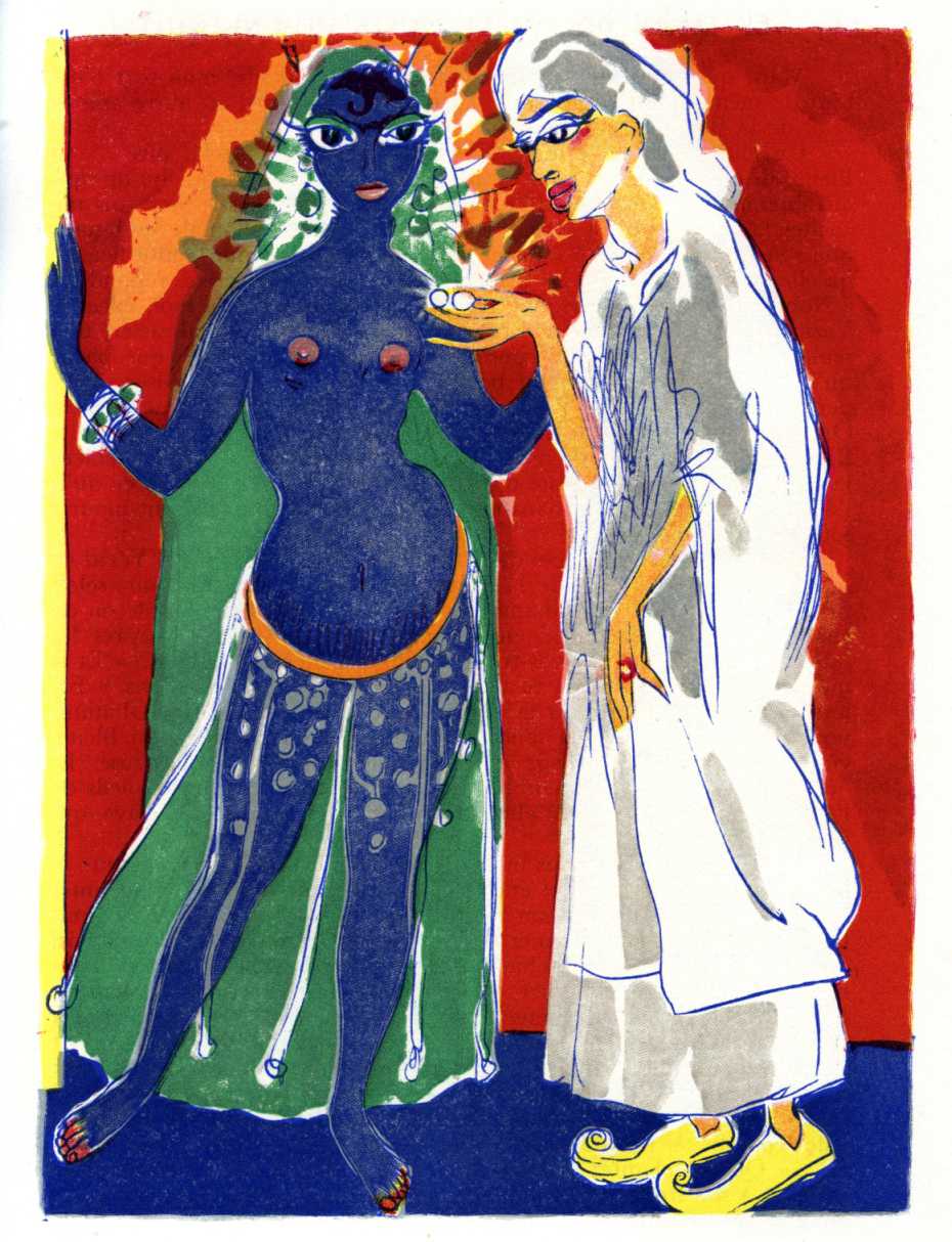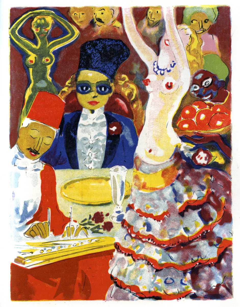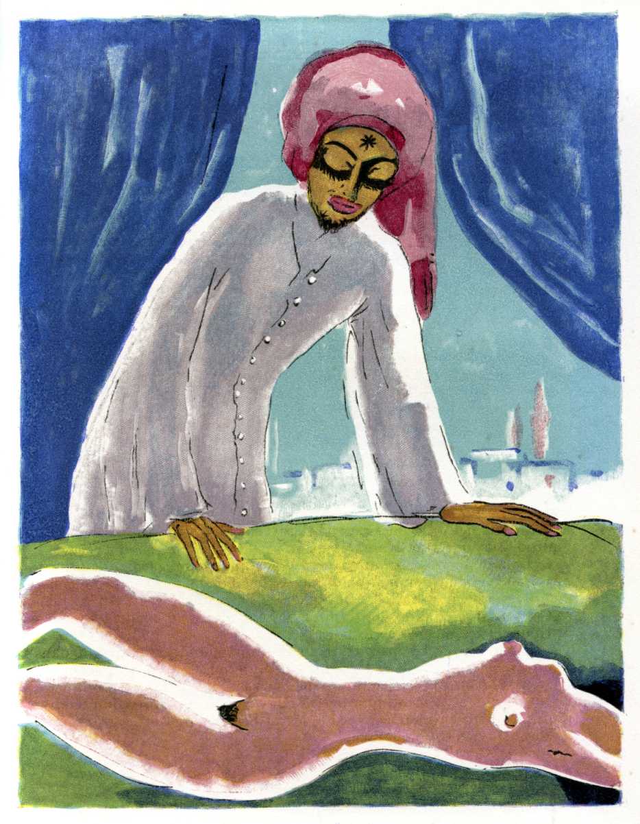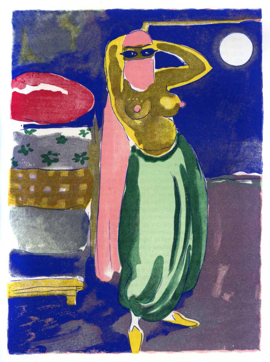 Kees van Dongen’s illustrations are as idiosyncratic as the text, displaying a colourful set of characters which too often verge on the stereotypical and potentially racist. But it is important to remember that they were produced seventy years ago, and at the time both his French readers and the inhabitants of the oriental places they wanted to visit pandered to that view of culture. Viewed through the lens of the intervening period, van Dongen’s colourful images are still full of vitality and imagination.