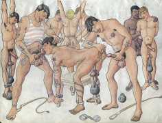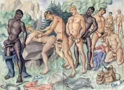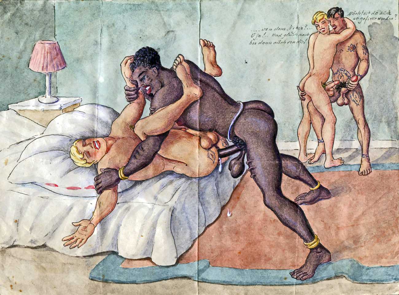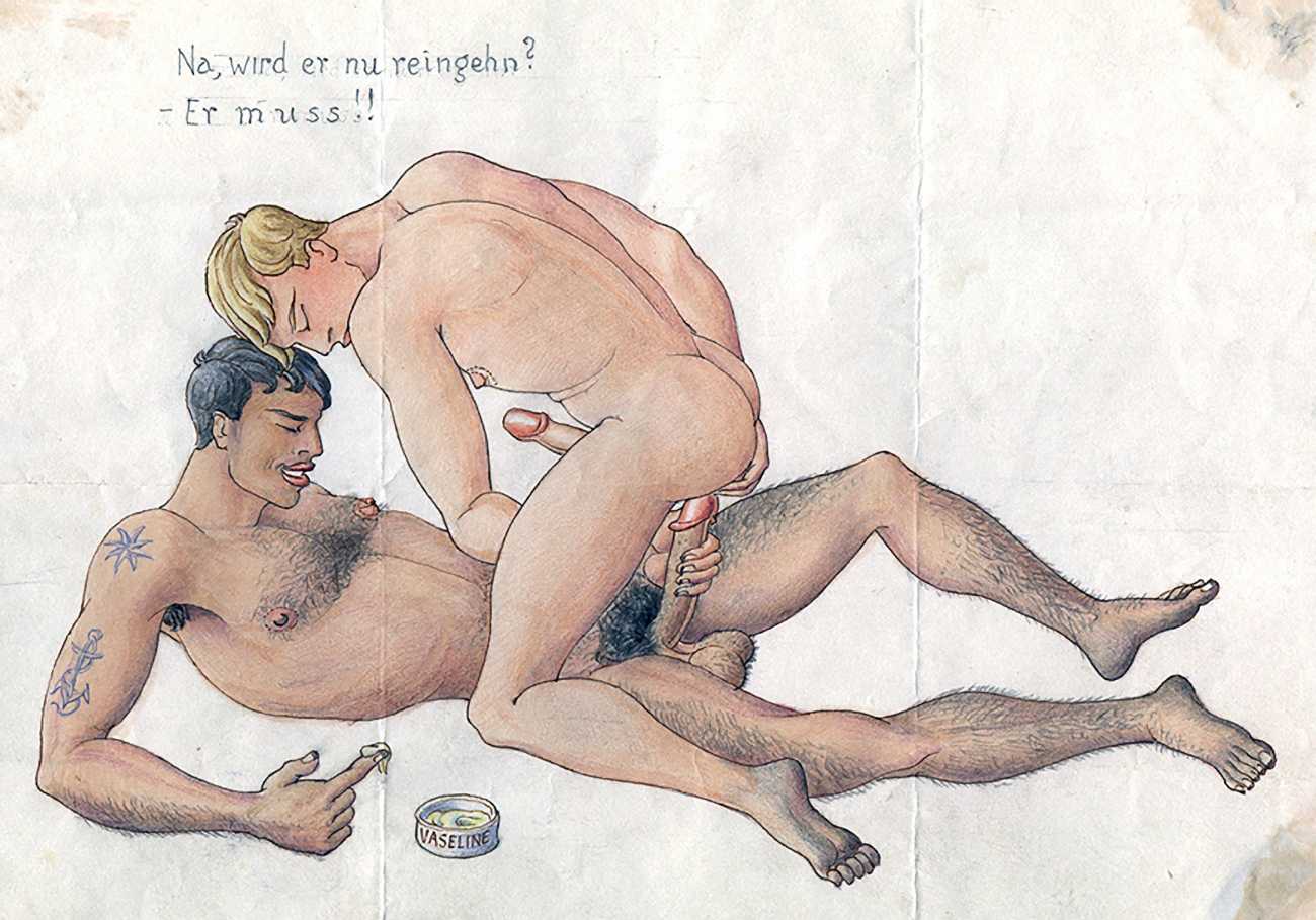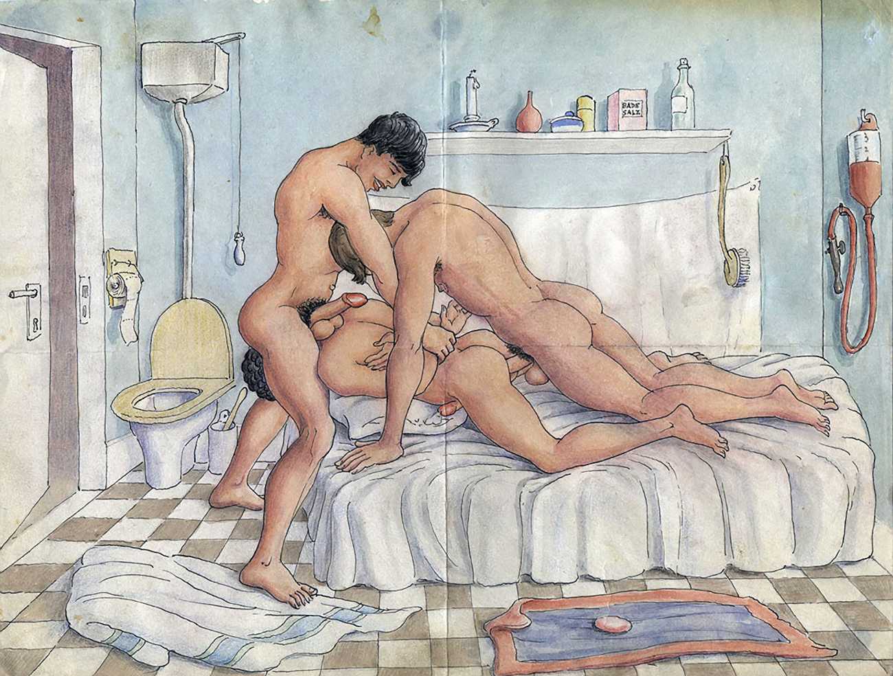 This enchanting handmade portfolio from the mid-1950s represents almost every gay man of the period’s fantasies, one-on-ones, orgies, multicoloured, you name it and it’s here. It has clearly been much-loved, saved, folded, put up with Blutack and taken down again; it’s rather a miracle that it has survived intact.