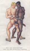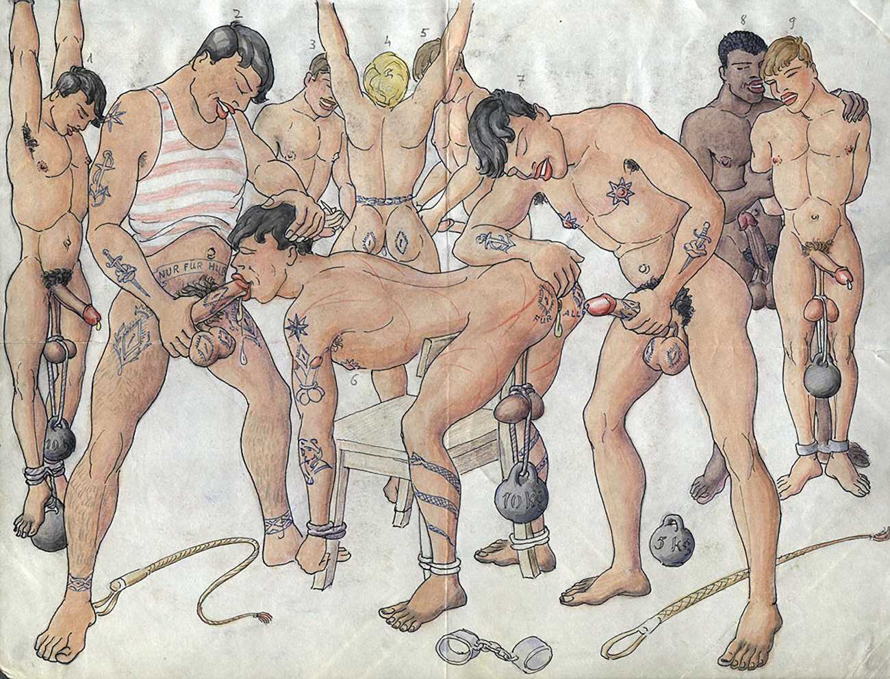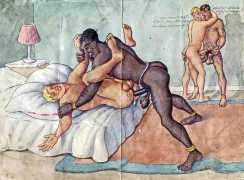 The quality of the drawing and colouring is of a high standard, so it’s likely that they were made by an art-trained hand. It is rather touching that in two of the orgy scenes the drawings’s owner has found it necessary to number the participants, presumably to make sure he was correct in his impression that quite so many men were involved.