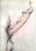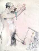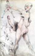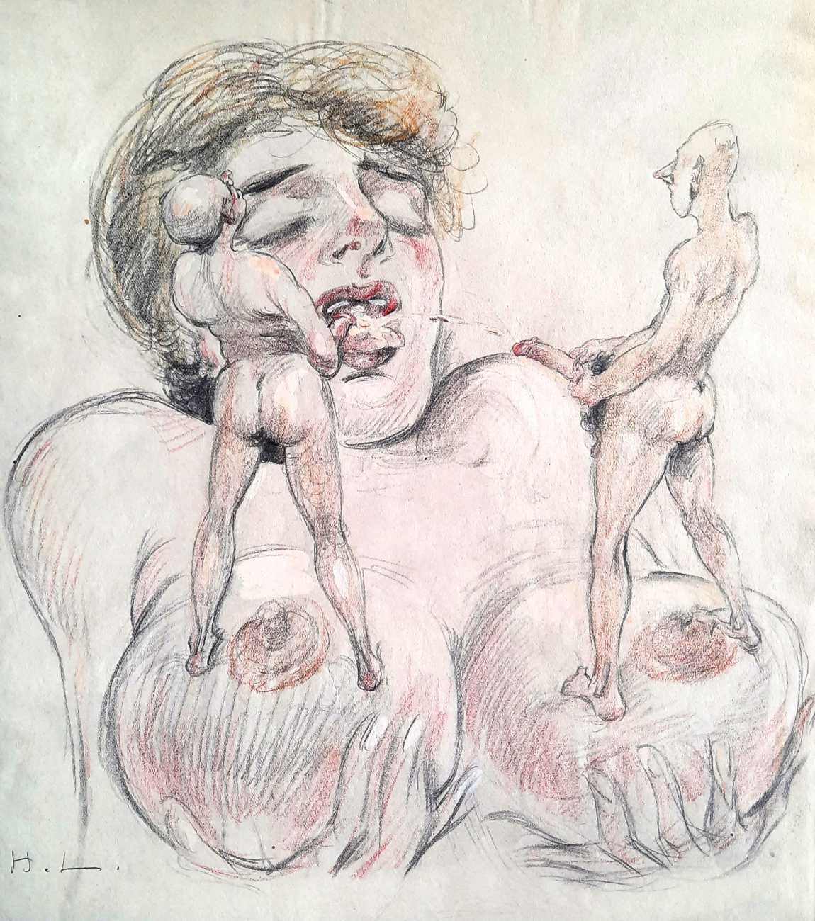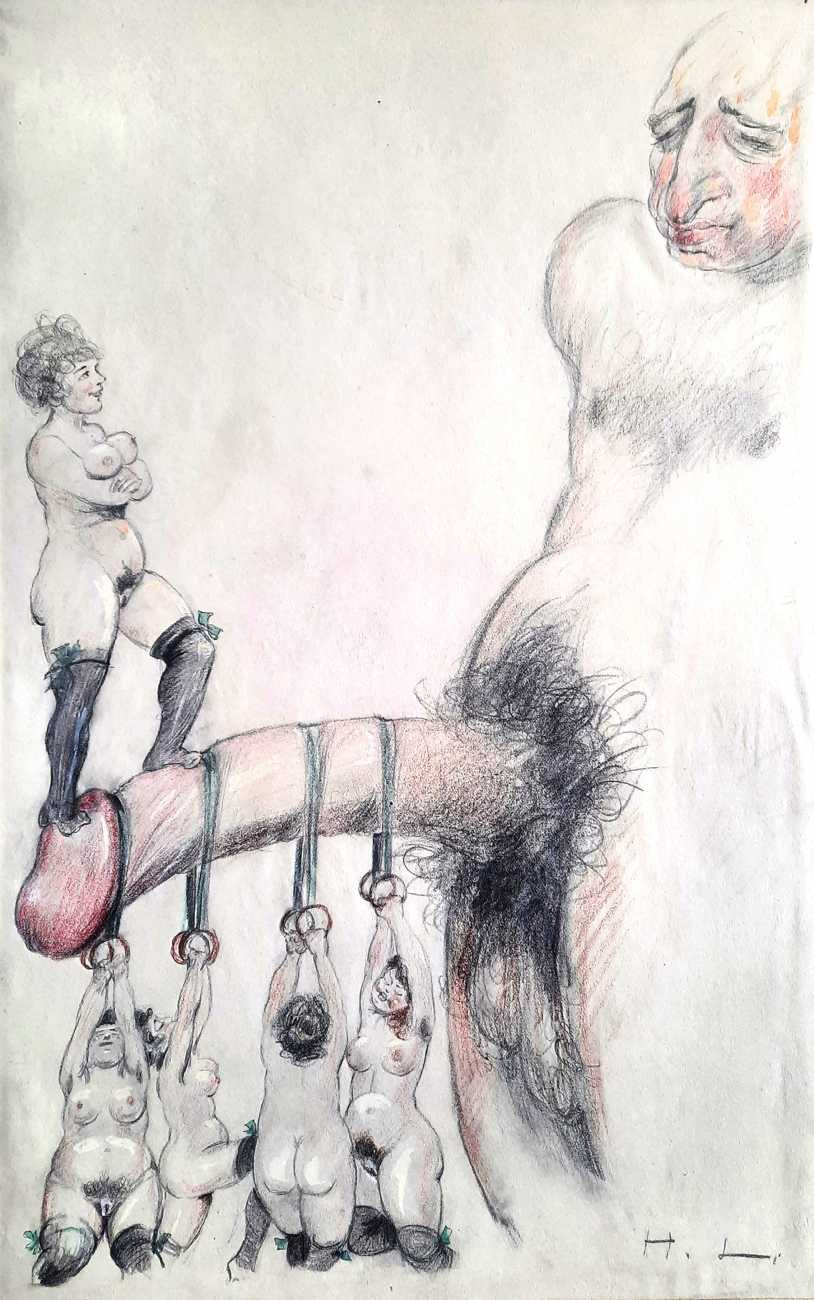 In April 2021 a portfolio of eighteen original drawings appeared in the catalogue of a Berlin auction house, drawings which bore such a resemblance to the Pipifax Erotische Grotesken that they had to be by the same hand; indeed one of them, the two men standing on a woman’s breasts and ejaculating into her mouth, was previously included in a set of Erotische Grotesken. Each of the drawings is initialled ‘HL’.