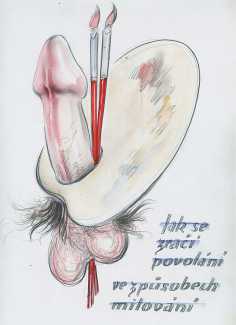 Lak se Zrači Povolání ve Způsobech Milování (The Artist Demonstrates Methods of Lovemaking) is a typical early Štika portfolio. He skilfully uses the stock characters from his advertising cartoon repertoire, adds humour and plenty of watercolour, and produces a set of ten drawings ‘je věnována výhradně jen autorovým přátelům’ (dedicated exclusively to the author’s friends).