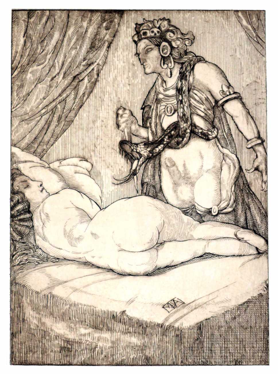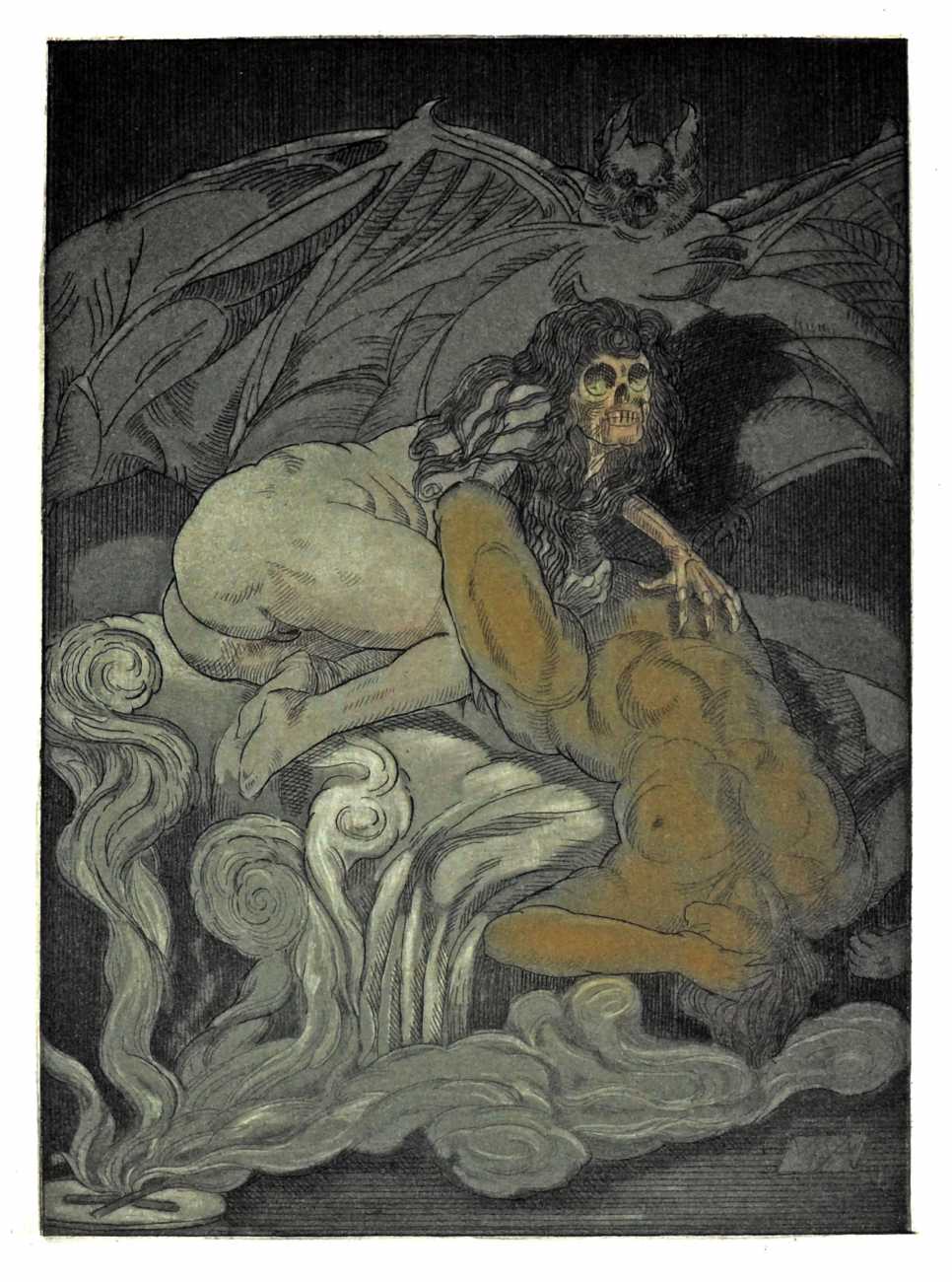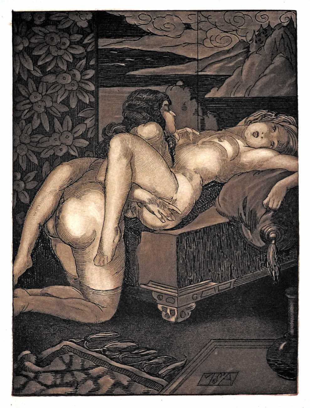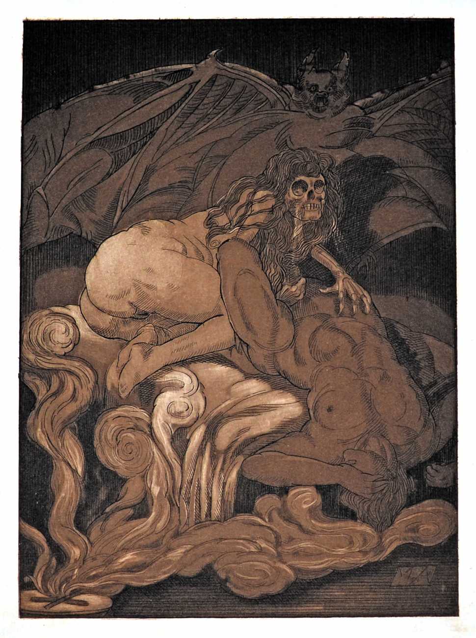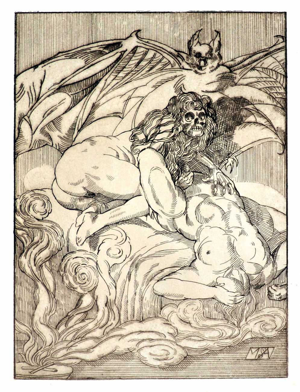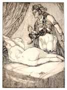 This made the Pièces condamnées particularly attractive to publishers of limited illustrated editions. The first portfolio specifically of Pièces condamnées images, by Jean Gabriel Daragnès, appeared in 1917 (you can see it here), to be followed five years later by de Becque’s interpretation. The de Becque Pièces condamnées was a very small edition, each of the six plates being produced in three states, one in sepia liner, one in black and sepia, and one in full colour; we have included all three states.