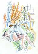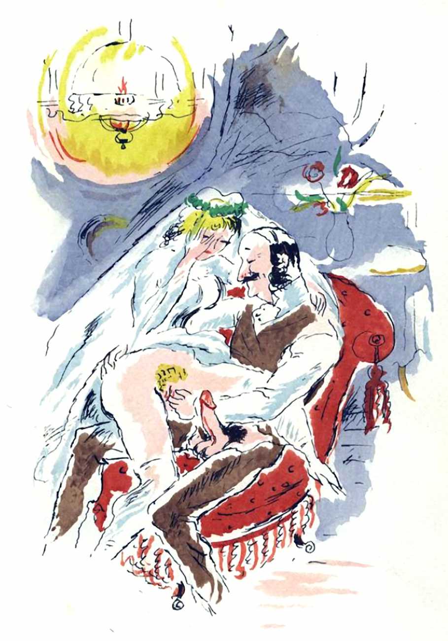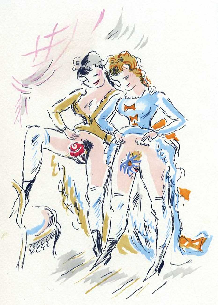 The 1880 edition was accompanied by a frontispiece from Félicien Rops, who also produced a much-admired standalone engraving based on the three women of Mannoury d’Ectot’s tale. Anras Szene/André Dugo illustrated the tale half a century later with some of the most explicit drawings to come from his stylish pen and brush. The enigmatic artist Fredillo also illustrated Les cousines de la colonelle, with seven plates made for an edition that was published by Brancart in Amsterdam in 1890.